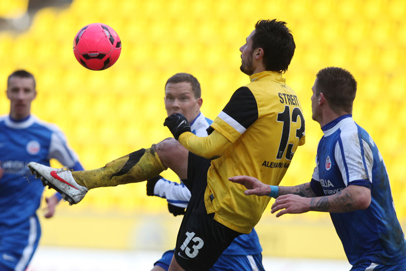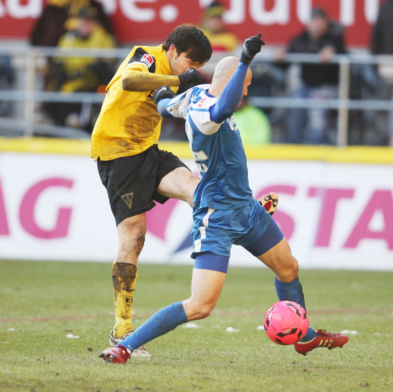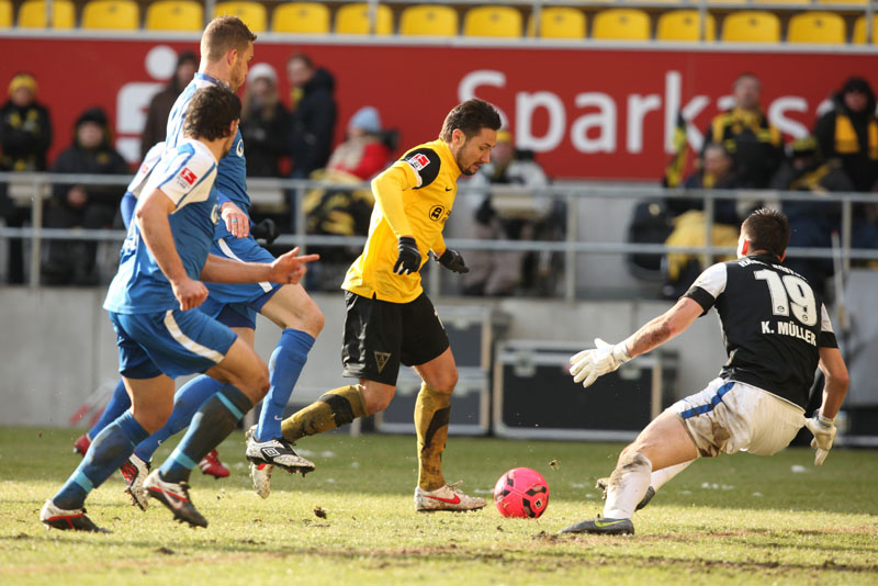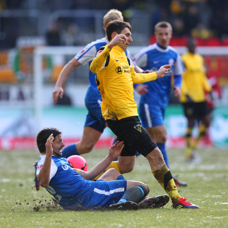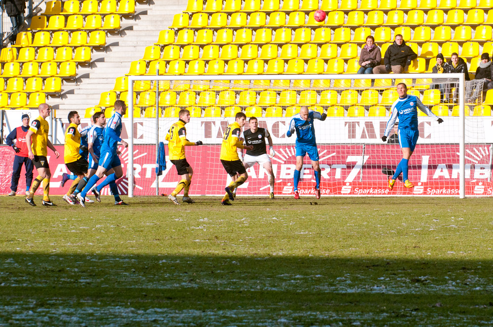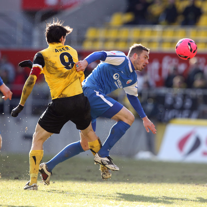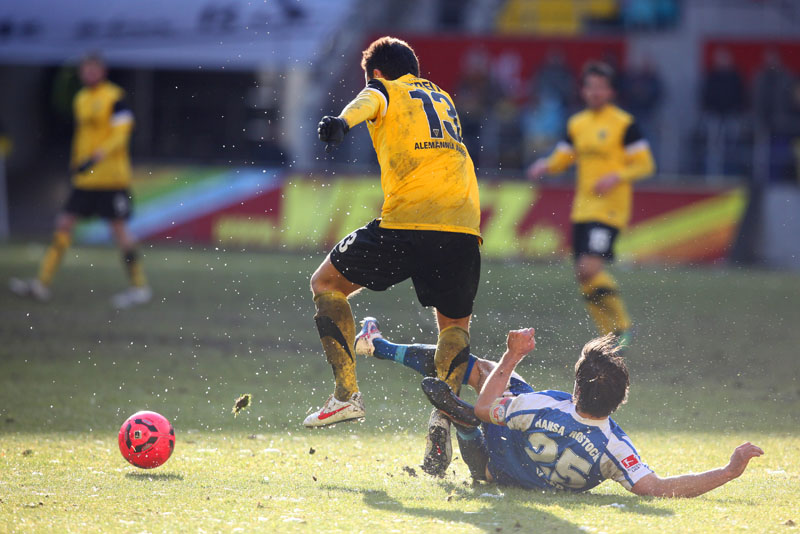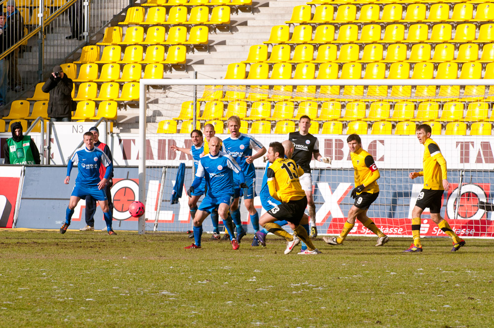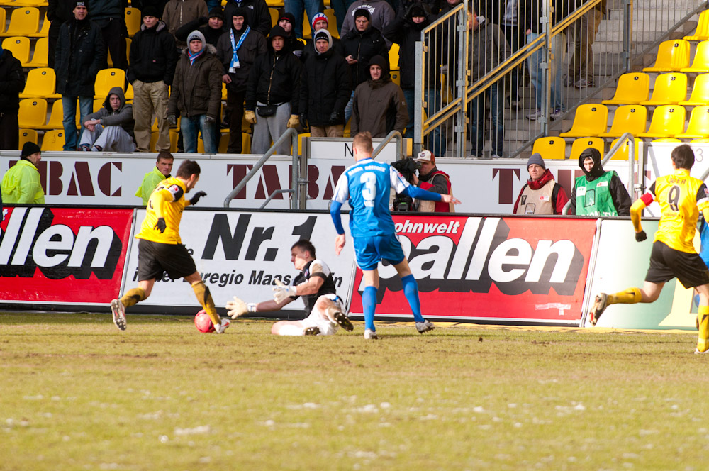 Die meisten der 14.178 Zuschauer am Tivoli hatten es bereits geahnt: Große Torchancen gab es bei diesen Platzbedingungen kaum. Es konnte daher nur über den Kampf gehen, den beide Teams allerdings annahmen und mit dem einen oder anderen harten Einsteigen gegen den Gegner nicht sparten. Vor der Pause dann große Aufregung bei den Schwarz-Gelben: Auer hatte plötzlich freie Bahn, ging an Hansas Keeper Müller vorbei und wurde von diesem gefällt. Eigentlich ein glasklarer Strafstoß mit einer möglichen Roten Karte obendrein. Doch Schiedsrichter Wingenbach gab weder das eine noch das andere – eine Fehlentscheidung (41.). Radus Kopfball, der nur knapp am Kasten vorbei ging, blieb vor lauter Protest fast schon unbemerkt. Mit dem 0:0 ging es kurz darauf in die Pause.