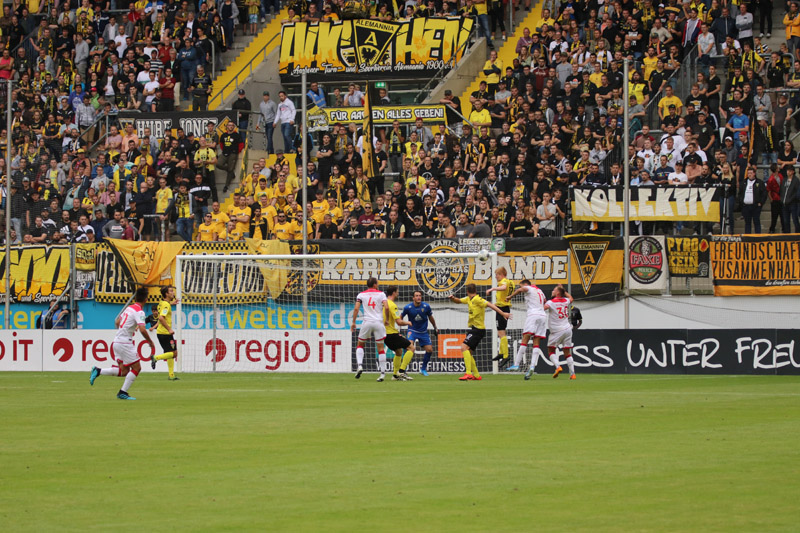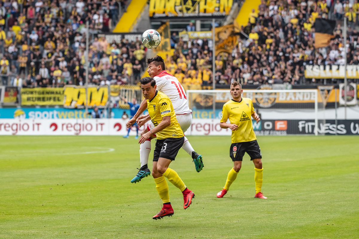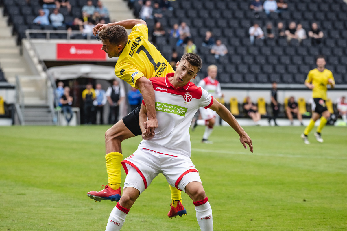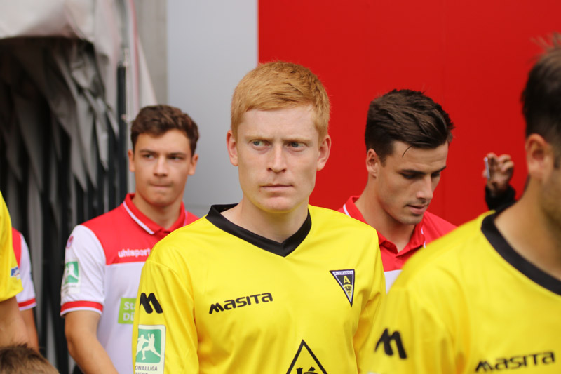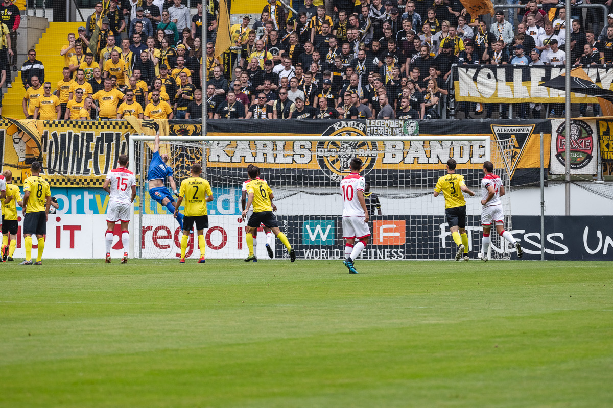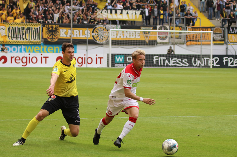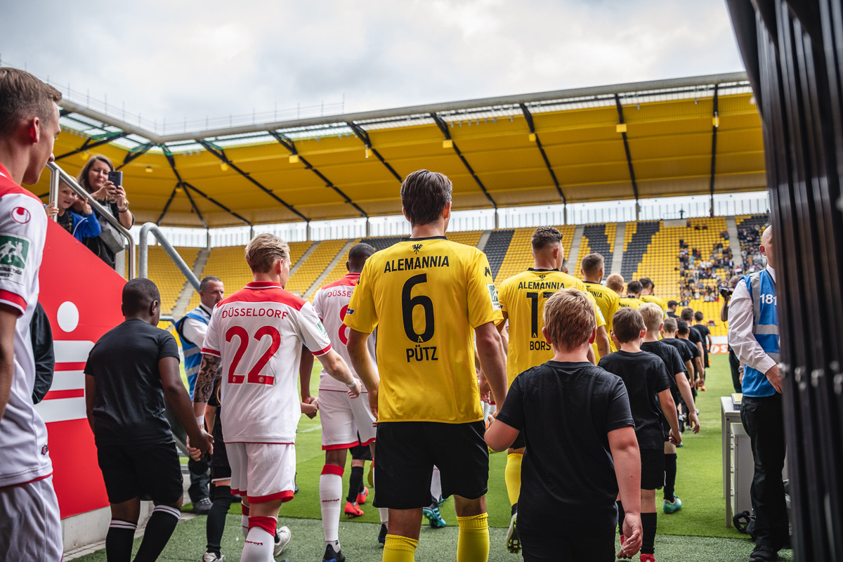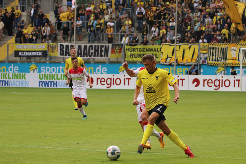 Bei der Alemannia gab es nach der Auftaktniederlage in Wuppertal zwei Änderungen in der Startformation. Florian Rüter und David Bors ersetzten Sebastian Schmitt und Gary Noel. Bereits in der zweiten Minute hatten die Schwarz-Gelben die frühe Führung auf dem Fuß. Wallenborn spielte Bors von der linken Seite frei, der aus sieben Metern aber am stark reagierenden Fortuna-Keeper Theißen scheiterte. Danach versuchten es die Gäste mal mit ein paar unpräzisen Schüssen aus der zweiten Reihe, bei denen Alemannia-Schlussmann Cymer seine Handschuhe nicht auspacken musste. Zum Ende der ansonsten chancenarmen ersten Hälfte nahm die Partie nochmal Fahrt auf. Nach einem Düsseldorfer Ballverlust landete die Kugel vor den Füßen von Bors, der nicht lange fackelte und aus 18 Metern draufhielt. Es fehlen Zentimeter zur Führung - die Kugel streifte die Querlatte (37.). Zwei Minuten später konnte Theißen einen Freistoß von Glowacz parieren. Torlos wurden die Seiten getauscht.