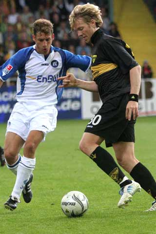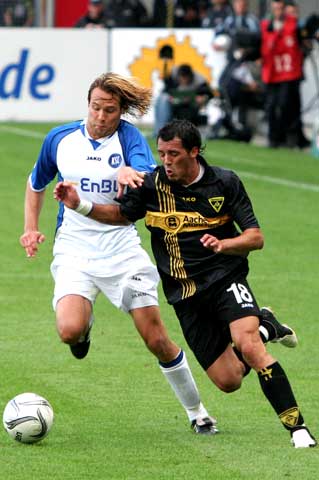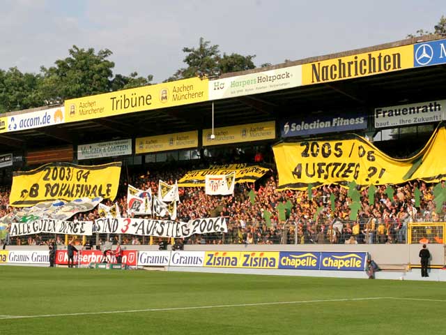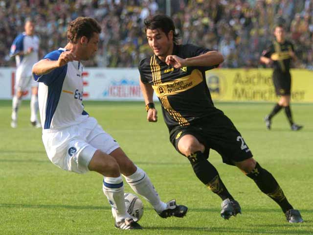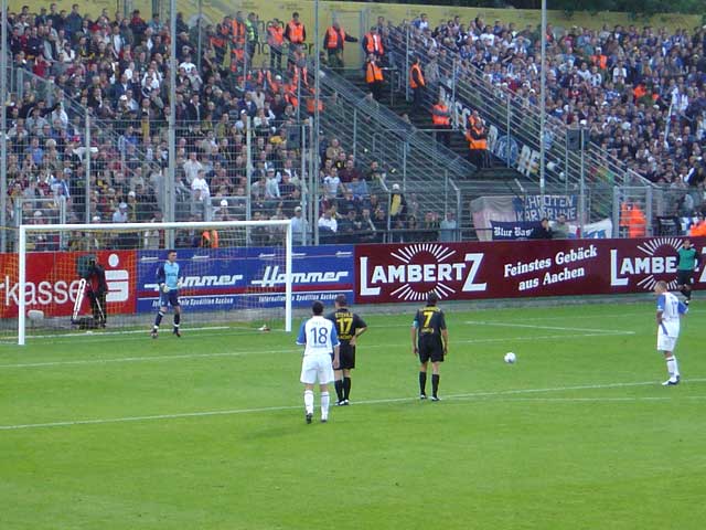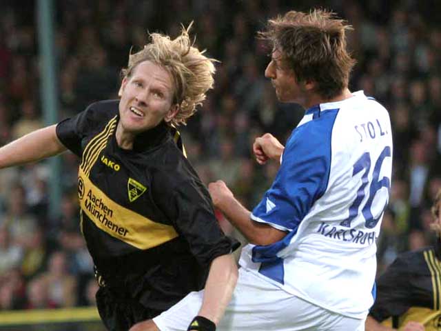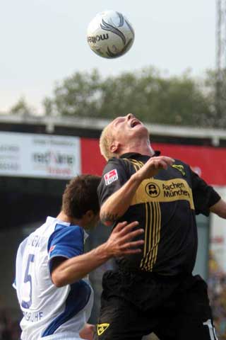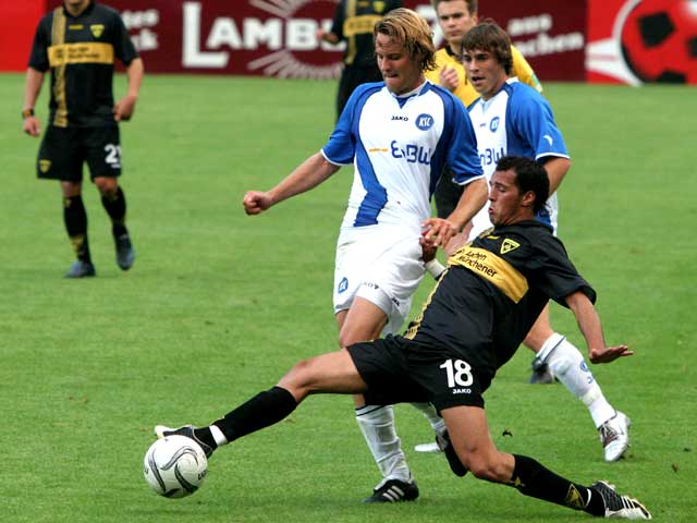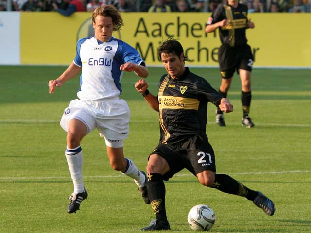 Nach dem schwachen Auftakt am Montag in Aue zeigte die Alemannia gegen den KSC ein völlig anderes Gesicht. Von Beginn an waren die Gastgeber präsent. Sascha Rösler, der die Position hinter den Spitzen bekleidete, eröffnete in der 12. Minute eine Serie von Chancen in der ersten Halbzeit, die aber allesamt ungenutzt blieben. Nur eine Minute später scheiterte Marius Ebbers mit einer Doppel-Chance an KSC-Keeper Miller. In der 17. Minute senkte sich ein abgefälschter Freistoß von Sergio Pinto auf die Querlatte.