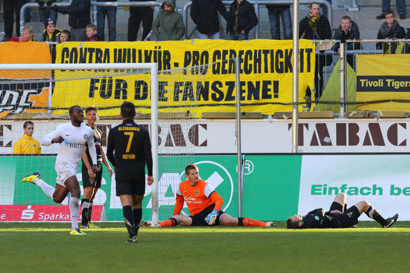 Kurz darauf begann die Schlussoffensive der Hausherren. Die Jungs vom Tivoli versuchten weiterhin, den Ausgleich zu erzielen, was ihnen dann auch verdientermaßen gelang. Weil die Gäste die Kugel nicht aus dem Strafraum klären konnten, war Schwertfeger zu Stelle und verwandelte stark zum 1:1 (81.). Nun witterten die Schwarz-Gelben ihre Chance, auf der Zielgeraden doch noch die volle Punktzahl zu erreichen. Nach einer Flanke von Weber köpfte Pozder einen Meter über das gegnerische Gehäuse (86.). Der Angreifer verletzte sich allerdings bei seiner Aktion und musste ausgewechselt sowie später ins Krankenhaus gebracht werden. Für ihn kam Freddy Borg in die Partie. Auch die letzte Chance der Schwarz-Gelben blieb erfolglos. Ein Schuss von Streit konnte zunächst von Gästekeeper Gurski abgeweht werden, dann grätschte Borg im Nachsetzen vorbei (90.). So trennten sich die beiden Teams mit einem Endstand von 1:1 voneinander, was unter dem Strich ein gerechtes Ergebnis war.