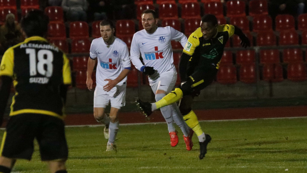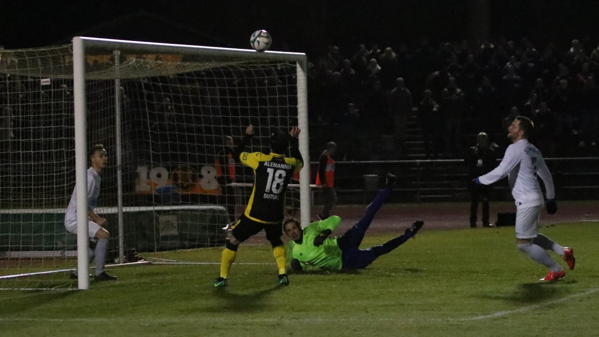 Fuat Kilic hatte erwartungsgemäß etwas rotiert und nur fünf Spieler aufgeboten, die auch am Samstag gegen die U21 des 1. FC Köln im Einsatz waren. Maurice Pluntke führte die Elf als Kapitän auf das Feld. Für den Gastgeber aus dem Fußballkreis Sieg war das Match sicherlich ein Highlight in der 80-jährigen Vereinsgeschichte. Rund 800 Zuschauer, davon die Hälfte aus Aachen, wohnten dem Duell David gegen Goliath bei. Früh verlagerte sich das Geschehen in eine Richtung. Die erste Ecke des Spiels durch Kühnel fand den Kopf von Fiedler, doch SVB-Keeper Huth parierte glänzend (5.). Nach einer Viertelstunde zog Plunkte aus der Distanz ab, Huth konnte das Leder nicht festhalten, dafür aber den Nachschuss von Nebi noch entschärfen. Die anschließende Kühnel-Ecke brachte den Regionalligisten dann doch in Front. Wieder stieg Fiedler zum Kopfball und diesmal hatte der Bergheimer Schlussmann bei dem wuchtigen Versuch keine Abwehrchance – 0:1 (16.). Dieses Ergebnis hielt bis zum Seitenwechsel Bestand, weil den Alemannen trotz weiterer Ecken und Einschussmöglichkeiten kein weiterer Treffer mehr gelingen wollte.