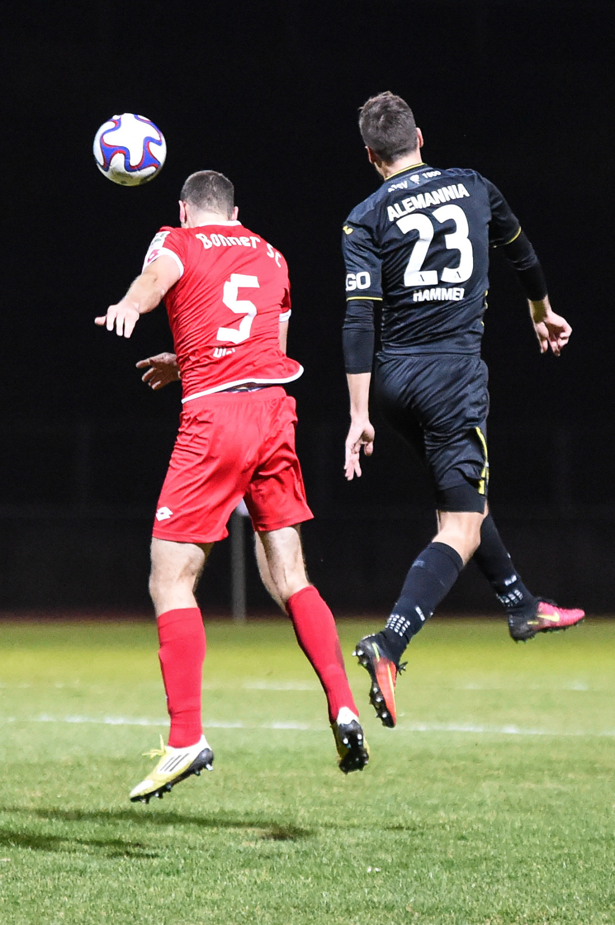 Viele Abspielfehler auf beiden Seiten bestimmten die Anfangsphase des Spiels, in der die Alemannen nach 12 Minuten zu ihrer ersten Gelegenheit kamen. Fejzullahu drehte sich im Strafraum um seinen Gegenspieler und zog dann mit links ab. BSC-Keeper Michel konnte das Leder aber noch zur Ecke lenken. Auf der Gegenseite war es Bonns Torjäger Musculus, der an der Strafraumgrenze zu viel Platz hatte und knapp links vorbeizielte (24). Nachdem Mohr eine Mickels-Flanke am langen Pfosten nicht verwerten konnte (38.), schlugen die Hausherren noch vor dem Seitenwechsel doppelt zu. Ein weiter Einwurf von Retterath wurde in den Rückraum geklärt, wo Schumacher volley abziehen konnte und aus 20 Metern sehenswert zum 1:0 traf (41.). Nur eine Zeigerumdrehung später erhöhte Bonn auf 2:0. Nach einem langen Ball war Lunga frei vor Depta aufgetaucht und schob das Leder mit Hilfe des rechten Innenpfostens über die Linie (43.). Ein fader Beigeschmack für den Pausentee.