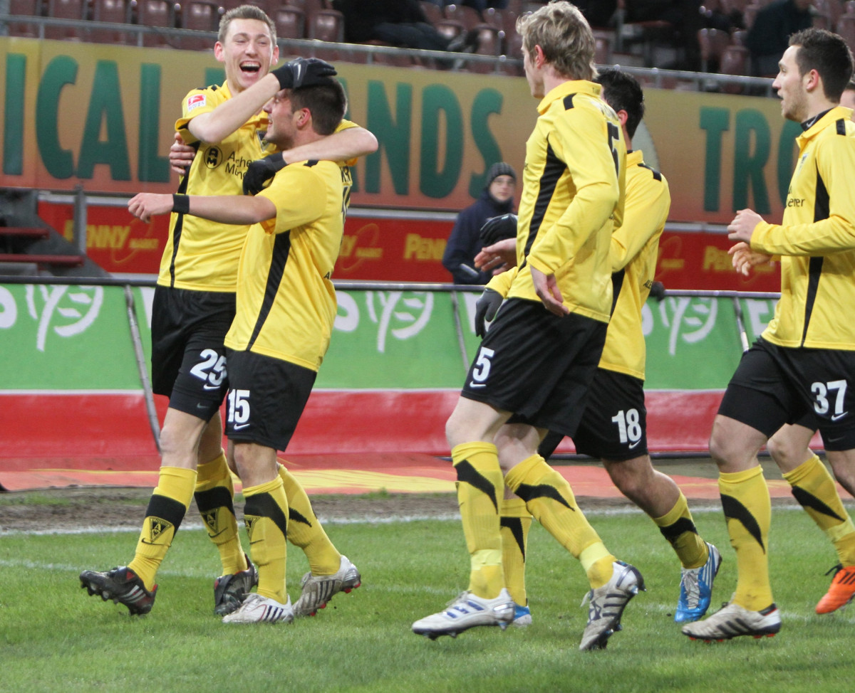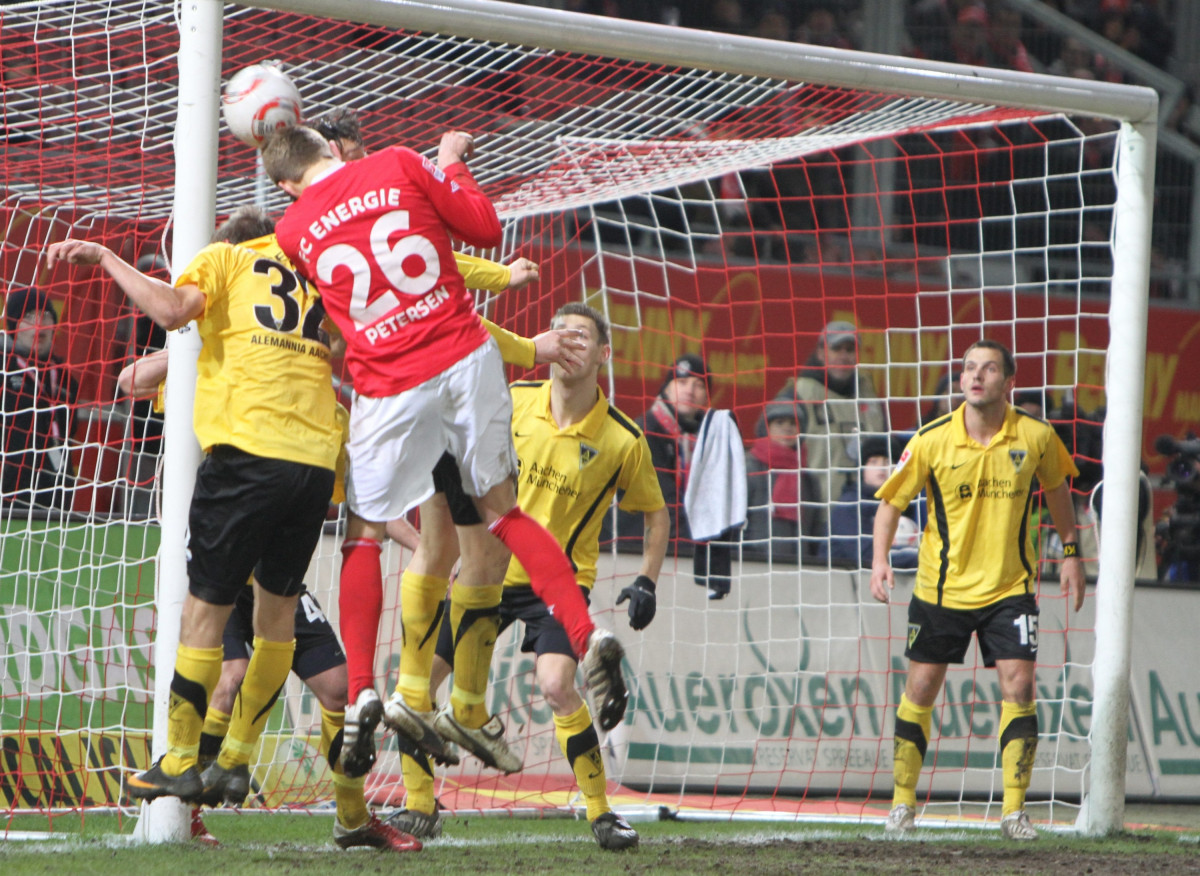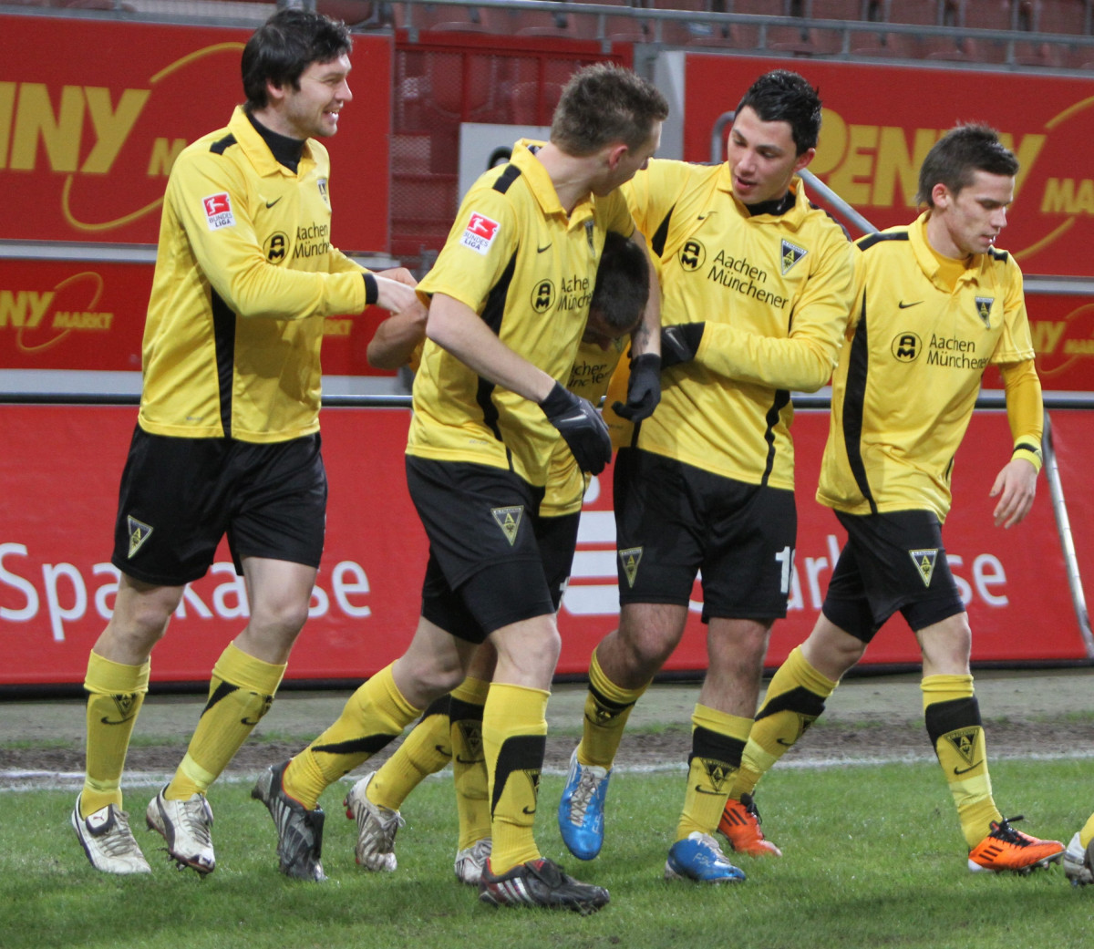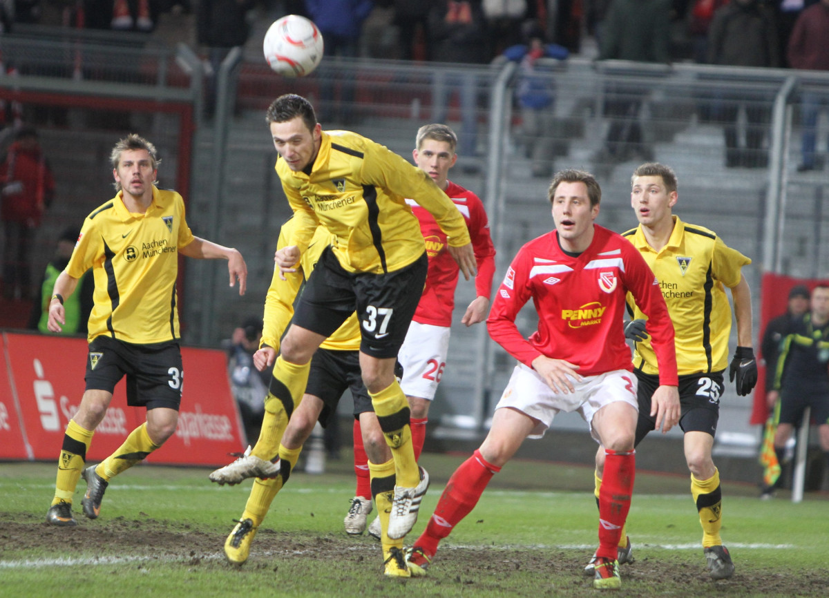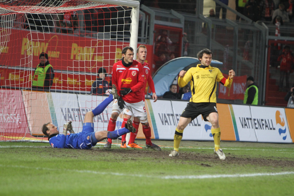 In den vergangenen Jahren war das Stadion der Freundschaft kein gutes Pflaster für die Schwarz-Gelben, der letzte Dreier gelang in der Erstligasaison 2006/2007. Doch die Tivoli-Kicker ließen sich davon in der Anfangsphase nicht beeindrucken und kamen richtig gut in die Partie. Arslans ersten Schuss lenkte Renno zur Ecke, wenige Sekunden später verzog Junglas nur knapp vom Strafraumeck (3.). Schwarz-Gelb nutze den Schwung der ersten Minuten, und wie: Nach einem Einwurf erhielt Kratz die Kugel, zog aus knapp 25 Metern per Spannschuss ab und ließ die Alemannia früh auf fremdem Geläuf jubeln – Renno lenkte den tollen Distanzschuss nur noch ins obere Netz (8.).