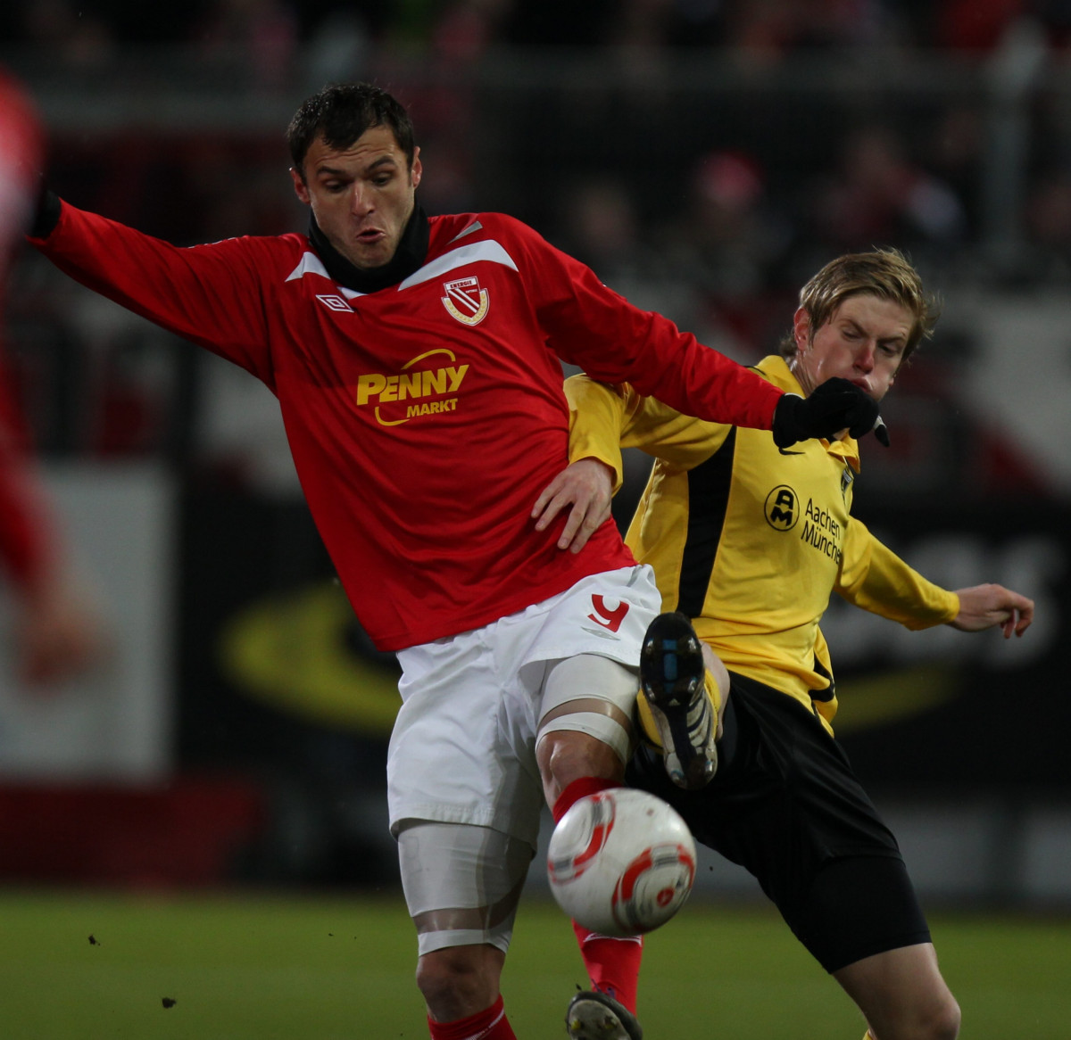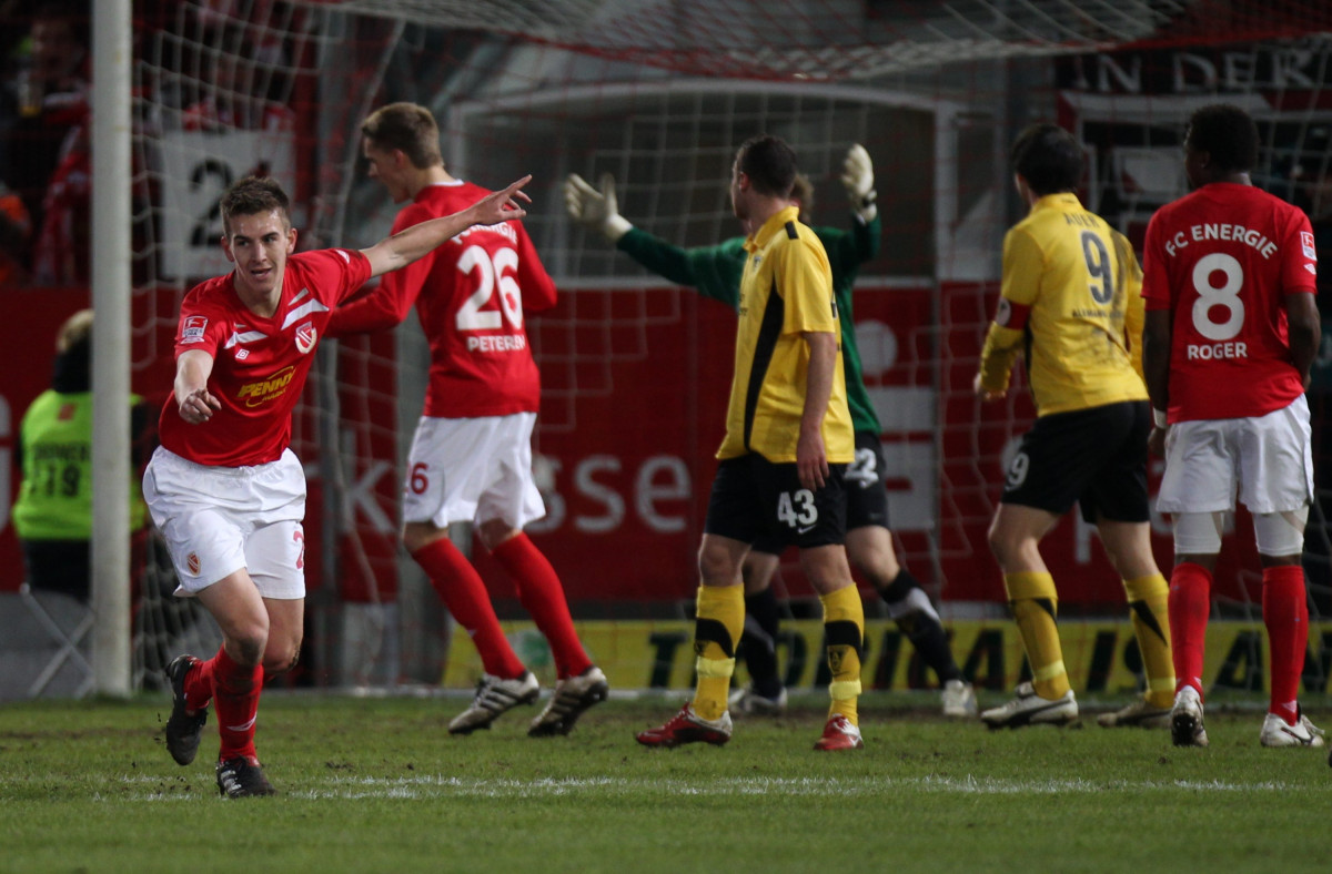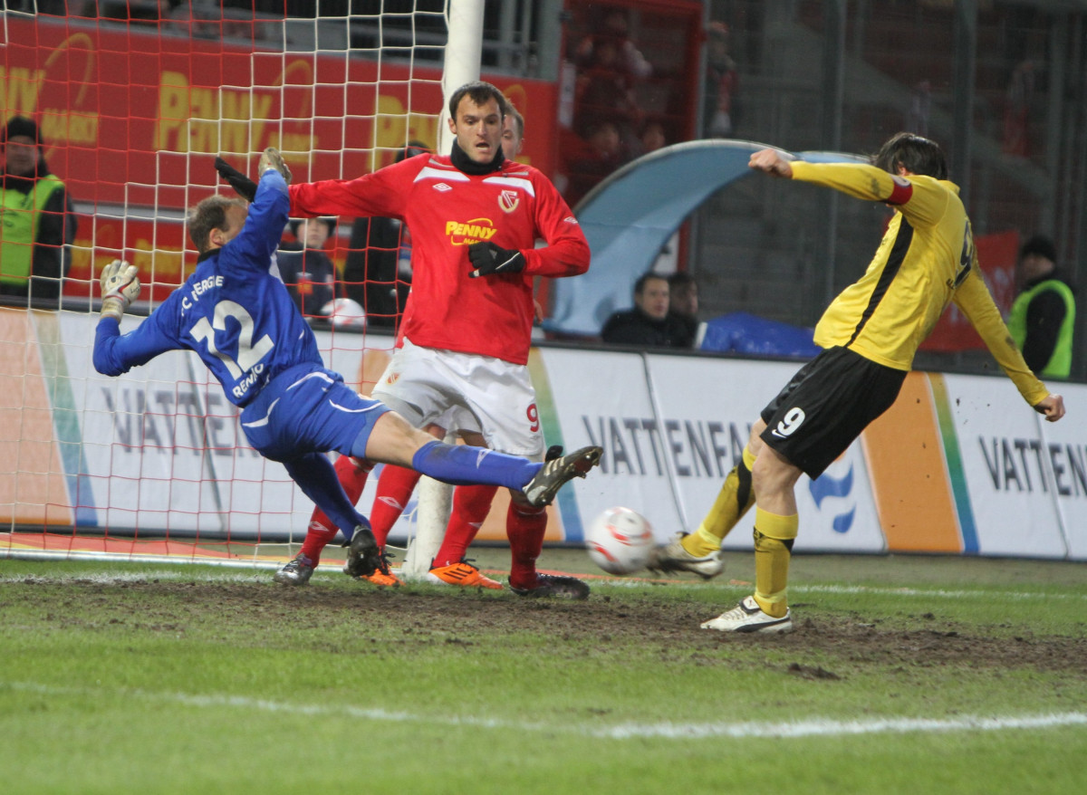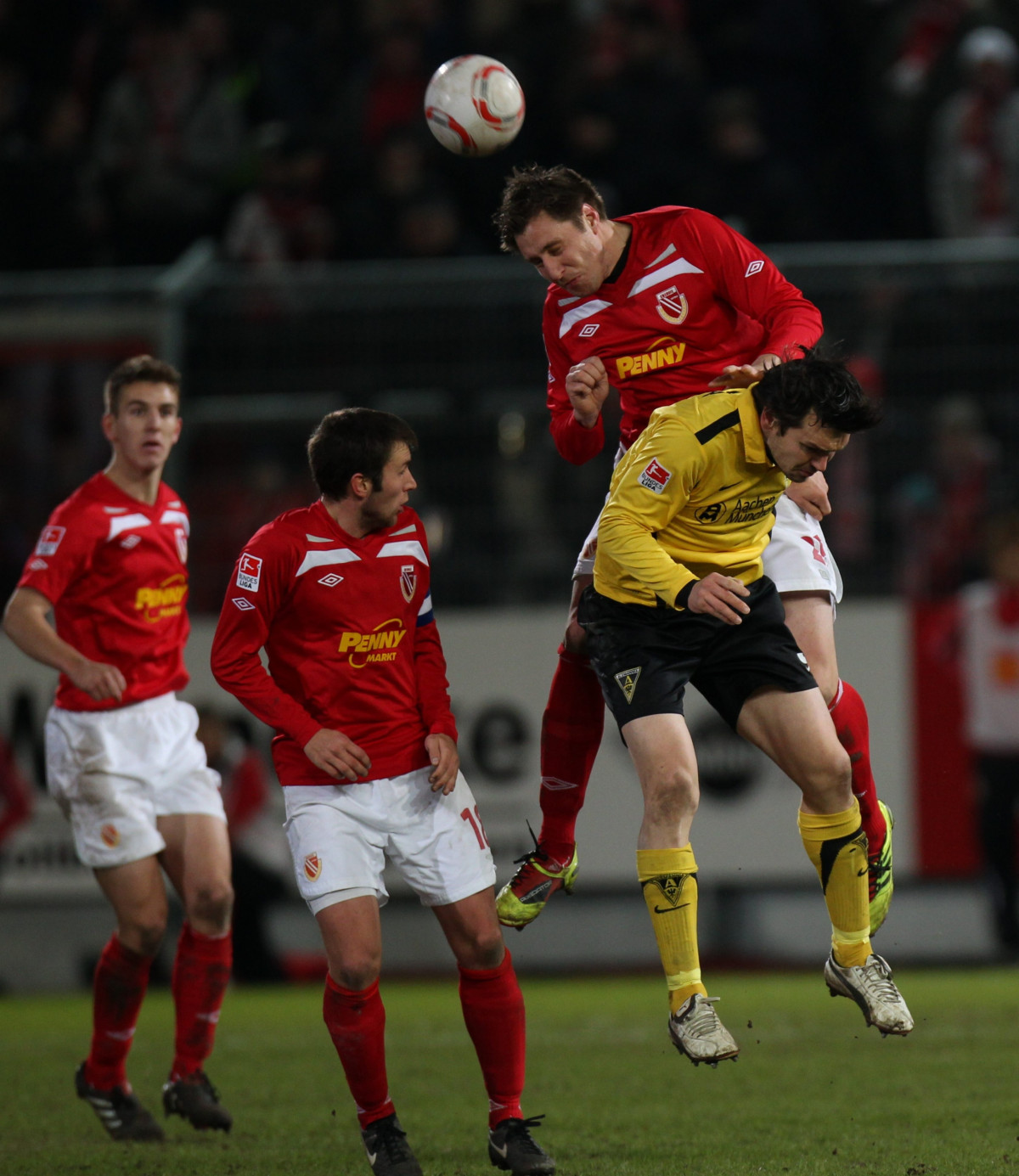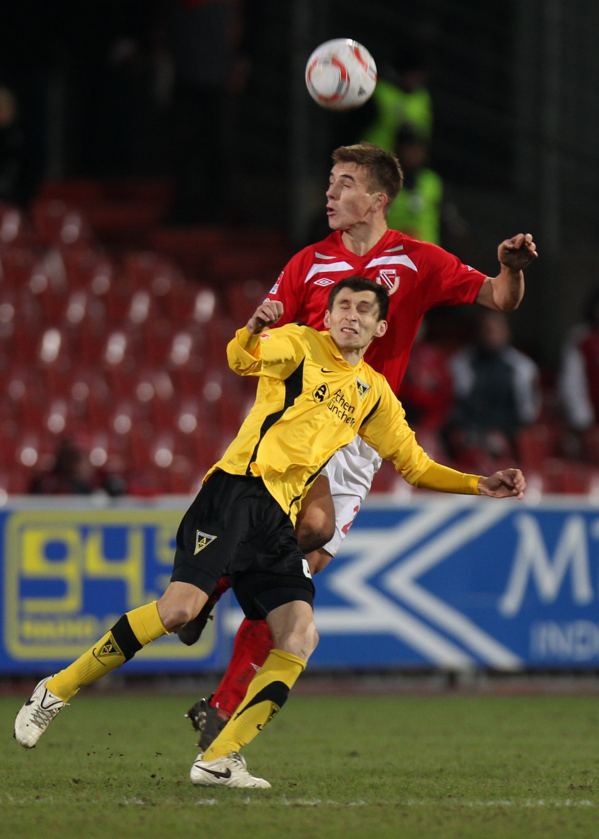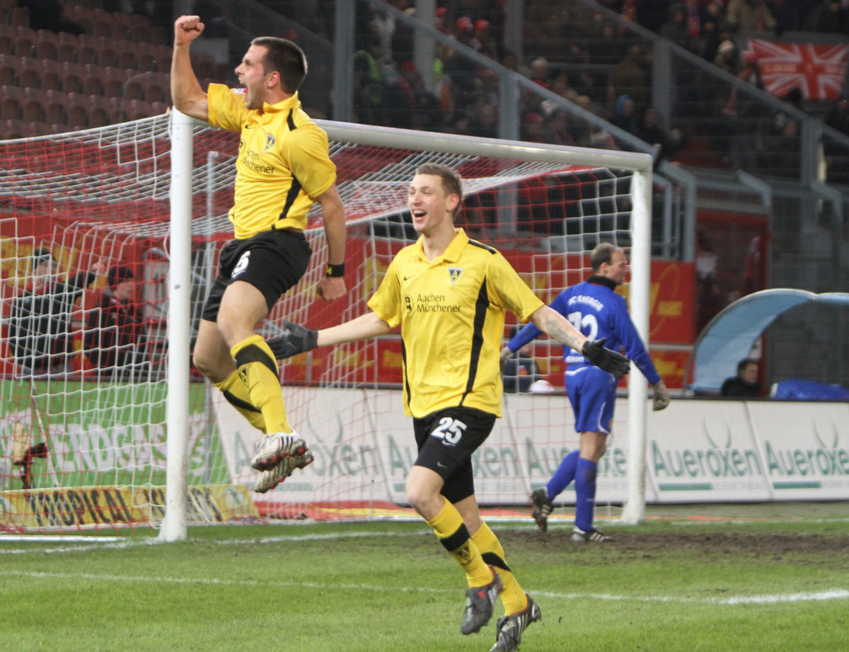 In den vergangenen Jahren war das Stadion der Freundschaft kein gutes Pflaster für die Schwarz-Gelben, der letzte Dreier gelang in der Erstligasaison 2006/2007. Doch die Tivoli-Kicker ließen sich davon in der Anfangsphase nicht beeindrucken und kamen richtig gut in die Partie. Arslans ersten Schuss lenkte Renno zur Ecke, wenige Sekunden später verzog Junglas nur knapp vom Strafraumeck (3.). Schwarz-Gelb nutze den Schwung der ersten Minuten, und wie: Nach einem Einwurf erhielt Kratz die Kugel, zog aus knapp 25 Metern per Spannschuss ab und ließ die Alemannia früh auf fremdem Geläuf jubeln – Renno lenkte den tollen Distanzschuss nur noch ins obere Netz (8.).