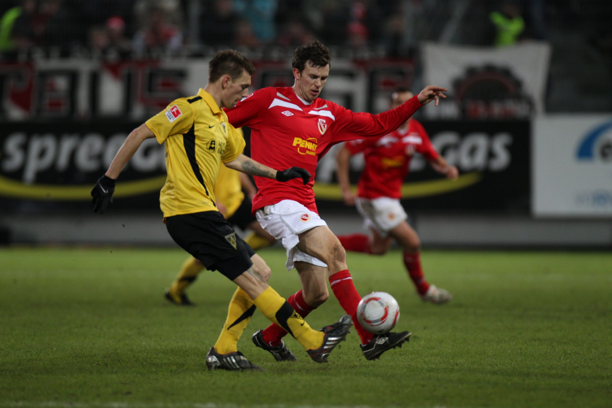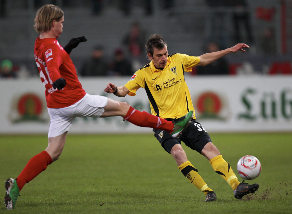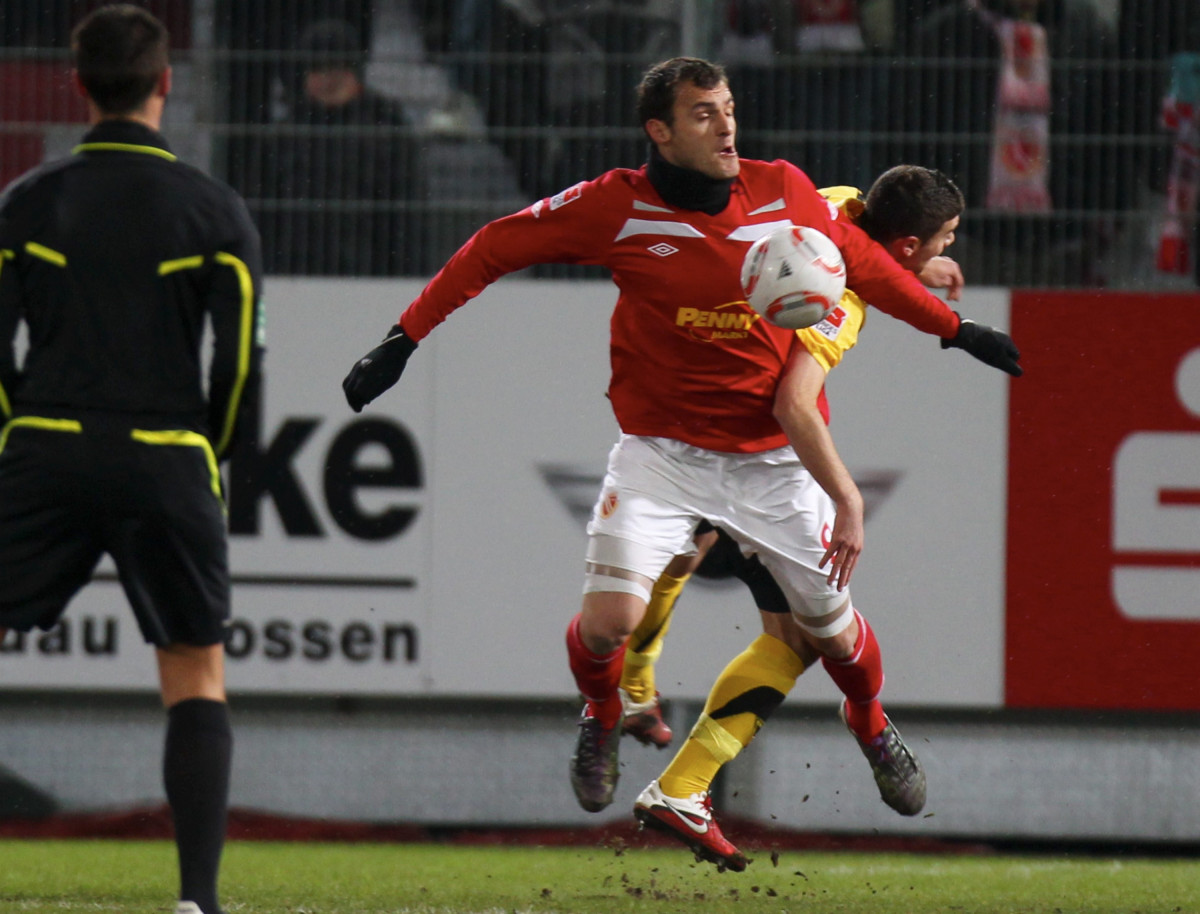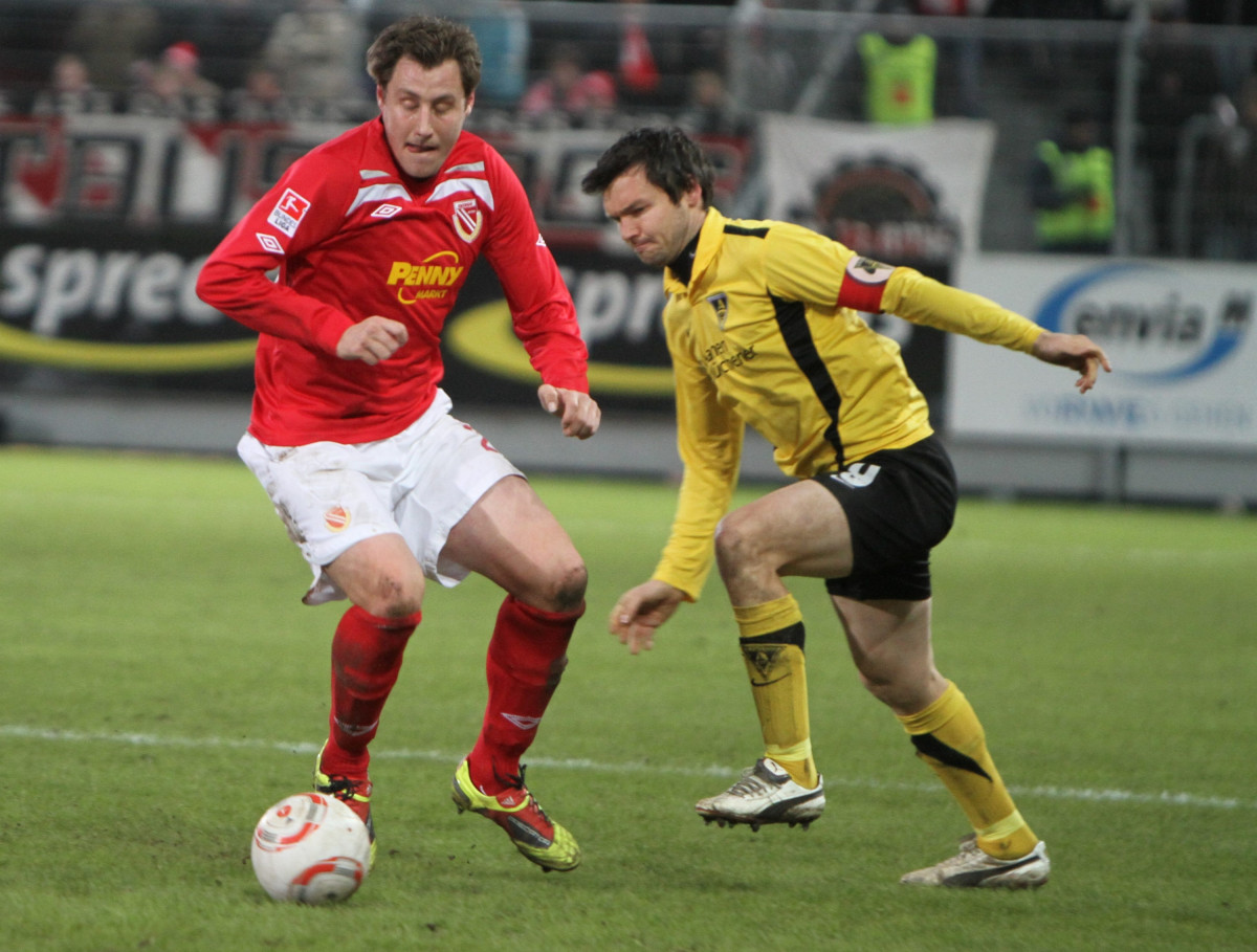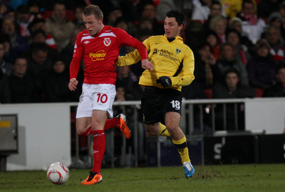 In den vergangenen Jahren war das Stadion der Freundschaft kein gutes Pflaster für die Schwarz-Gelben, der letzte Dreier gelang in der Erstligasaison 2006/2007. Doch die Tivoli-Kicker ließen sich davon in der Anfangsphase nicht beeindrucken und kamen richtig gut in die Partie. Arslans ersten Schuss lenkte Renno zur Ecke, wenige Sekunden später verzog Junglas nur knapp vom Strafraumeck (3.). Schwarz-Gelb nutze den Schwung der ersten Minuten, und wie: Nach einem Einwurf erhielt Kratz die Kugel, zog aus knapp 25 Metern per Spannschuss ab und ließ die Alemannia früh auf fremdem Geläuf jubeln – Renno lenkte den tollen Distanzschuss nur noch ins obere Netz (8.).