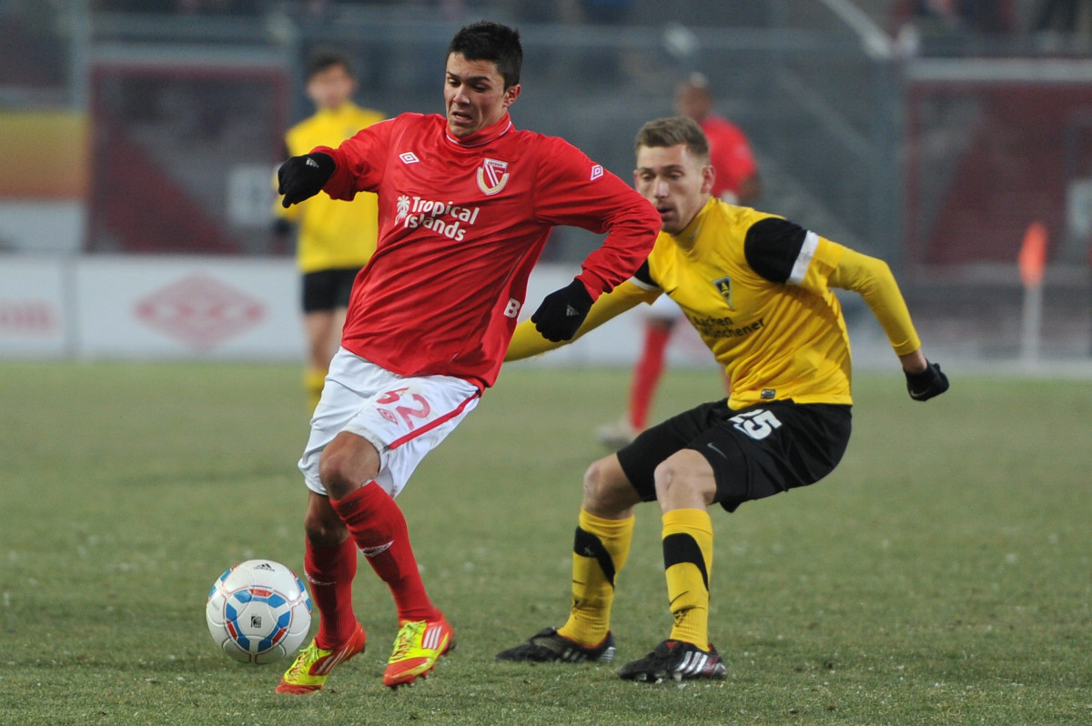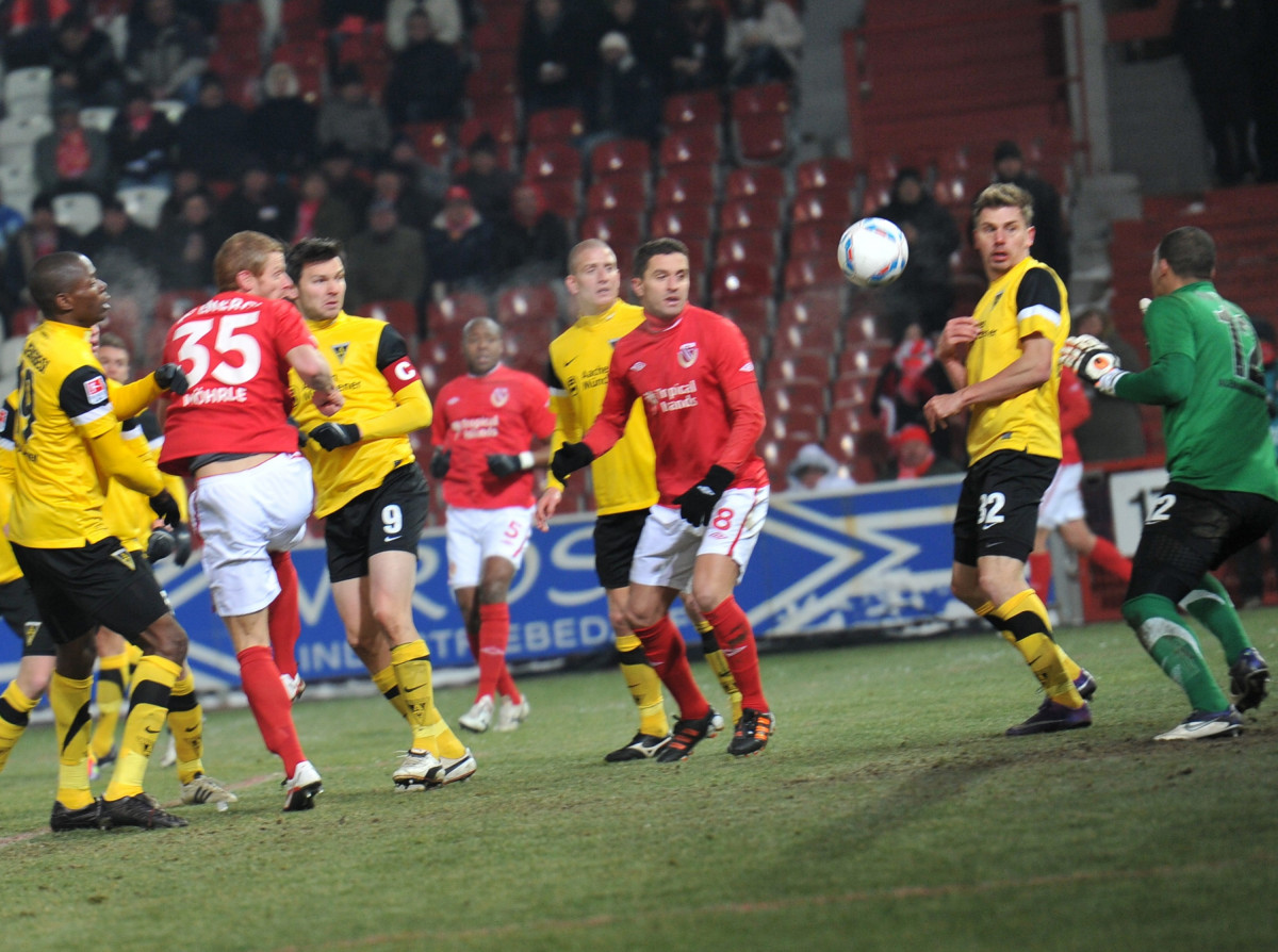 Bei etwa minus 10 Grad Celsius war in den Anfangsminuten auf dem Platz zunächst Kampf statt Kombinationsfußball angesagt. Die Hausherren hatten deutlich mehr Ballbesitz, die meisten Zweikämpfe gewannen dennoch die Schwarz-Gelben – besonders in der Luft. Rangelov und Bittencourt sorgten zwischen der 10. und 15. Minute für die erste zaghafte Torgefahr, der erste Treffer des Tages wäre allerdings um ein Haar auf der anderen Seite gefallen: Auer wollte Sturmpartner Radu mit einer flachen Hereingabe bedienen, Ziebig grätschte dazwischen und beförderte die Kugel dadurch fast ins eigene Netz (19.).