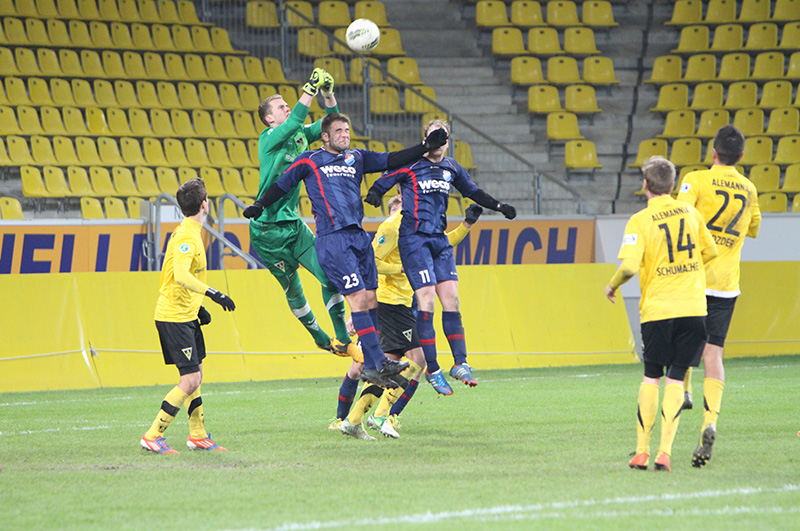 Die Alemannia hat ihr Ziel erreicht und die nächste Hürde genommen. Gegen den TSV Germania Windeck qualifizierten sich die Schützlinge von René van Eck am Mittwochabend durch einen 2:0-Erfolg für das Halbfinale des FVM-Pokals. Vor 2.400 Zuschauern auf dem Tivoli erzielten Dario Schumacher und Marcel Heller die Aachener Treffer.