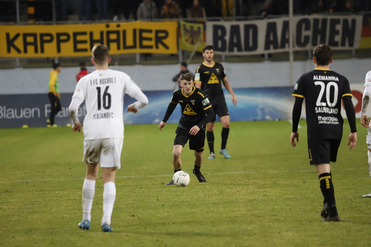 Der Trainer konnte für das Spiel gegen den Aufsteiger wieder auf die zuletzt gesperrten Jannis Held und Freddy Baum zurückgreifen. Außerdem startete David Sauerland für den erkälteten Dino Bajric. In der beschriebenen ersten halben Stunde zeigte die von Hohl aufgebotene Elf eine druckvolle Anfangsphase, schnürte den Gegner regelrecht am eigenen Strafraum ein. Nachdem es in den ersten beiden Minuten die ersten zwei von insgesamt 15 Ecken für die Alemannia gab, kam Elsamed Ramaj zur ersten Gelegenheit. Jannik Mause verlängerte einen langen Ball auf seinen Stürmerkollegen, der über die linke Seite bis zur Grundlinie durchgehen konnte. Dort konnte er den Ball zwar am Torwart vorbeischieben, verpasste aber auch knapp das lange Eck (4.). Nur wenige Minuten später verpasste Tim Korzuschek knapp, als Keeper Gian-Luca Reck eine Hereingabe nur nach vorne abprallen lassen konnte. Korzuschek war allerdings nicht schnell genug beim Abpraller, die Bocholter konnten im letzten Moment noch klären (9.). Reck stand für den gelbgesperrten Stammtorhüter Sebastian Wickl im Kasten der Gäste. Und auch die dritte große Möglichkeit sollte für Alemannia nicht zum Torerfolg führen. Ein gefährlicher Schuss von Held konnte aber kurz vor der Torlinie noch von Marko Stojanovic geblockt werden (17.). Auf der anderen Seite konnte Marco Müller gerade noch dazwischen gehen und Gordon Wild daran hindern aus etwa 10 Metern erstmals gefährlich für die Bocholter zum Abschluss zu kommen (20.). Die Alemannia wiederum verpasste es erneut in Führung zu gehen, als ein Freistoß von Franko Uzelac nur knapp am linken Pfosten vorbeisegelte (25.). Insgesamt erspielten sich die Schwarz-Gelben in der ersten Halbzeit zehn Ecken, die zum Teil auch gefährlich in den Strafraum gespielt wurden, ohne aber zu den großen Chancen zu kommen. „Bei insgesamt 15 Ecken kann man auch mal ein Tor machen“, resümierte auch Hohl nach dem Spiel. Kurz vor der Pause hätte dann plötzlich der 1. FC Bocholt in Führung gehen können. Wild wurde lang geschickt, lief auf Marcel Johnen zu, rutschte dann aber im Strafraum aus (41.).