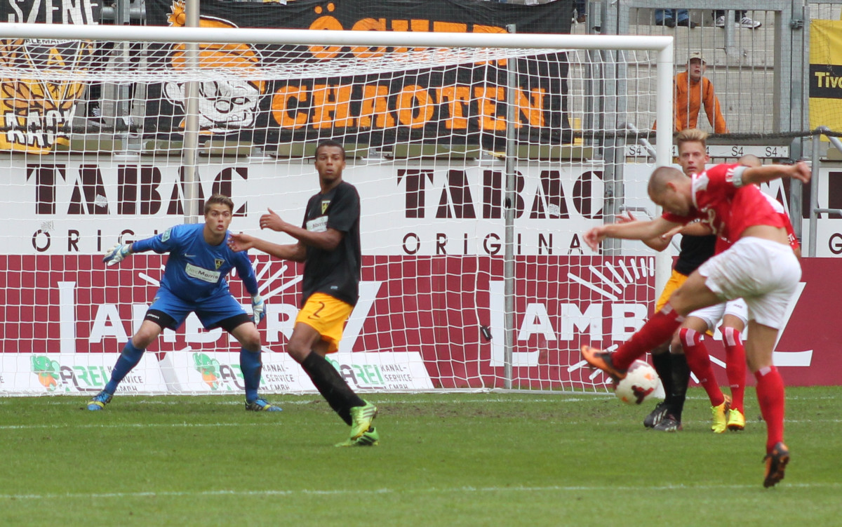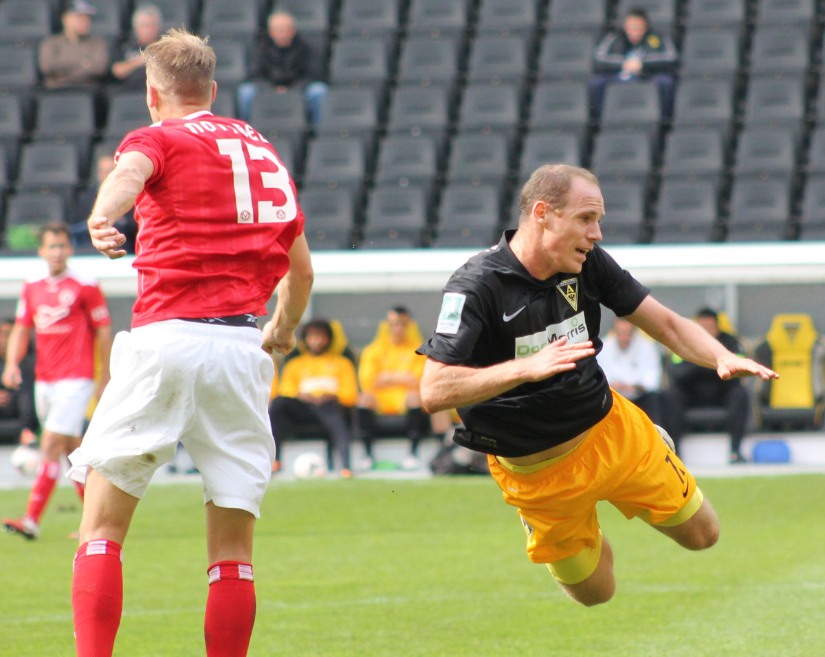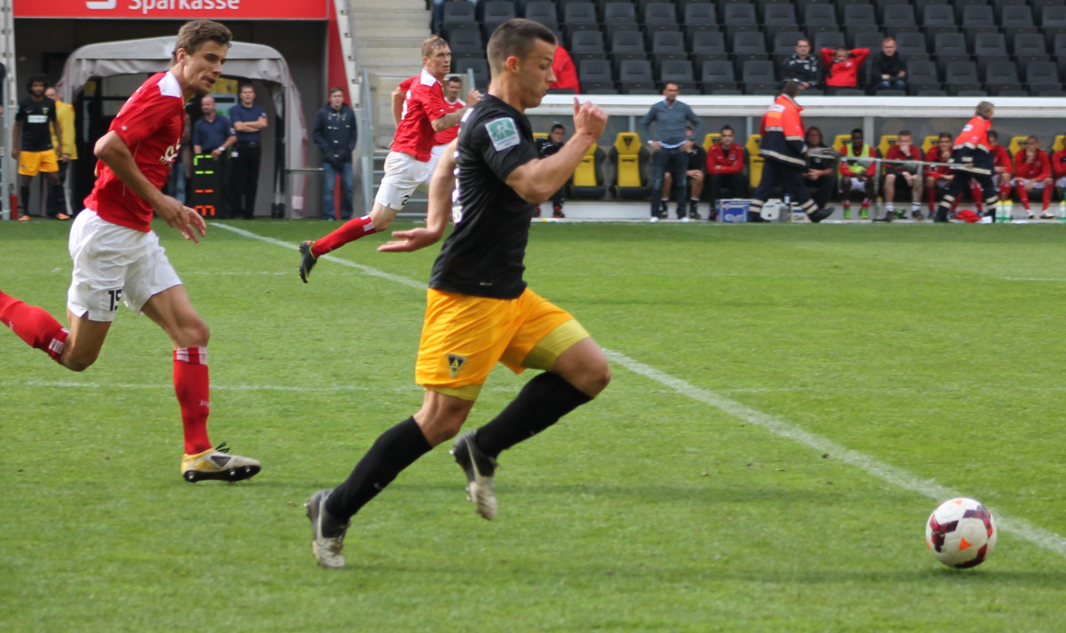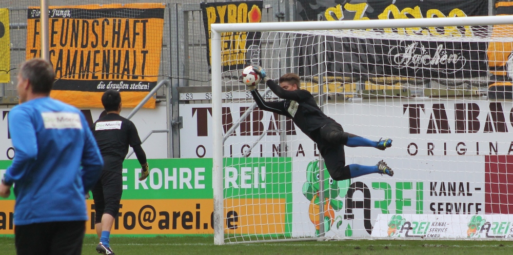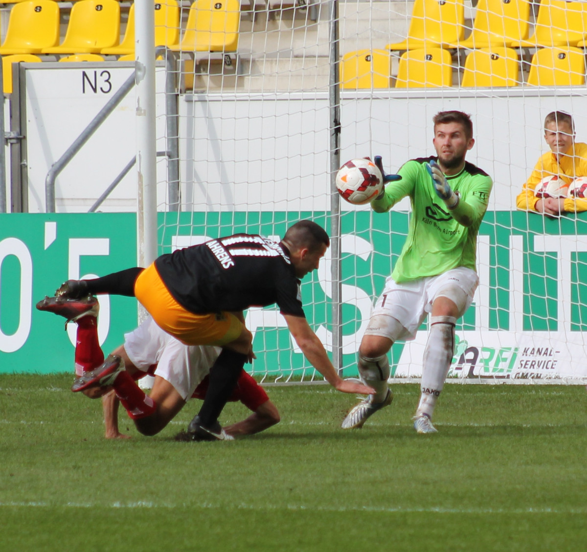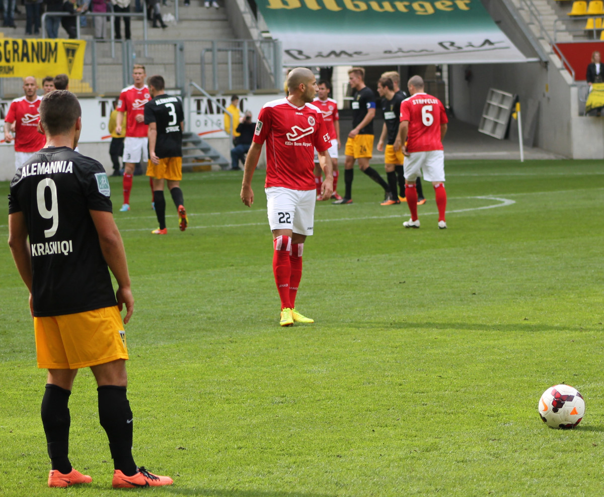 Im Vergleich zum 0:3 am vergangenen Dienstag in Siegen gab es zwei personelle Änderungen in der Anfangself: Sascha Marquet und Mazan Moslehe starteten für den gesperrten Jochen Schumacher sowie Domagoj Duspara, der auf der Bank Platz nahm. Die erste gute Möglichkeit ging nach 14 Minuten auf das Konto der rechtsrheinischen Gäste. Staffeldt zog von der Strafraumgrenze wuchtig ab, Opper schmiss sich dazwischen und wehrte die Kugel ab. Während die Kölner auf ein Handspiel reklamierten, setzte Glasner den Nachschuss über das Tor. Gleich im Gegenangriff kamen die Tivoli-Kicker zu ihrer ersten Gelegenheit. Drevina spielte einen Steckpass in den Lauf den Marquet, der Gästekeeper Koczor umkurven wollte. Der Torhüter bekam im letzten Augenblick noch eine Hand an den Ball und konnte den Einschuss damit verhindern. Glück hatte die Alemannia, als Nottbeck nach 20 Minuten einen Kopfball aus kurzer Entfernung nach einer Rechtsflanke von Hickl sträflich freistehend über das Tor platzierte. Auch diesmal folgte die Antwort der Schwarz-Gelben postwendend. Marquet spielte in den Lauf von Moslehe, der den Ball jedoch nicht mehr am heraus eilenden Koczor vorbei spitzeln konnte. Die Alemannia bot dem Favoriten ordentlich Paroli. Nach einer halben Stunde fiel das Leder im Strafraum vor die Füße von Marquet, dessen Torschuss jedoch in letzter Sekunde abgeblockt werden konnte (31.). Drei Minuten später kam die Schubert-Elf erneut gefährlich vor das Kölner Tor. Marquet zielte aus 14 Metern halbrechter Position auf den kurzen Torwinkel, wo Koczor den Schuss noch um den Pfosten lenken konnte (34). Ohne Tore, aber dafür mit viel Beifall, ging es für die Schwarz-Gelben in die Kabine.