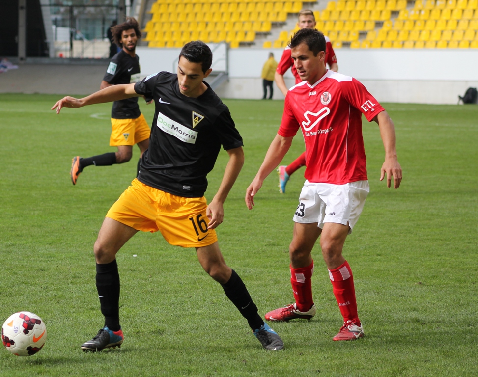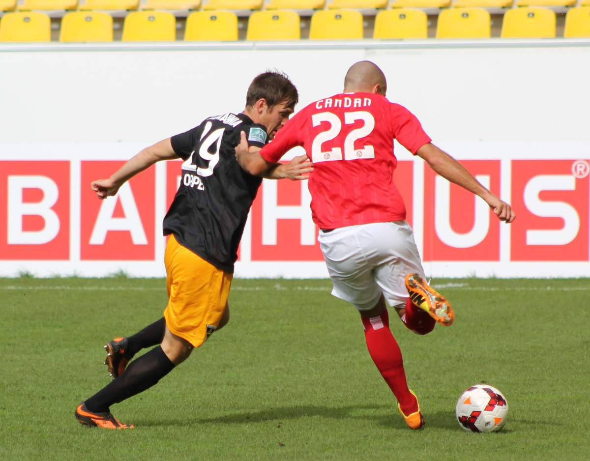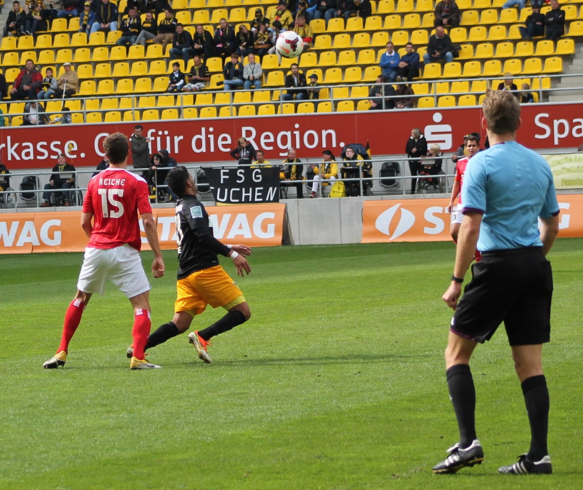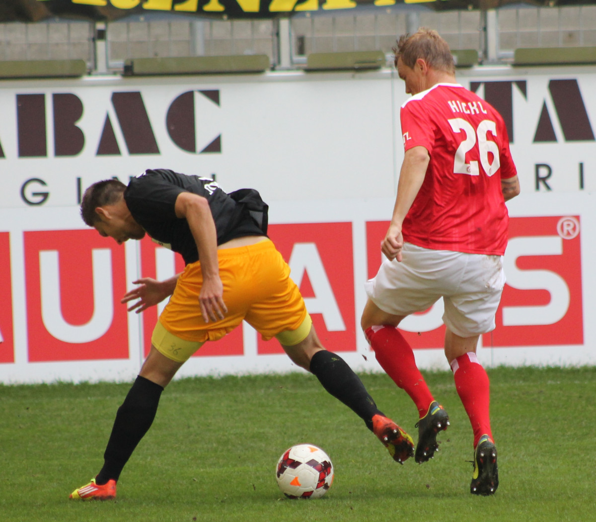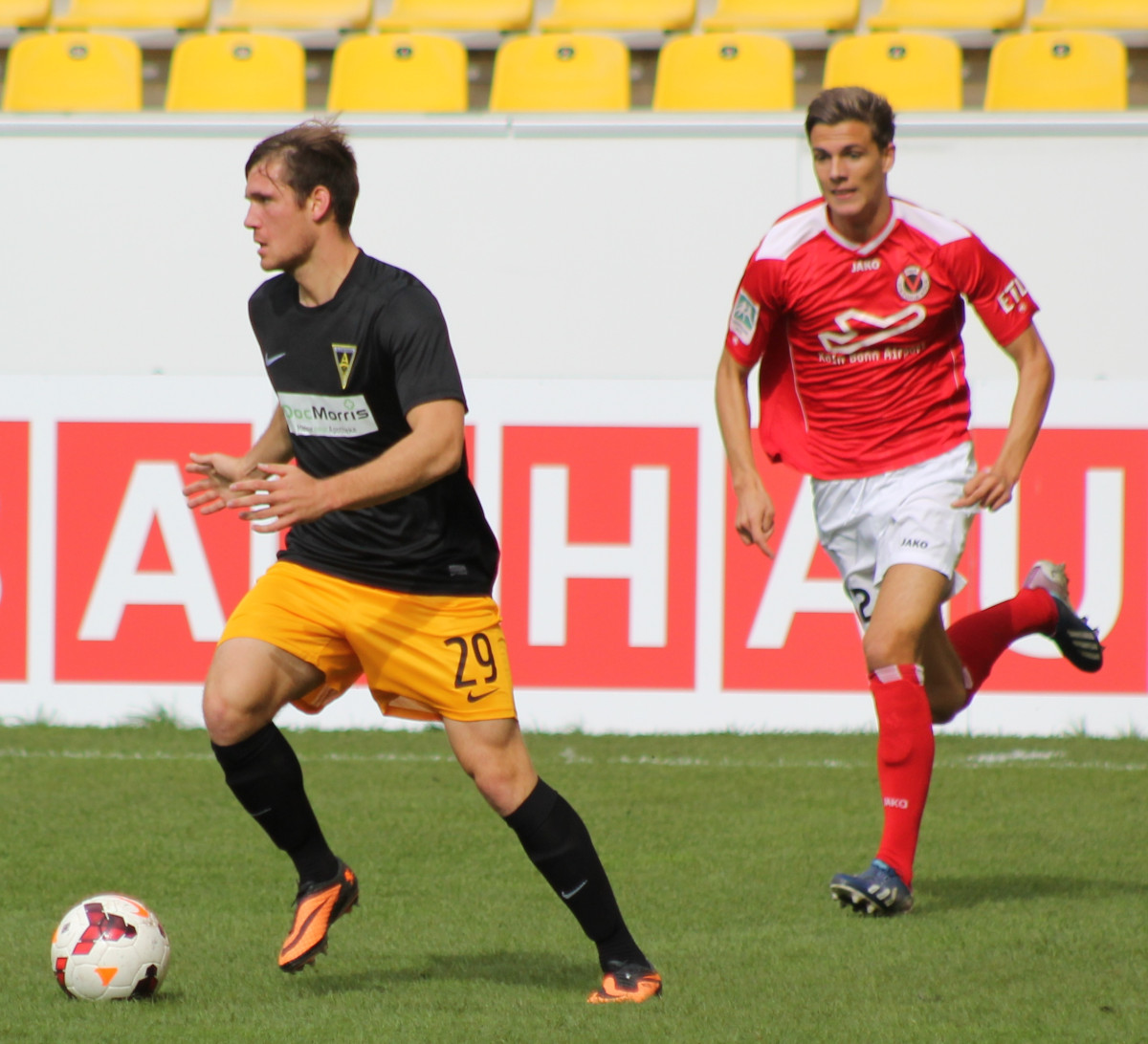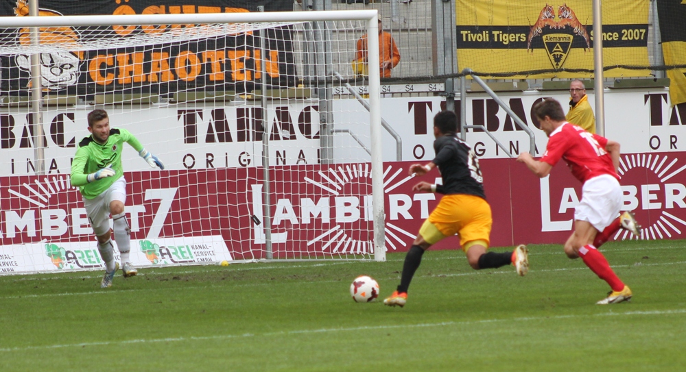 Im Vergleich zum 0:3 am vergangenen Dienstag in Siegen gab es zwei personelle Änderungen in der Anfangself: Sascha Marquet und Mazan Moslehe starteten für den gesperrten Jochen Schumacher sowie Domagoj Duspara, der auf der Bank Platz nahm. Die erste gute Möglichkeit ging nach 14 Minuten auf das Konto der rechtsrheinischen Gäste. Staffeldt zog von der Strafraumgrenze wuchtig ab, Opper schmiss sich dazwischen und wehrte die Kugel ab. Während die Kölner auf ein Handspiel reklamierten, setzte Glasner den Nachschuss über das Tor. Gleich im Gegenangriff kamen die Tivoli-Kicker zu ihrer ersten Gelegenheit. Drevina spielte einen Steckpass in den Lauf den Marquet, der Gästekeeper Koczor umkurven wollte. Der Torhüter bekam im letzten Augenblick noch eine Hand an den Ball und konnte den Einschuss damit verhindern. Glück hatte die Alemannia, als Nottbeck nach 20 Minuten einen Kopfball aus kurzer Entfernung nach einer Rechtsflanke von Hickl sträflich freistehend über das Tor platzierte. Auch diesmal folgte die Antwort der Schwarz-Gelben postwendend. Marquet spielte in den Lauf von Moslehe, der den Ball jedoch nicht mehr am heraus eilenden Koczor vorbei spitzeln konnte. Die Alemannia bot dem Favoriten ordentlich Paroli. Nach einer halben Stunde fiel das Leder im Strafraum vor die Füße von Marquet, dessen Torschuss jedoch in letzter Sekunde abgeblockt werden konnte (31.). Drei Minuten später kam die Schubert-Elf erneut gefährlich vor das Kölner Tor. Marquet zielte aus 14 Metern halbrechter Position auf den kurzen Torwinkel, wo Koczor den Schuss noch um den Pfosten lenken konnte (34). Ohne Tore, aber dafür mit viel Beifall, ging es für die Schwarz-Gelben in die Kabine.