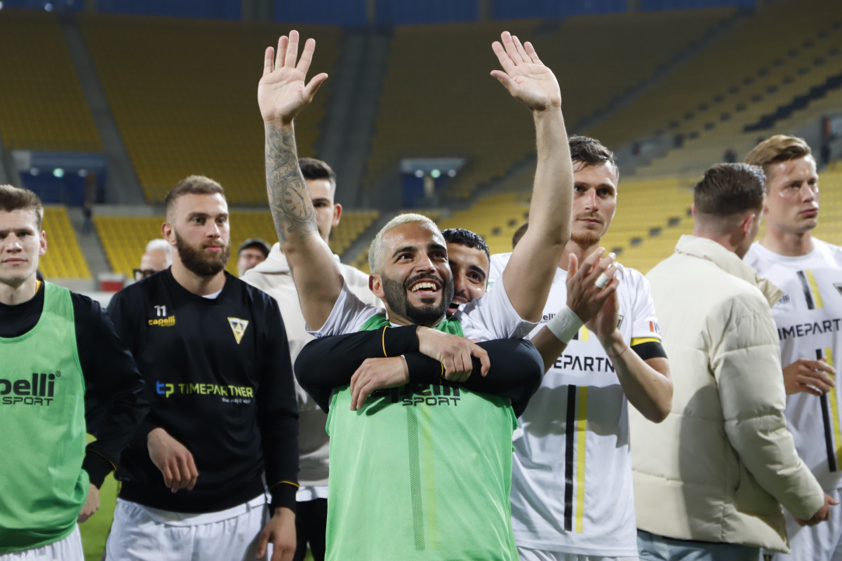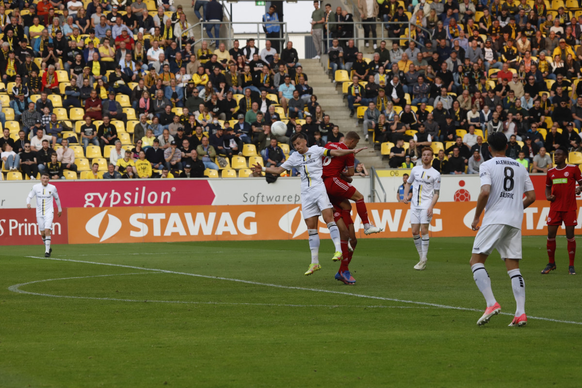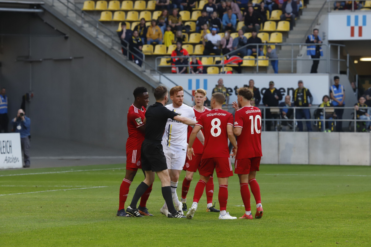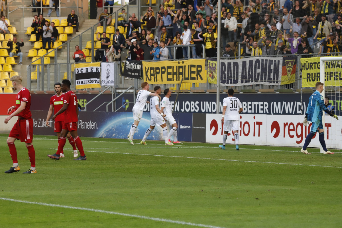 Durch das Unentschieden des Bonner SC bei Rot Weiss Ahlen ist es amtlich: Alemannia Aachen wird auch in der Saison 2022/23 in der Regionalliga West spielen. Den Grundstein für den Klassenerhalt legte Schwarz-Gelb am Freitagabend mit einem Sieg des puren Willens – vor 9900 ekstatischen Fans an der Krefelder Straße besiegelten die Tore von Franko Uzelac (45.+1), Tim Korzuschek (47.) und Hamdi Dahmani (84.) den 3:1-Erfolg über die U23 von Fortuna Düsseldorf. Diese war zwischenzeitlich durch Patrick Sussek (11.) in Führung gegangen.