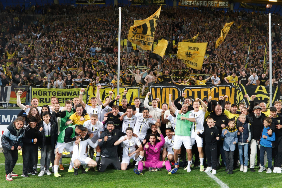 Dieses Tor zum berühmten psychologisch richtigen Zeitpunkt schien endgültig der Brustlöser zu sein für die in weiß gekleideten Alemannen, denn keine zwei Minuten nach der Pause schlug Schwarz-Gelb erneut zu. Korzuschek trieb an und nahm Selim Gündüz auf der linken Seite mit. Dessen Flanke verpasste Ergün Yildiz in der Mitte zwar, am zweiten Pfosten lauerte jedoch Dahmani. Der Angreifer brachte die Kugel noch einmal vor das Tor und fand den mittlerweile völlig blanken Korzuschek, der den Ball nur noch über die Linie zu drücken brauchte – das Spiel war gedreht (47.). Spätestens jetzt mutierte der Tivoli zum Tollhaus. Es folgte eine überaus konzentrierte zweite Halbzeit der Gastgeber, annähernd gefährlich für das Mroß-Tor wurde es nur noch beim Schuss von Jona Niemiec, der knapp über den Querbalken sauste (80.). Zuvor hätte Lukas Wilton nach einem Uzelac-Freistoß schon fast alles klar gemacht, Düsseldorf-Keeper Dennis Gorka ließ den Standard nach vorne klatschen und der Linksverteidiger verpasste mit seinem Nachschuss nur knapp einen Treffer (68.). So musste es Dahmani eben richten – der Routinier stand in der 84. Minute wiederum nach einer Ecke von Bajric vollkommen frei und köpfte vor der verwaisten Nordtribüne zum 3:1-Endstand ein. Gegenüber brachen dann alle Dämme. In diesem Moment wurde die Tür zum Klassenerhalt ganz weit aufgestoßen – und sie sollte auch nicht mehr zufallen. „Wir sind noch nicht durch“, hatte der etatmäßige Kapitän Peter Hackenberg nach dem Spiel in seiner Gänsehaut-Ansprache an die Fans noch angemerkt, gut 18 Stunden später sollte es durch den Bonn-Patzer dann aber soweit sein. „Ich ziehe den Hut vor den Jungs, wie sie Spieltag für Spieltag diesen Endspielcharakter angenommen haben. Alle haben in den letzten Wochen an einem Strang gezogen, so ein Spiel vor solchen Zuschauern ist dann der Lohn dafür. Ich bin schlicht überglücklich“, fasste Trainer Kilic noch am Freitagabend zusammen.