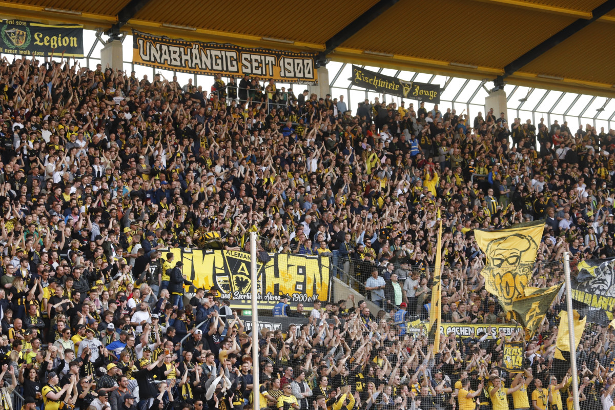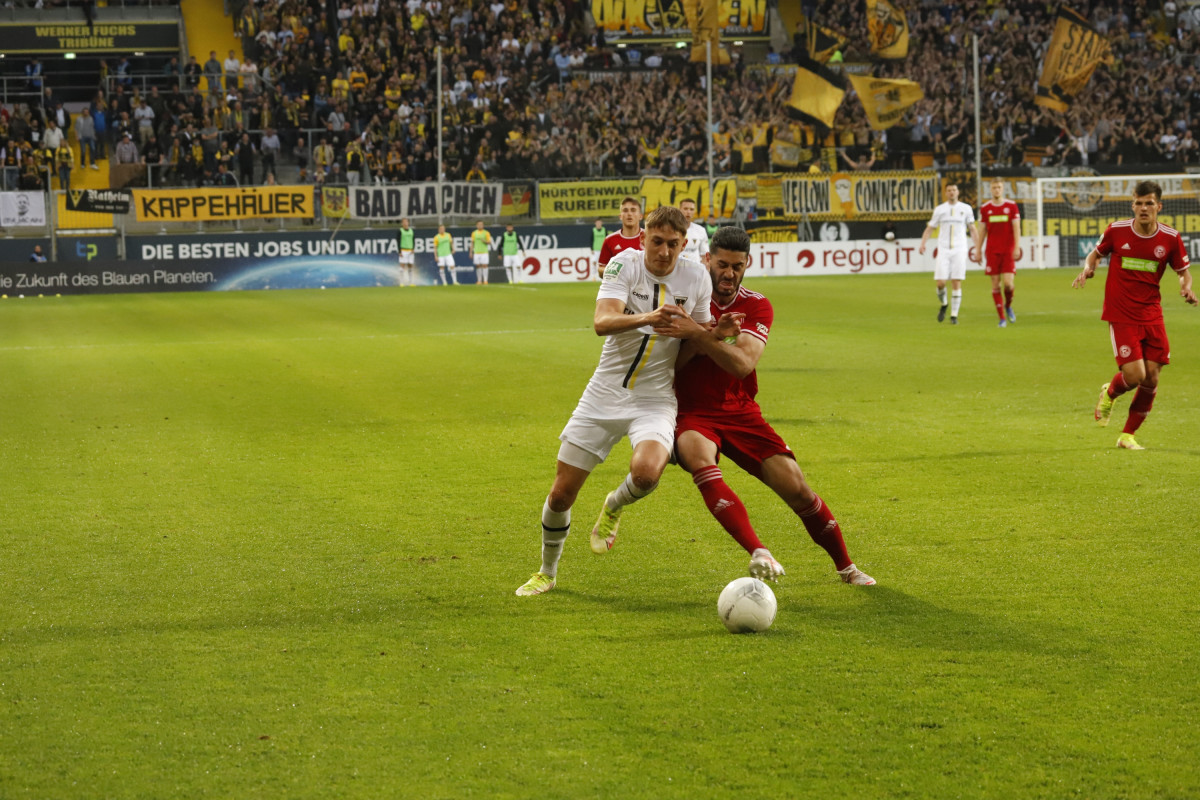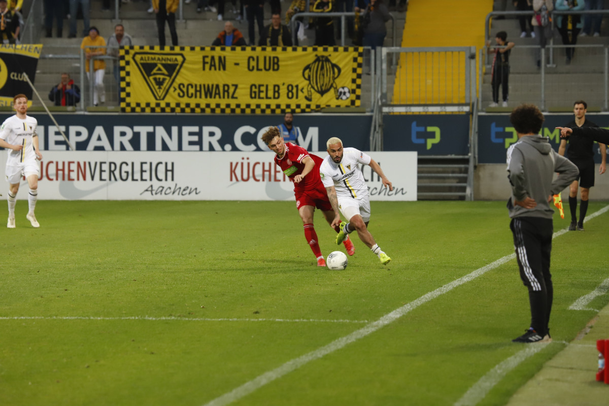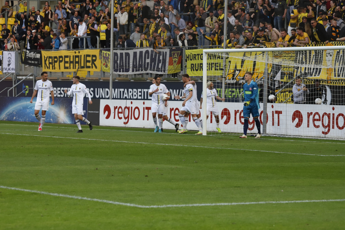 Ein letztes Mal in dieser Spielzeit hieß es an diesem 37. Spieltag unter Flutlicht ,Tivoli‘, ein letztes Mal hieß es ,Vollgas geben‘. Und diese 90 Minuten plus Nachspielzeit sollten die wohl intensivsten, emotionalsten und richtungsweisendsten Minuten der gesamten Saison, vielleicht sogar der letzten Jahre im Wohnzimmer der Alemannia werden. Bereits im Vorfeld hatte sich abgezeichnet, dass es irgendwie ein besonderes Spiel werden würde gegen die Zweite von Fortuna Düsseldorf. Der Zuspruch und die phänomenale Unterstützung der letzten Wochen aus dem schwarz-gelben Fanlager – das war schon früh an der Zahl der verkauften Karten ablesbar gewesen – sollte an diesem Abend in einer ungeahnten Wucht kulminieren, die sich von den Rängen auf die elf Alemannen auf dem Rasen übertrug. „Was die Fans hier seit Wochen abreißen, ist einfach der Wahnsinn“, brachte es ein sichtlich erleichterter Fuat Kilic nach Abpfiff auf den Punkt. Minutenlang hatte der Coach gemeinsam mit seiner Mannschaft noch mit den Anhängern an der Werner-Fuchs-Tribüne gefeiert, die kollektive Erleichterung zeigte sich mehr als deutlich. Der Klassenerhalt war so gut wie eingetütet – dabei hatte das Spiel so gar nicht im Sinne der Hausherren begonnen.
