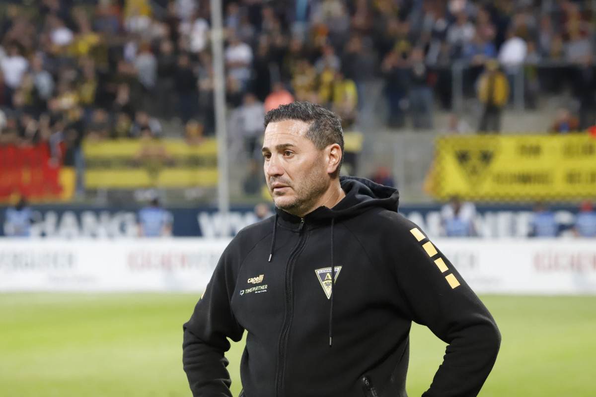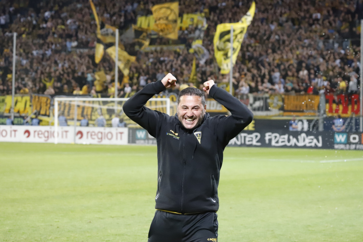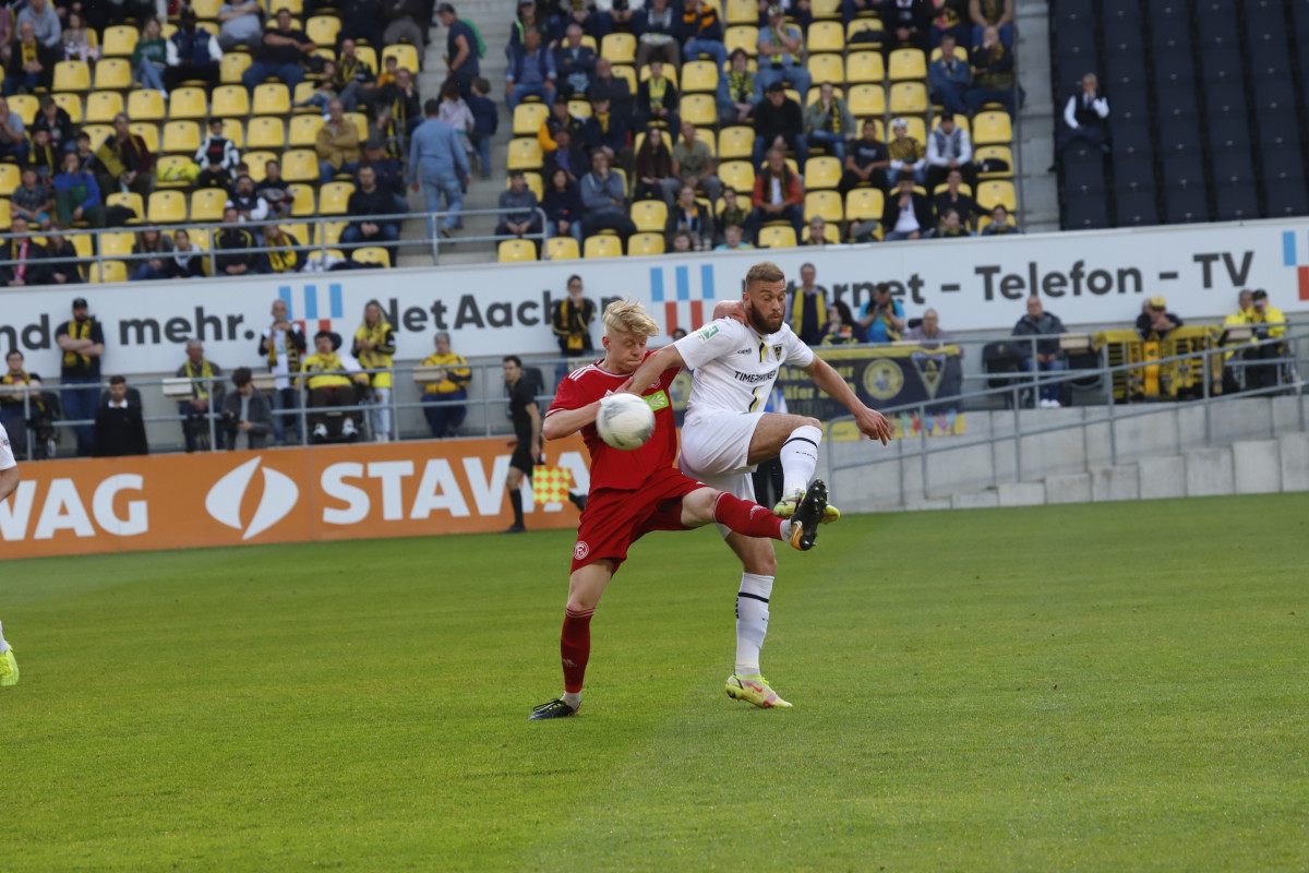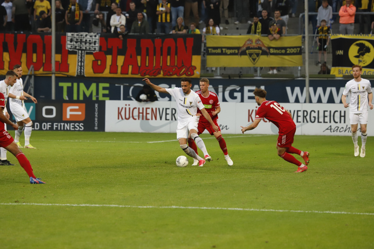 Ein letztes Mal in dieser Spielzeit hieß es an diesem 37. Spieltag unter Flutlicht ,Tivoli‘, ein letztes Mal hieß es ,Vollgas geben‘. Und diese 90 Minuten plus Nachspielzeit sollten die wohl intensivsten, emotionalsten und richtungsweisendsten Minuten der gesamten Saison, vielleicht sogar der letzten Jahre im Wohnzimmer der Alemannia werden. Bereits im Vorfeld hatte sich abgezeichnet, dass es irgendwie ein besonderes Spiel werden würde gegen die Zweite von Fortuna Düsseldorf. Der Zuspruch und die phänomenale Unterstützung der letzten Wochen aus dem schwarz-gelben Fanlager – das war schon früh an der Zahl der verkauften Karten ablesbar gewesen – sollte an diesem Abend in einer ungeahnten Wucht kulminieren, die sich von den Rängen auf die elf Alemannen auf dem Rasen übertrug. „Was die Fans hier seit Wochen abreißen, ist einfach der Wahnsinn“, brachte es ein sichtlich erleichterter Fuat Kilic nach Abpfiff auf den Punkt. Minutenlang hatte der Coach gemeinsam mit seiner Mannschaft noch mit den Anhängern an der Werner-Fuchs-Tribüne gefeiert, die kollektive Erleichterung zeigte sich mehr als deutlich. Der Klassenerhalt war so gut wie eingetütet – dabei hatte das Spiel so gar nicht im Sinne der Hausherren begonnen.