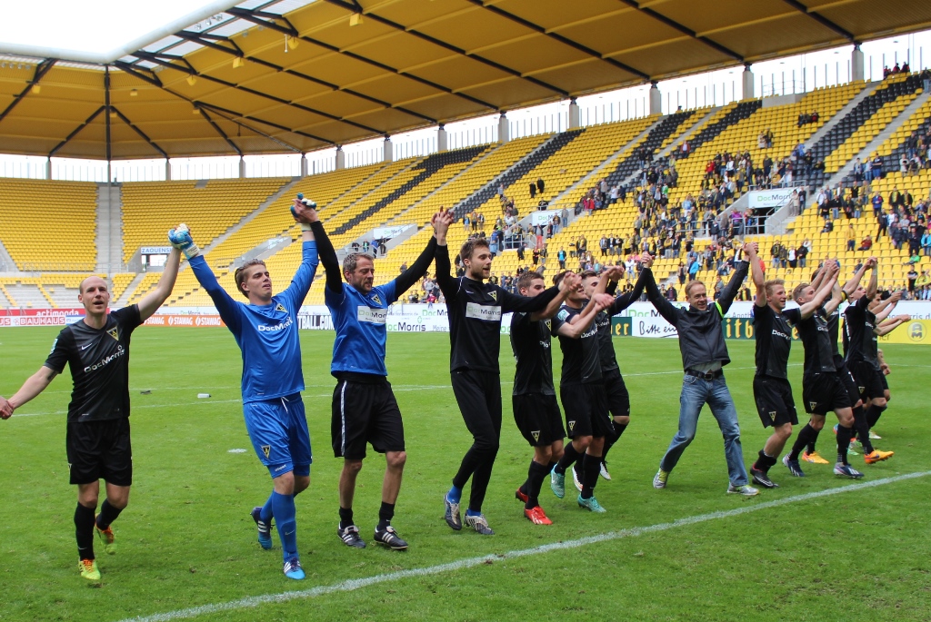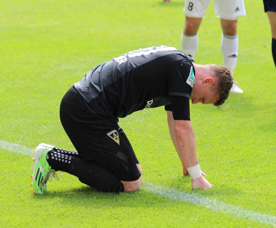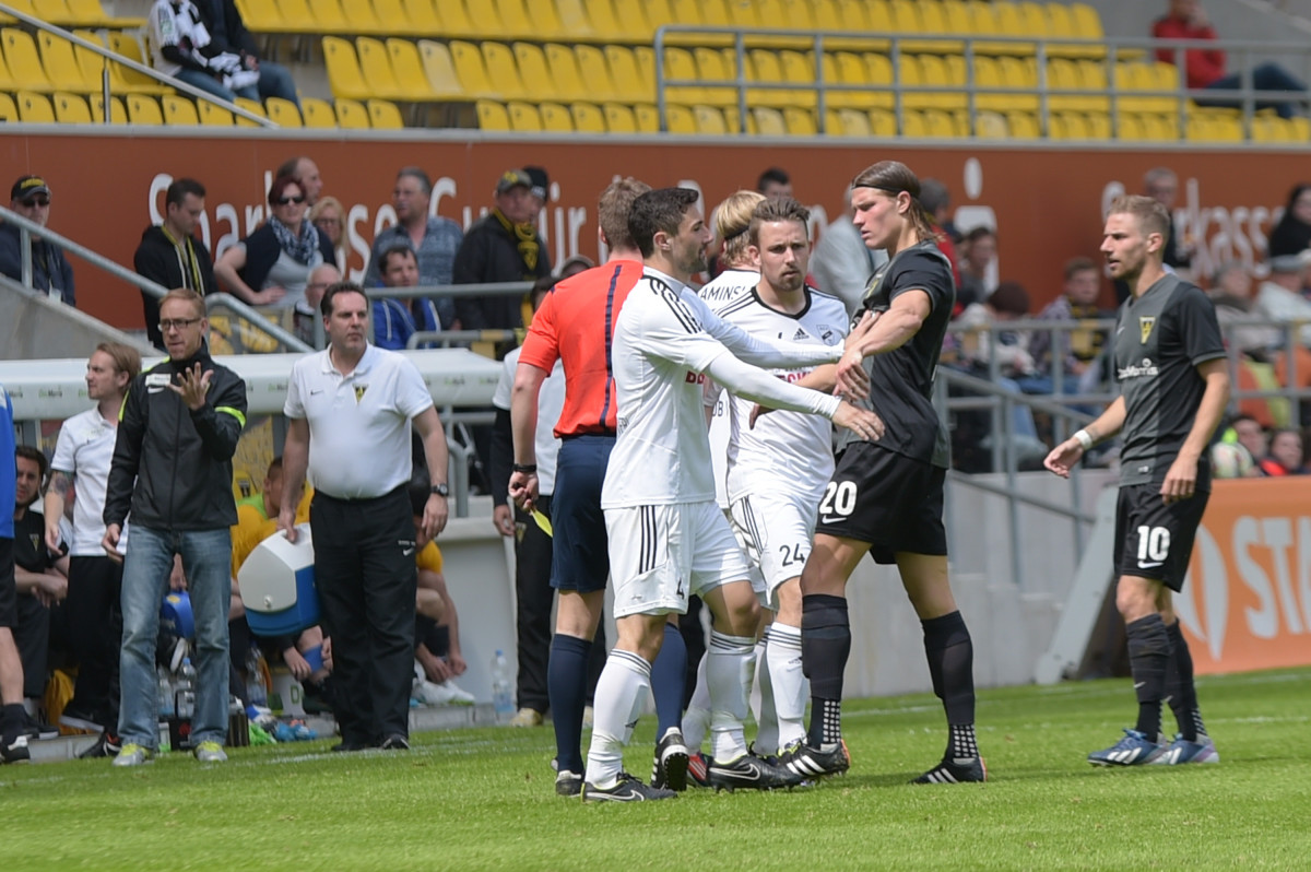 Kurz nach Wiedergebinn wurde Behrens von der rechten Seite durch Dowidat in Szene gesetzt, vertändelte das Leder aber in aussichtsreicher Position (47.). Dann drang Ernst bis zur Grundlinie vor und passte nach innen. Lange warf sich dazwischen, bevor Behrens in seinem Rücken an die Kugel am (57.). Die Vorentscheidung fiel nach einer guten Stunde. Ein Einwurf von Müller landete bei Behrens, der seine Bewacher abschüttelte und Graudenz bediente, der aus kurzer Distanz leichtes Spiel hatte - 2:0 (65.). Haeder verfehlte drei Minuten später nur knapp den Anschlusstreffer, ehe es hitzig wurde. Behrens wurde verwarnt, sein Wiedersacher Al Ghaddioui wurde wegen Stoßens des Feldes verwiesen (69.). Die Gäste mussten in den letzten 20 Minuten zu zehnt auskommen. Bei den Tivoli-Kickern sah Müller die fünfte Gelbe Karte und fehlt damit beim Saisonfinale in Siegen ebenso wie Hoffmann, dem das Schicksal bereits vor der Pause ereilte. Kurz vor dem Ende des Spiels verpassten die Schwarz-Gelben einen höheren Erfolg. Ernst flankte von rechts scharf vor das Tor, doch die eingewechselten Lünenbach und Garcia schafften es aus kurzer Distanz nicht, das Leder über die Linie zu bugsieren (87.). Der Stimmung auf den Rängen tat dies keinen Abbruch. Mit viel Applaus wurde das heimstärkste Team vom besten Publikum der Liga in die Kabine verabschiedet.