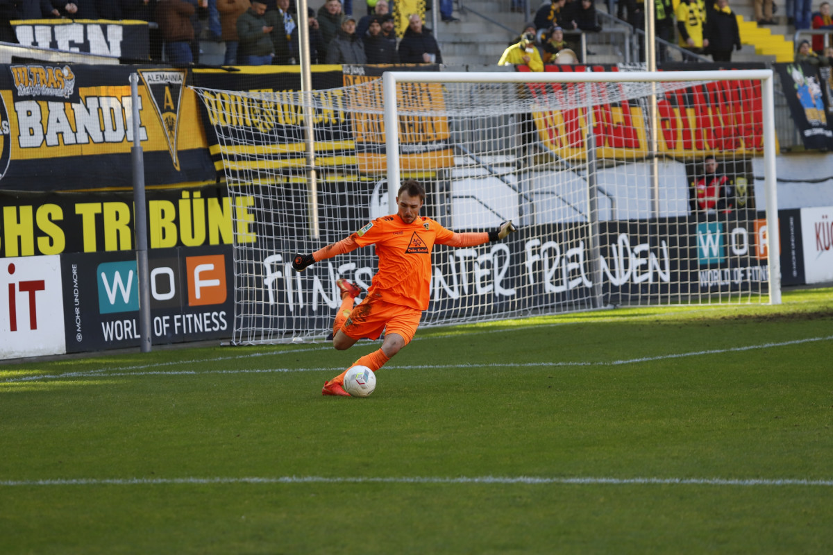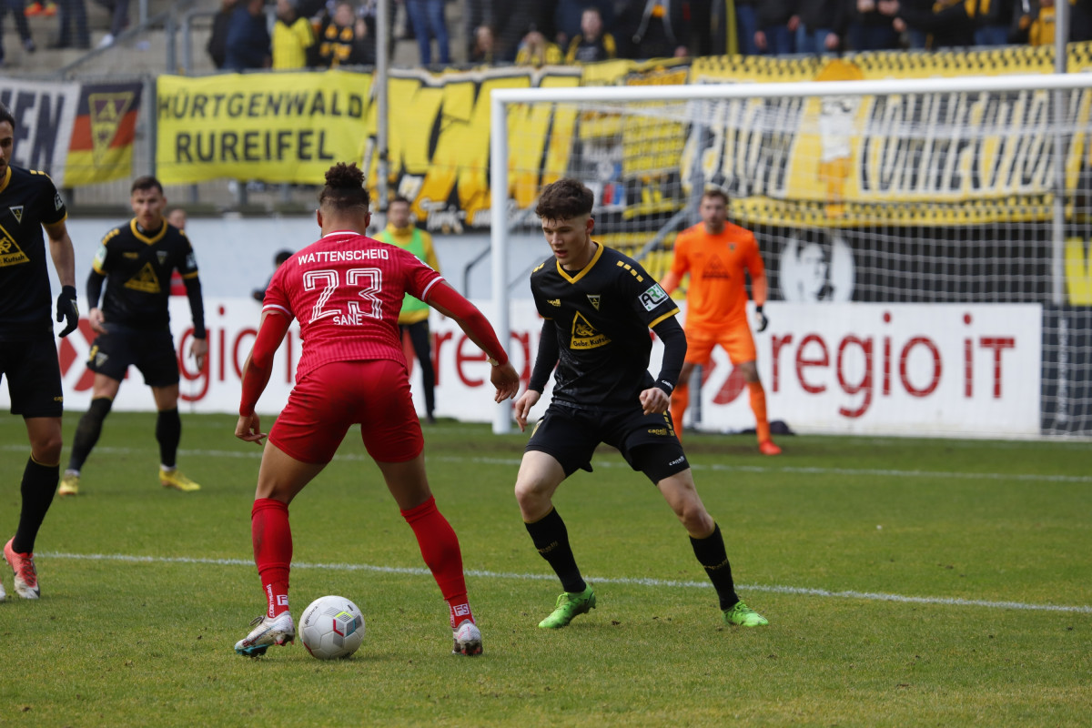 120 Minuten lagen den Spielern noch vom Pokalspiel am Mittwochabend in den Knochen. Trainer Helge Hohl wollte das Abschlusstraining abwarten, um abwägen zu können, auf wie vielen Positionen ein Wechsel nötig war. Letztlich entschied er sich, nur Lukas Wilton, der im Pokalspiel einen Bänderriss erlitten hatte, und Sebastian Schmitt eine Pause zu gönnen. Für die beiden Linksfüße kamen Benjamin Hemcke und Felix Heim ins Spiel, zudem wurde wieder auf Viererkette umgestellt. Ziel des Spiels gegen die SG Wattenscheid 09 war es, auch ergebnis-technisch wieder Kredit bei den Fans zu sammeln, nachdem die Mannschaft gegen Viktoria Köln bereits eine leidenschaftliche Leistung gezeigt hatte. Die Alemannia zeigt von Beginn an, wer Favorit war, und konnte bereits nach wenigen Minuten in Führung gehen. Franko Uzelac grätschte einen Ball weit nach vorn, dort rutschte der Verteidiger der SG09 aus und Jannik Mause konnte durchstarten. Der Stürmer der Alemannia ging an Torhüter Bruno Staudt vorbei und traf zum 1:0 (6.). Kurz darauf hatten aber auch die Wattenscheider ihre erste Möglichkeit. Marco Müller fälschte einen Schuss von Kim Sané noch gefährlich neben das Tor ab (8.). In den nächsten Minuten kombinierte sich die Alemannia mehrmals schön durch. Eine Kombination über Mause und Heim landete bei Held, dessen Schuss allerdings geblockt wurde (13.). Den anschließenden Eckstoß köpfte Aldin Dervisevic knapp neben das Tor (14.). Nach gespielten Minuten trauten sich auch die Gäste zunehmend mehr zu, es blieb aber oft bei offensiven Ansätzen, die durch Abseitsstellungen oder zu ungenauen Pässen nicht ganz ausgespielt werden konnte. Die Alemannia kam zu weiteren Möglichkeiten, erzielte aber nicht das zweite Tor. Zunächst spielte Heim einen starken Diagonalball auf Mause. Seinen Abschluss konnte Staudt aber halten (34.). Auch bei der nächsten Aktion war Heim beteiligt. Ramaj eroberte den Ball und spielte auf die Nummer 25 der Schwarz-Gelbe. Der trieb den Ball nach vorne und versuchte es selbst, landete abgefälscht aber neben dem Tor (37.). Auf der Gegenseite kam Johnen nach einem langen Ball aus dem Tor, konnte Sané noch stören, den Ball aber nicht richtig klären – der Ball landete bei Simon Roscher. Johnen rannte zurück ins Tor, der Schuss von Roscher ging aber über das Tor (38.).