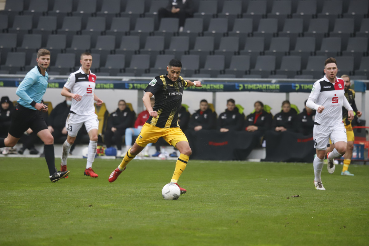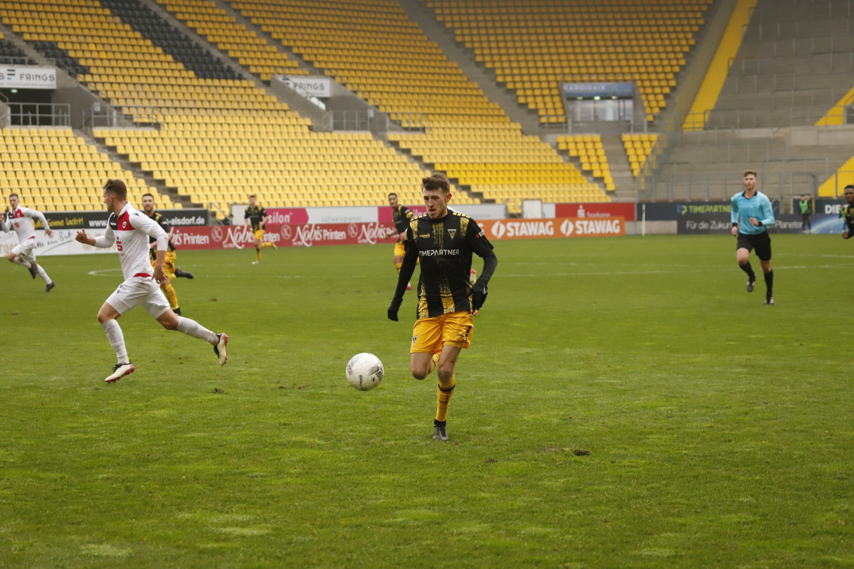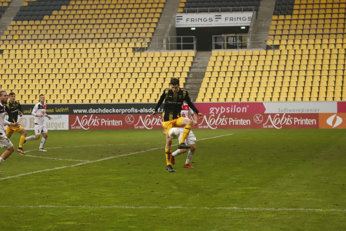 Trainer Fuat Kilic schickte gegen die Westfalen vier Neuzugänge von Beginn an aufs Feld – neben Schmitt starteten auch Alexander Heinze, Selim Gündüz und Tim Korzuschek. Vom Anpfiff weg legten die Mannen in Schwarz und Gelb einen aufopferungsvollen Auftritt an den Tag, nicht zuletzt Gündüz und Korzuschek belebten das Offensivspiel der Gastgeber merklich. Die erste dicke Gelegenheit der Partie hatte dann allerdings doch das Team von Trainer Felix Bechtold: Nach einem langen Ball aus der eigenen Hälfte verschätzte sich die Aachener Hintermannschaft kollektiv, plötzlich war Marvin Mika frei durch. Alleine vor Alemannia-Keeper Joshua Mroß zeigte der Stürmer der Gäste jedoch Nerven und schob den Ball am rechten Pfosten vorbei (14.). Die Hausherren zeigten sich von diesem ersten Schreck wenig beeindruckt, zogen weiter ihr Spiel auf und kamen ihrerseits zur ersten Großchance: Dino Bajric wurde von Hamdi Dahmani freigespielt, zielte jedoch frei vor SVL-Torwart Christopher Balkenhoff zu zentral – eine hundertprozentige Möglichkeit auf das 1:0 (19.). In der Folge kamen die Lippstädter etwas besser in die Partie und schafften es, die bissig auftretenden Alemannen weitestgehend vom eigenen Tor wegzuhalten – bis zur 34. Minute. Da fand eine scharfe Hereingabe von Marco Müller von rechts zunächst keinen Abnehmer, Schmitt rauschte im Rückraum heran und hämmerte die Kugel zur 1:0-Führung unter den Querbalken – keine Chance für Balkenhoff.