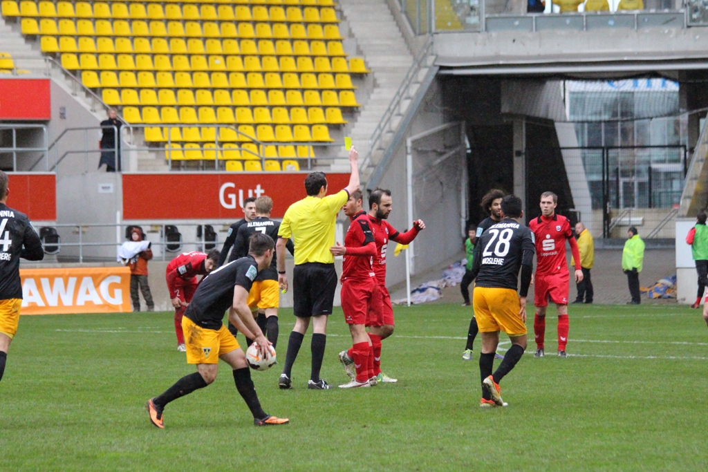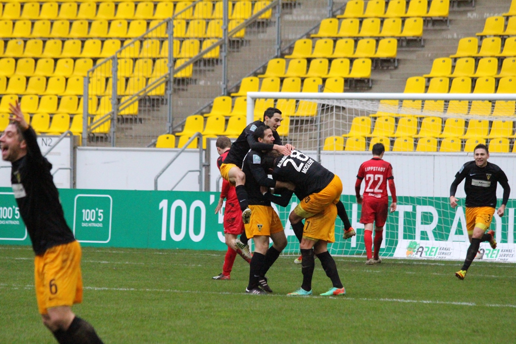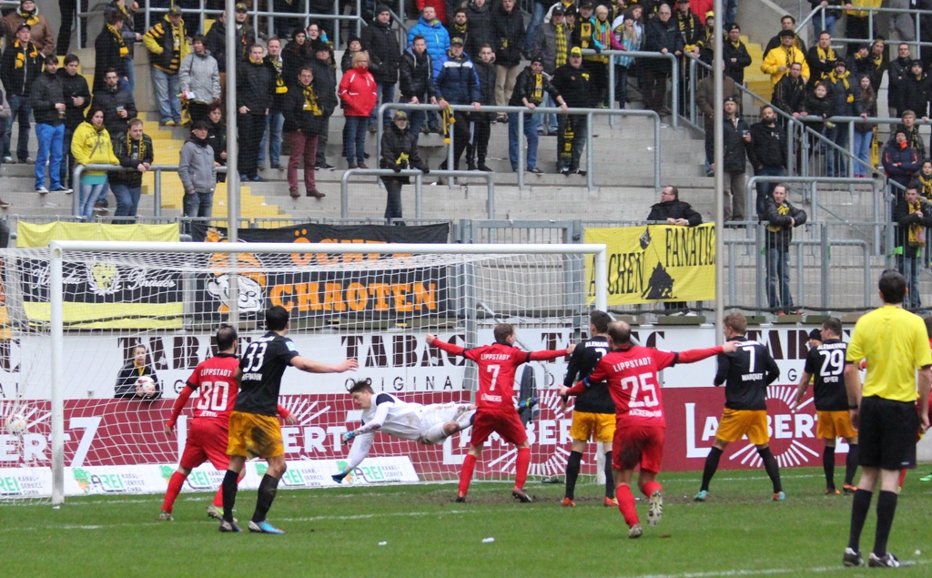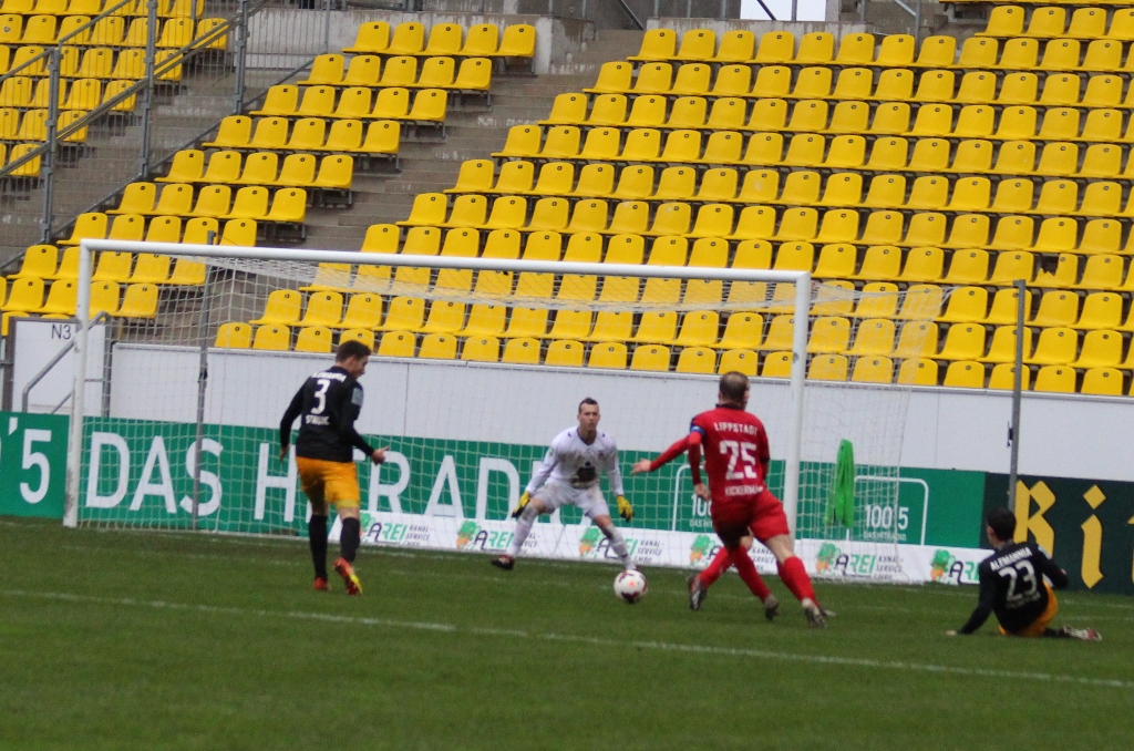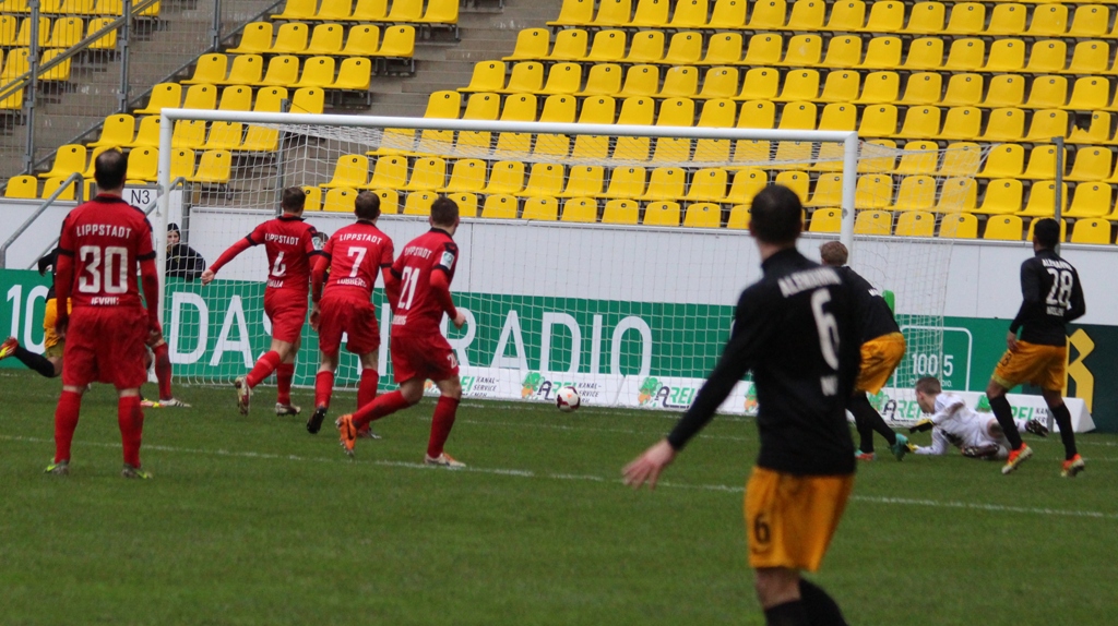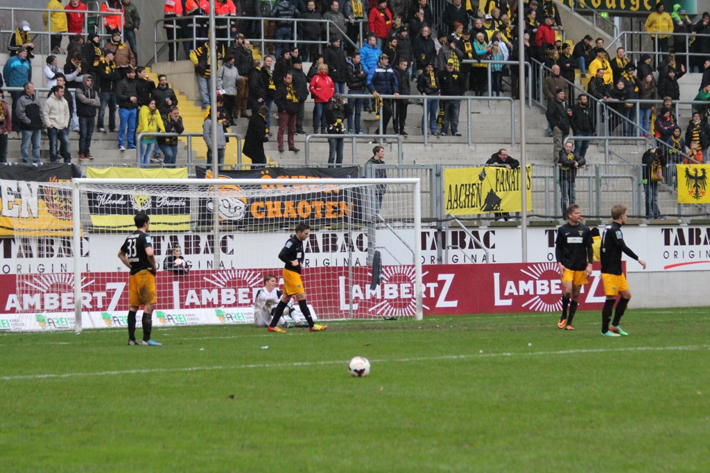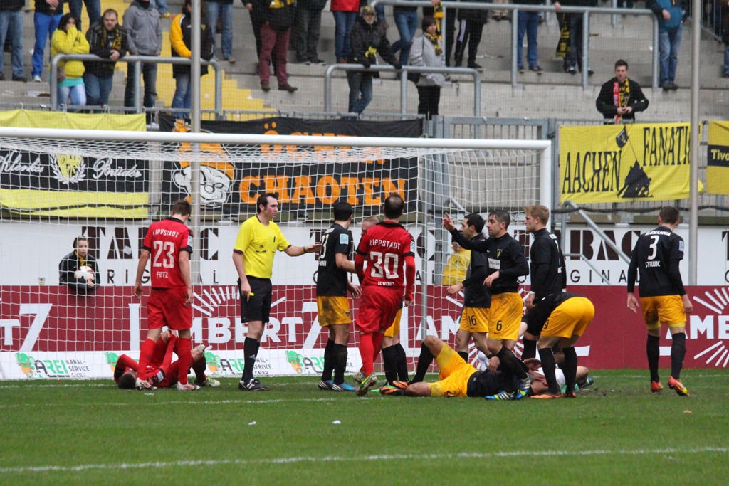 Nach 16 Minuten hätte Lippstadt eigentlich in Führung gehen müssen. Meier legte im Strafraum für Sturmpartner Traufetter auf, der das leere Tor vor sich hatte und aus drei Metern verzog. Keine zwei Minuten später holten die abstiegsbedrohten Gäste ihr Versäumnis nach. Die Aachener Abwehr bekam den Ball nicht aus der Gefahrenzone und nach einer Kopfballvorlage von Jevric stocherte Fritz die Kugel aus kurzer Distanz vorbei an Löhe - 0:1 (18.). Die Schwarz-Gelben zeigten sich fortan bemüht, doch mehr als ein Distanzschuss von Neppe (34.) und einen Freistoß von Abel (45.), die das Gehäuse jeweils um einen knappen Meter verfehlten, musste Lippstadt nicht an Torgefahr über sich ergehen lassen. Zwei Minuten vor dem Pausenpfiff hätten die Gäste dafür fast ein weiteres Mal zugeschlagen, doch Meier setzte seinen Flugkopfball nach einer Flanke von der rechten Seite knapp links neben das Aachener Tor.