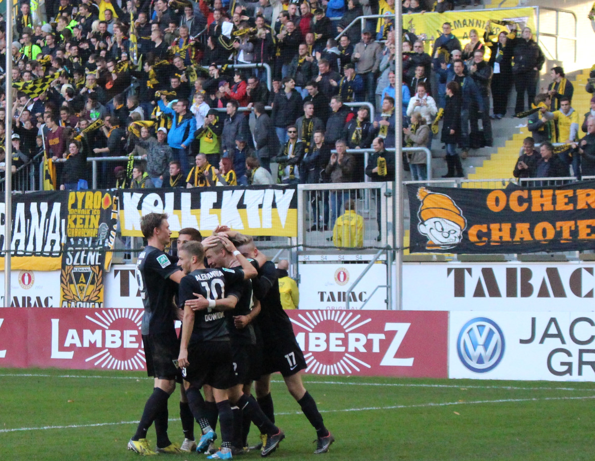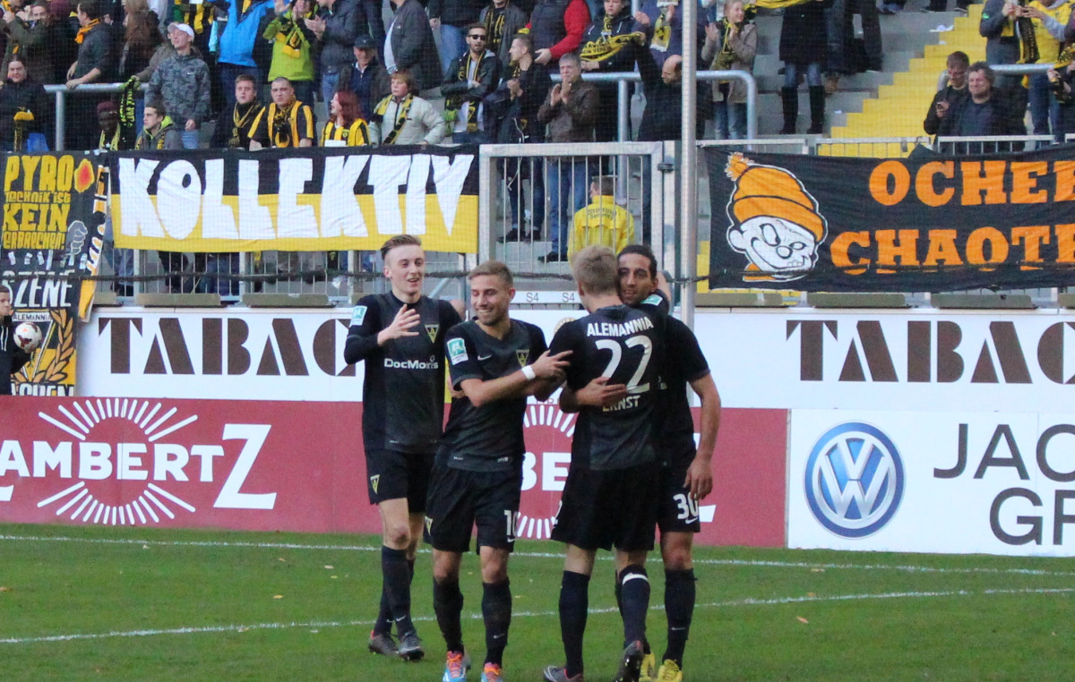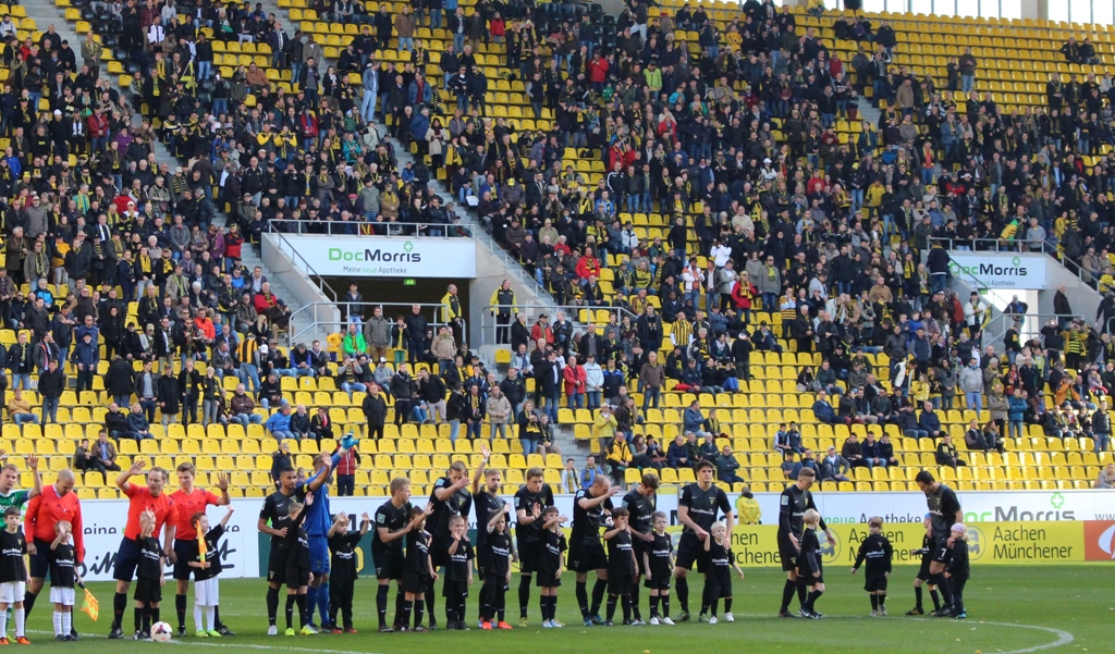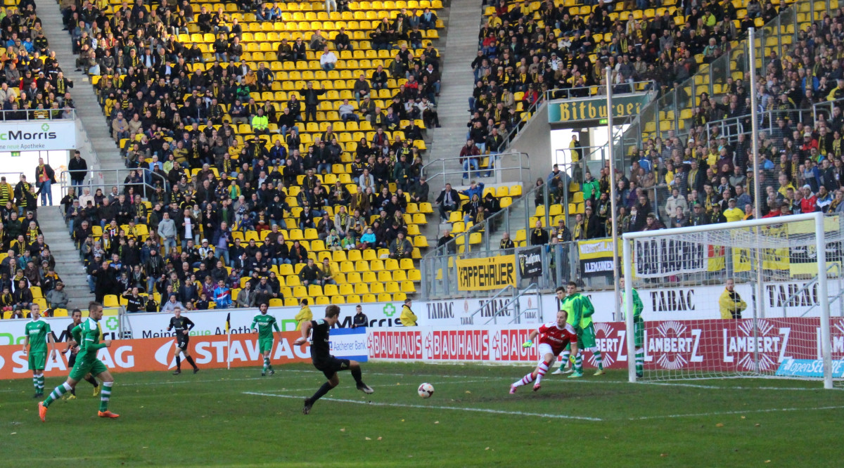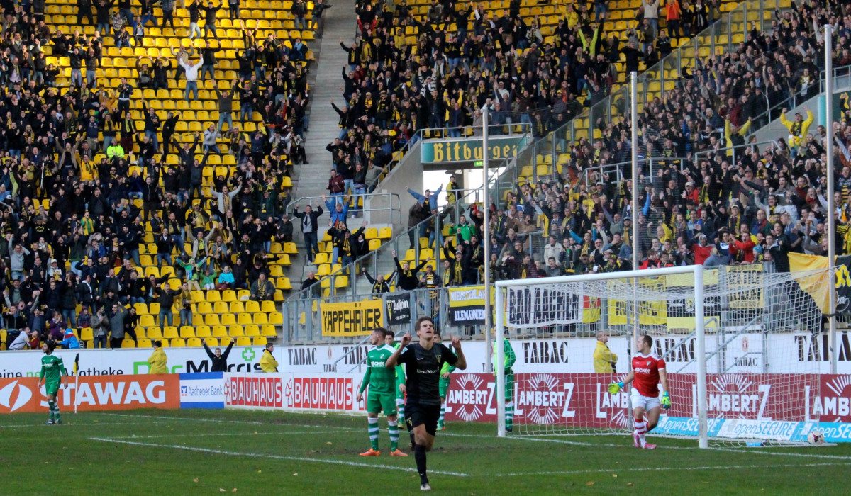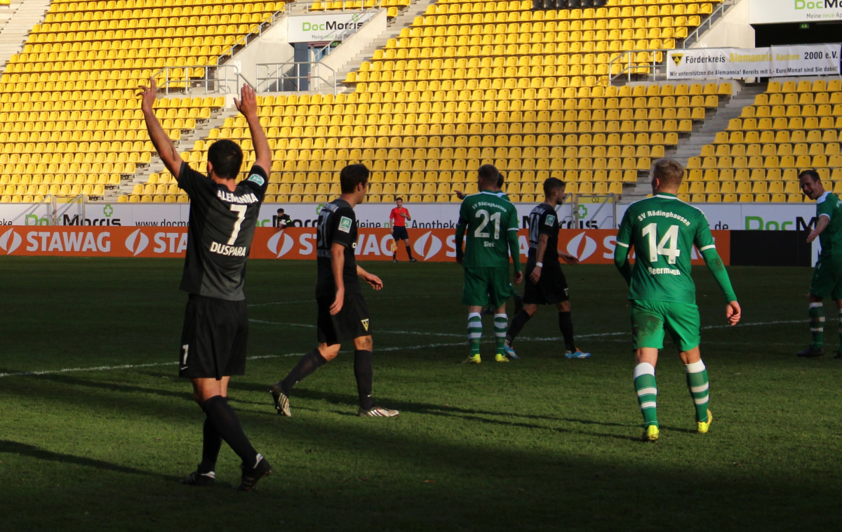„Oh, wie ist das schön“, sangen 8.400 Fans unmittelbar nach dem Ende des Duells gegen den SV Rödinghausen auf dem Tivoli. Geduldig hatten die Alemannen gegen einen starken Aufsteiger aus Ostwestfalen auf ihre Chancen gewartet und dann in den entscheidenden Momenten zugeschlagen. Durch das 3:0 (1:0) übernahmen die Schwarz-Gelben zumindest bis morgen die Tabellenführung in der Regionalliga West.
