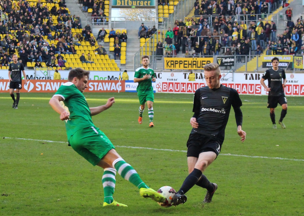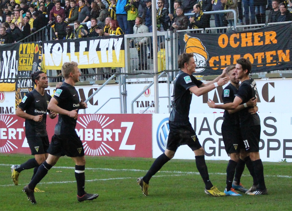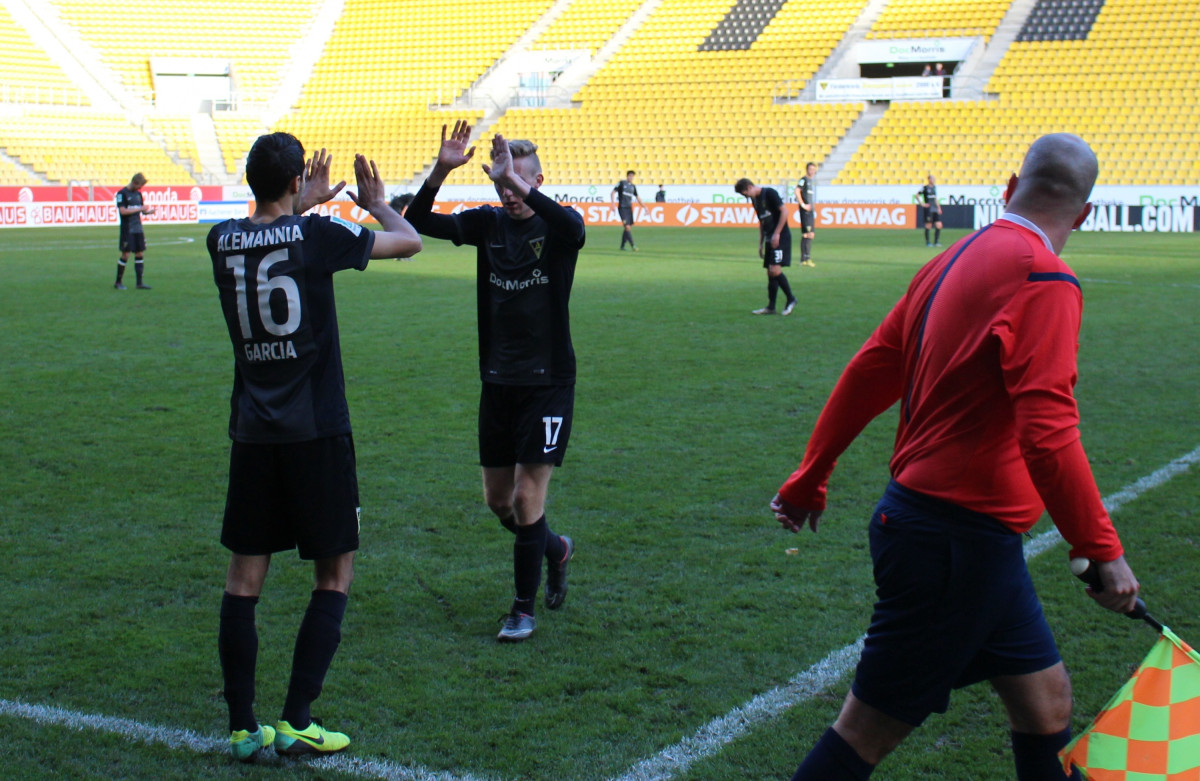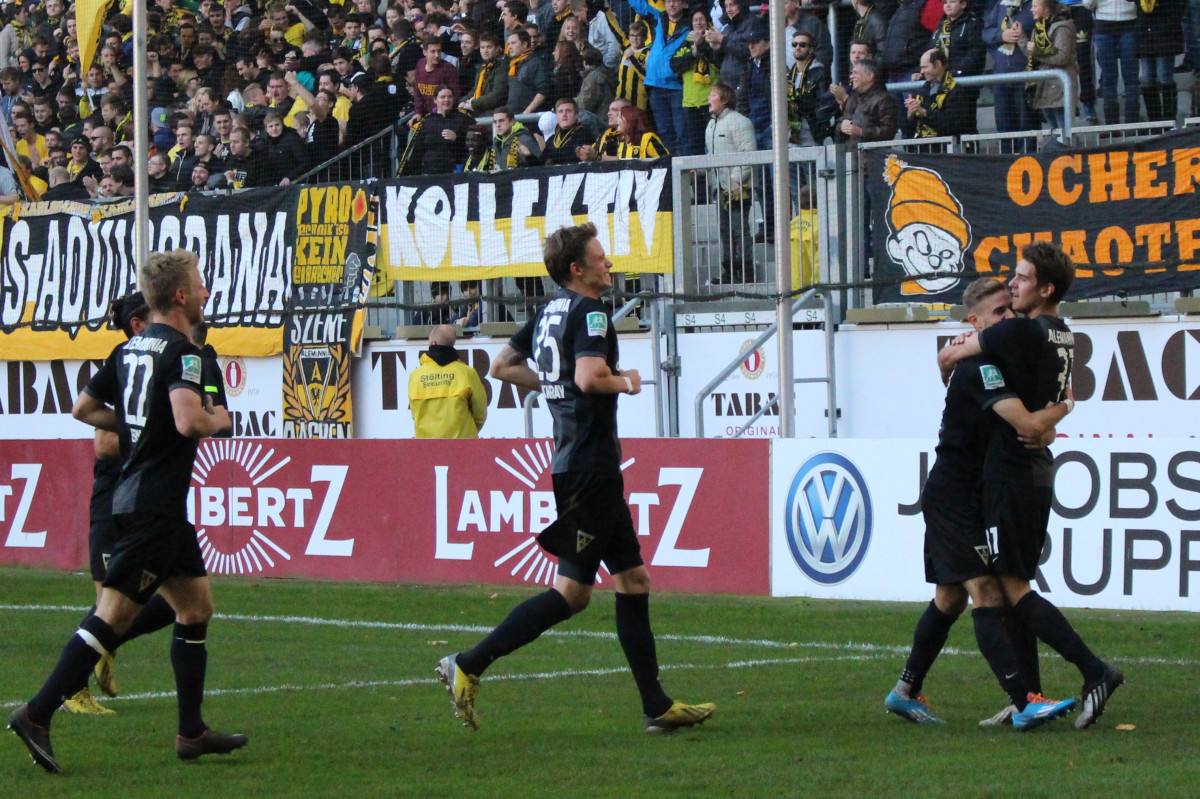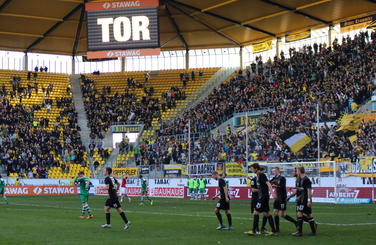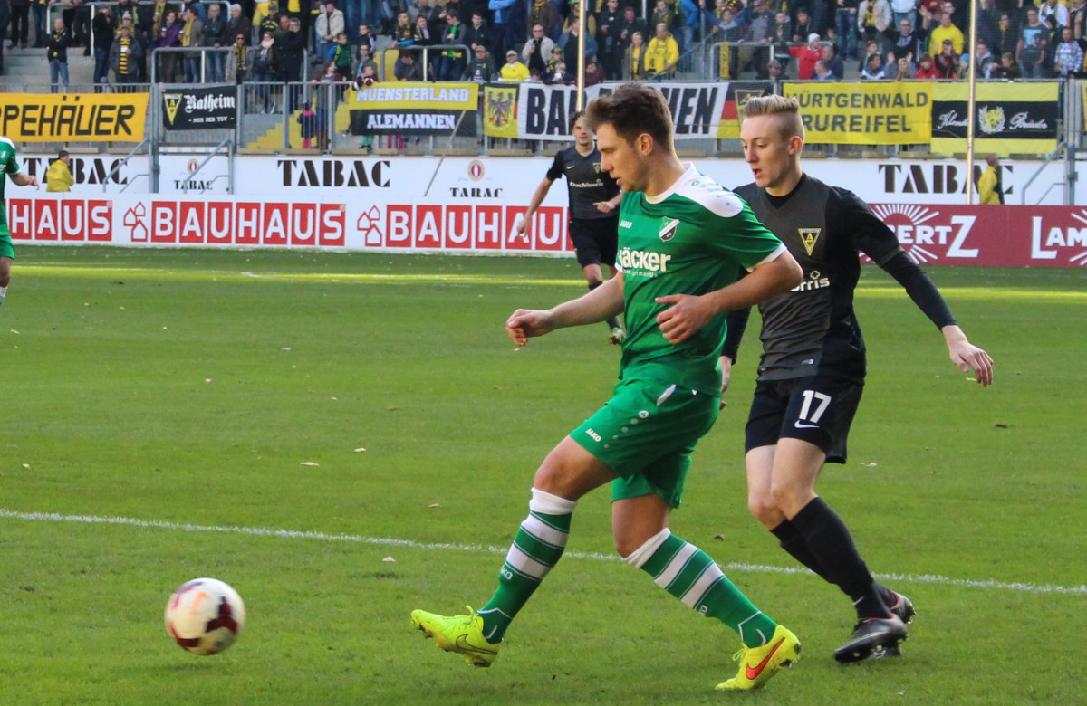 „Oh, wie ist das schön“, sangen 8.400 Fans unmittelbar nach dem Ende des Duells gegen den SV Rödinghausen auf dem Tivoli. Geduldig hatten die Alemannen gegen einen starken Aufsteiger aus Ostwestfalen auf ihre Chancen gewartet und dann in den entscheidenden Momenten zugeschlagen. Durch das 3:0 (1:0) übernahmen die Schwarz-Gelben zumindest bis morgen die Tabellenführung in der Regionalliga West.
