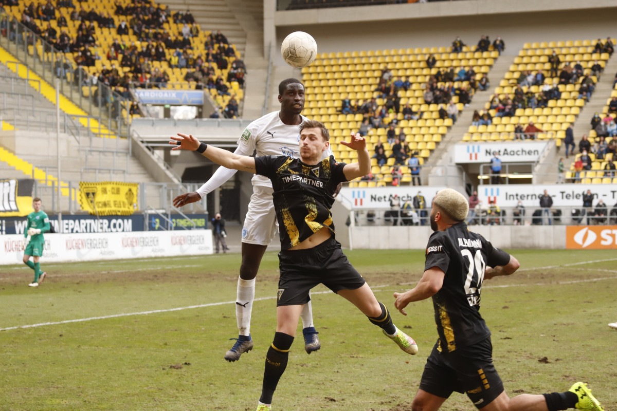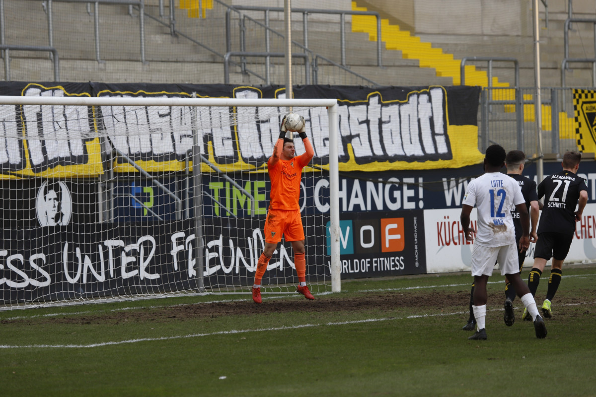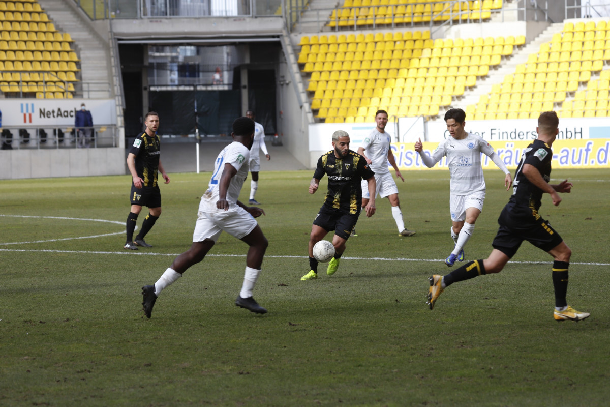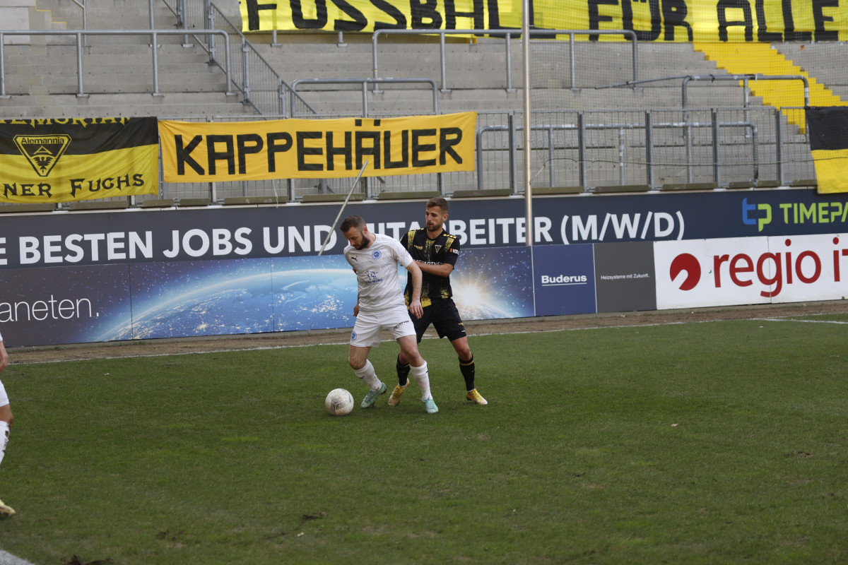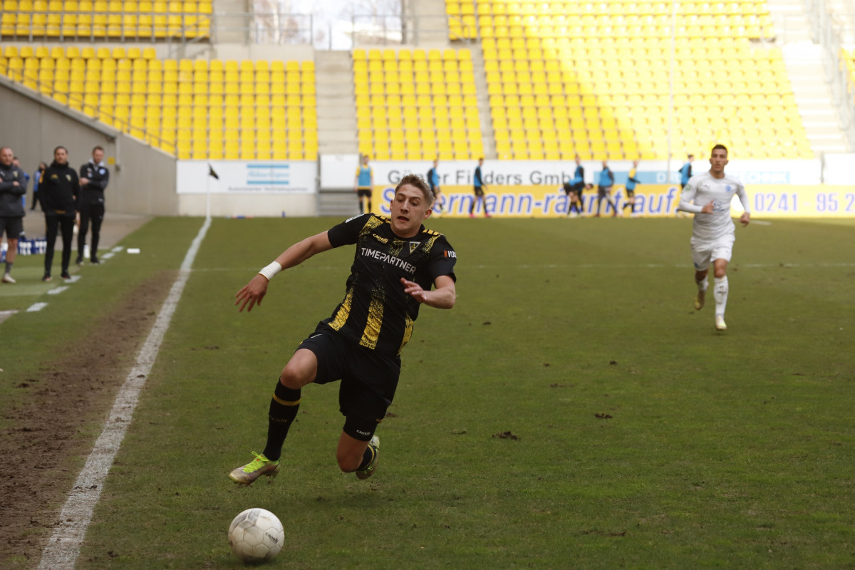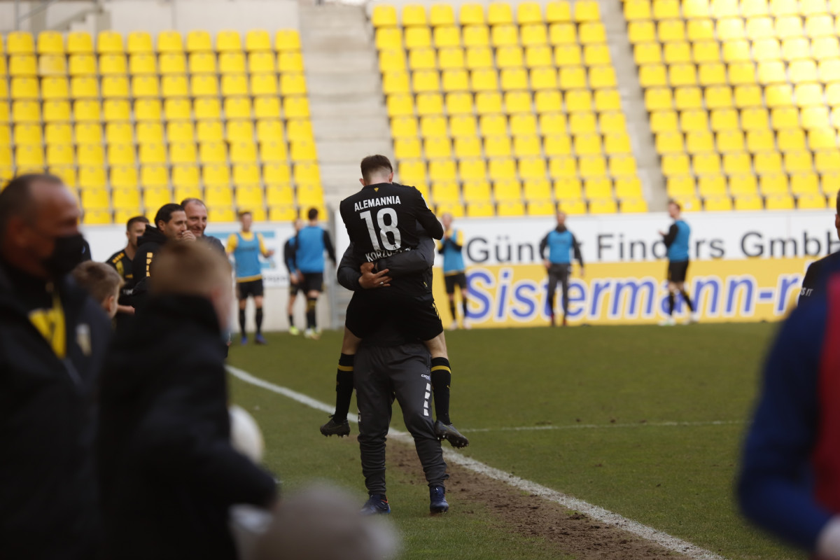 Der Tabellen-16. traf auf den 18., wieder einmal stand für die Alemannia ein Spiel gegen einen direkten Konkurrenten im Abstiegskampf an. Dieses sollte am Ende ungefähr so verlaufen, wie es im Vorfeld erwartet wurde – wacker kämpfende Gäste verlangten entschlossen auftretenden Alemannen alles ab, dennoch reichte es für die Schwarz-Gelben am Ende zu einem umjubelten 1:0-Sieg, der der Elf von Fuat Kilic im unteren Tabellendrittel wieder etwas Luft verschafft. Doch der Reihe nach. Für die Partie gegen die Westfalen hatte der Trainer sein Team auf fünf Positionen verändert – Jannis Held, Dino Bajric, Ergün Yildiz, Ricardo Antonaci und Marcel Damaschek liefen für Lukas Wilton, den gesperrten Peter Hackenberg, Tugrul Erat, Tim Korzuschek und Hamdi Dahmani von Beginn an auf. Wieder einmal erwischte die Alemannia einen guten Start – so hatte Selim Gündüz nach bereits vier Minuten die erste Gelegenheit auf das Führungstor, als er eine Flanke von Marco Müller mit der Brust aufs Tor von Jhonny Peitzmeier brachte, der parieren konnte. In der Folge machte die Alemannia zwar das Spiel gegen offensiv schwache Gäste, richtige Torchance sprangen jedoch nicht dabei heraus. Nur Oluwabori Falaye setzte eine Flanke aus dem Halbfeld von Sebastian Schmitt noch mit dem Kopf an den Außenpfosten (19.). Weiterhin passierte nicht mehr viel in Durchgang eins, sodass Kilic nach der Partie urteilte: „Mit der ersten Halbzeit kann ich so nicht zufrieden sein.“