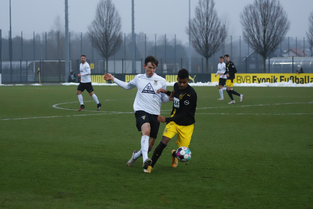 Die Anfangsphase gehörte allerdings den spielstarken Hausherren, die auch körperlich gut zur Sache gingen. Während die Alemannen nach einem Einsteigen gegen Boesen vergeblich auf einen Freistoßpfiff spekulierten, verlagerte der Tabellenzweite die Kugel auf die rechte Seite. Duman verpasste die Hereingabe von Tachie, doch am langen Pfosten lauerte Knauff und vollendete aus sechs Metern zum 1:0 (11.). Nach dem frühen Rückstand stabilisierten sich die Kaiserstädter in der Defensive und es dauerte bis zur 29. Minute, ehe der BVB-Nachwuchs zur nächsten Torchance kam. Torschütze Knauff setzte sich am linken Flügel durch und seine Ablage hämmerte Broschinski aus zehn Metern über das Tor. Wenig später kam die Alemannia zum überraschenden Ausgleich. Eine Rechtsecke von Batarilo wurde in den Rückraum abgewehrt, Aydogan nahm die Kugel an der Strafraumgrenze volley und die Kugel zappelte noch leicht abgefälscht im rechten Eck - 1:1 (31.). Die Alemannia roch nun Lunte und hatte zwei Minuten später sogar die Führung auf dem Fuß. Über Gaedicke und Uchino kam das Leder zu Dahmani, der die Kombination knapp links am Kasten vorbei abschloss (33.). Die Karten waren rechtzeitig für den zweiten Durchgang neu gemischt.