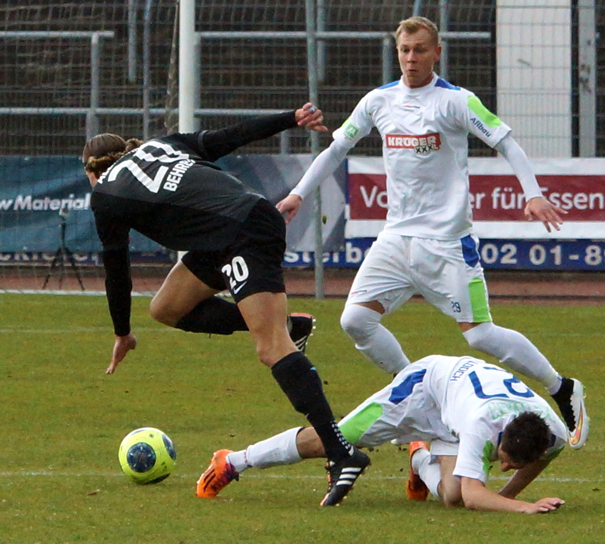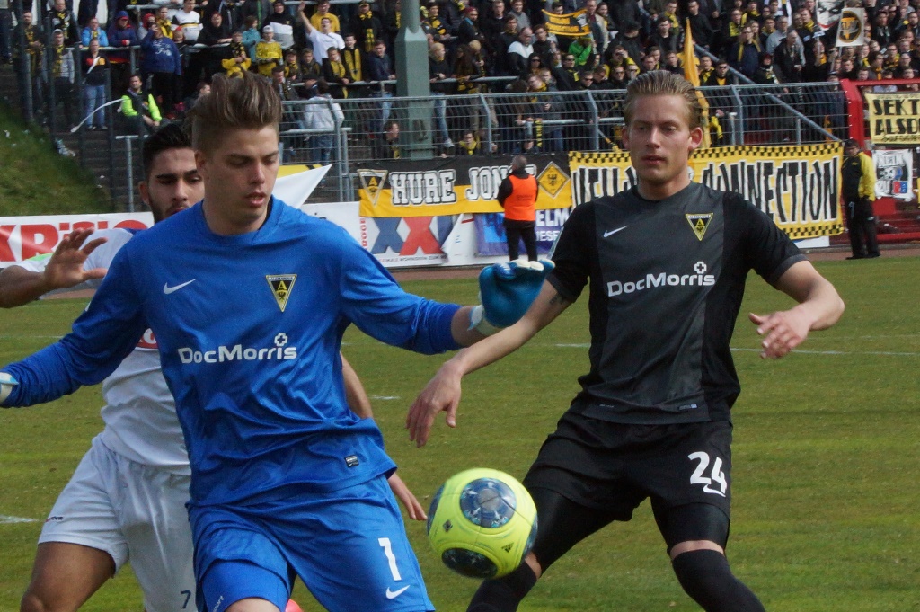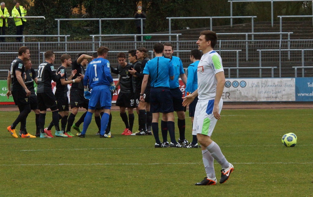Bei der Alemannia wurde der gelbgesperrte Michael Lejan durch Tobias Mohr ersetzt. Außerdem waren Marcus Hoffmann, Peter Hackenberg und Dennis Dowidat nach dem Pokalaus in Bonn wieder mit von der Partie. Da Spitzenreiter Borussia Mönchengladbach II am Vortag vorgelegt hatte, standen die Schwarz-Gelben beim Liganeuling unter Zugzwang. Kray bot wie bereits beim 1:1 im Hinspiel eine 5-4-1-Formation auf, gegen die es den Schwarz-Gelben viel zu selten gelang, in die Tiefe zu spielen. Auch das Umschaltspiel wirkte pomadig, wodurch die Gastgeber ihren Fünf-Mann-Abwehrriegel immer wieder formieren konnten. So resultierte die einzige bessere Gelegenheit des ersten Spielabschnitts aus einem ruhenden Ball. Jerat zog nach 16 Minuten einen Freistoß auf den langen Pfosten, Meier legte per Kopf und Behrens sowie im Nachsetzen Demai fanden kein Durchkommen im Krayer Abwehrbollwerk. Ohne Tore bat Schiedsrichter Steffens die 22 Akteure zum Pausentee.