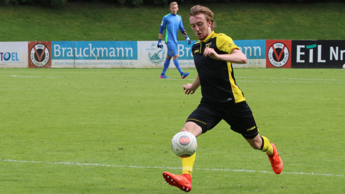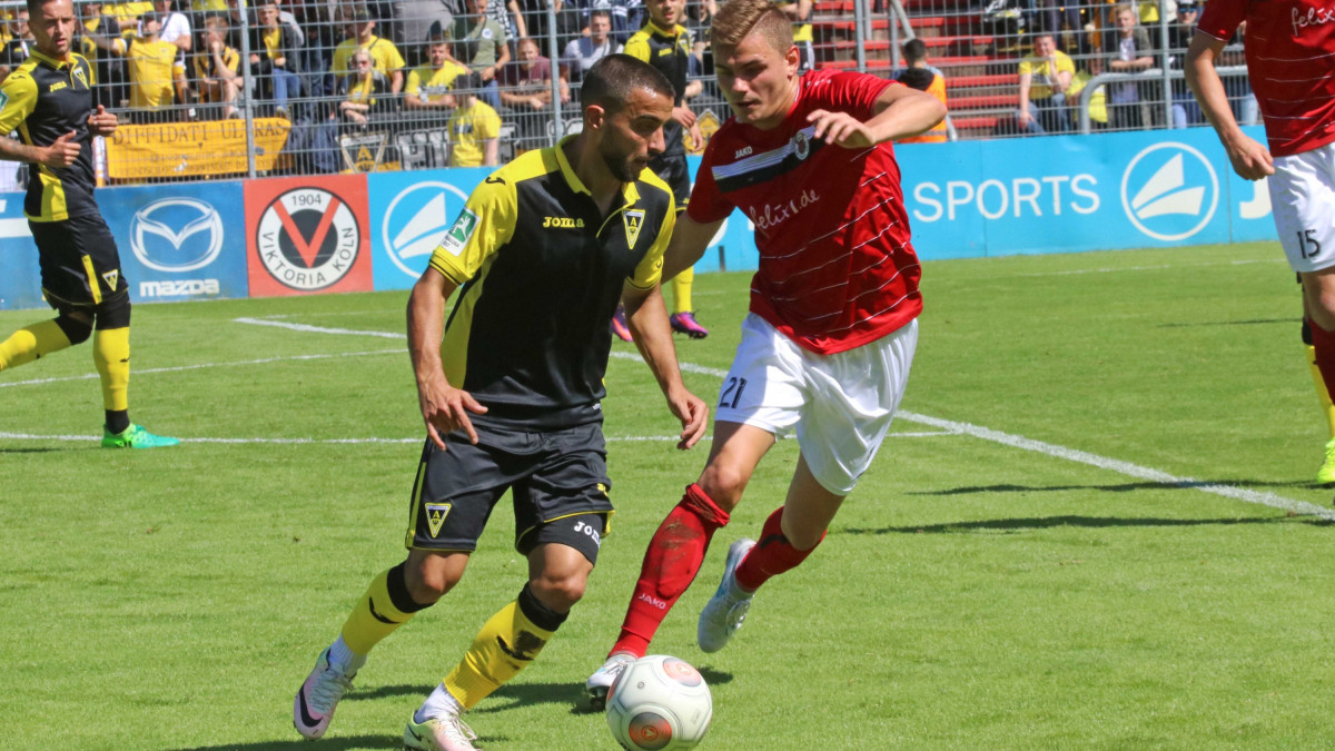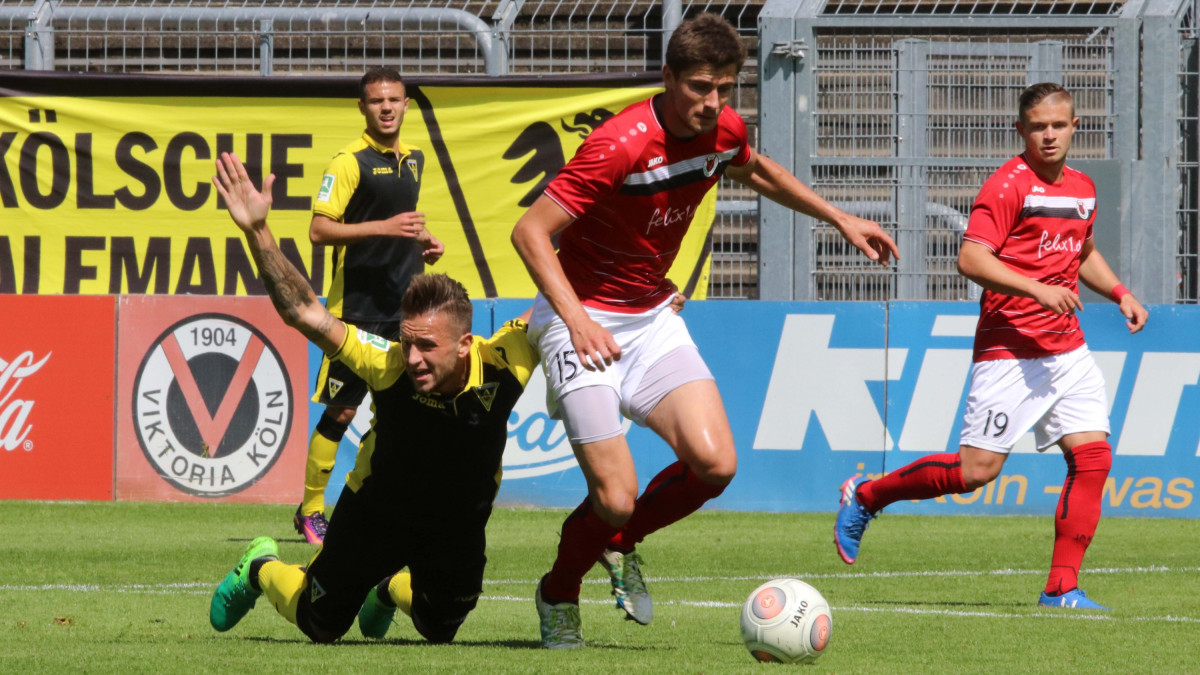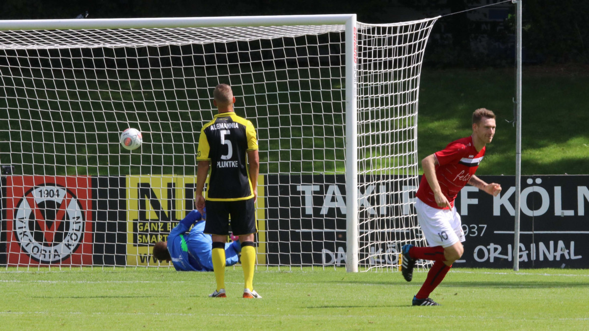 Fuat Kilic änderte seine Startformation auf zwei Positionen. David Pütz, in der Vorwoche angeschlagen, ersetzte den verletzten Tobias Lippold. Außerdem erhielt Ilias Azaouaghi den Vorzug gegenüber Daniel Hammel. Rund 1.500 Anhänger hatten die Alemannia auf die rechte Rheinseite begleitet. Die Tivoli-Kicker fanden zunächst gut in die Partie und kamen zu vielen Ballgewinnen in der gegnerischen Hälfte. So ging die erste gute Gelegenheit auch auf das Konto der mutigen Aachener. Mohr flankte von links, Torunarigha stieg zum Kopfball, doch der ging einen knappen Meter drüber (16.). Wenig später tauchten die Gastgeber erstmals gefährlich vor dem Aachener Gehäuse auf. Eine Wallenborn-Flanke von der linken Seite fiel vor die Füße von Rüzgar, der aus 17 Metern abzog. Das Leder wurde knapp neben den rechten Pfosten abgefälscht (18.). Die Schwarz-Gelben schalteten weiter gut um. Fejzullahu flankte von rechts. Pütz kam mit dem Kopf nicht an den Ball und in seinem Rücken konnten die Gastgeber vor Torunarigha zur Ecke klären (23.). Etwas überraschend ging der amtierende Meister nach 28 Minuten in Führung. Wallenborn und Heinze duellierten sich im Sechszehner. Der Kölner kam zu Fall. Schiri Heien zögerte keine Sekunde und deutete auf den Punkt. Wunderlich lief an und ließ Depta keine Abwehrchance – 1:0. Nur vier Minuten später baute Köln seinen Vorsprung aus. Wunderlich packte den Zirkel bei einem Freistoß aus 25 Metern Maß genau aus und traf zum 2:0 ins linke Eck (32.). Die Alemannia schüttelte sich kurz und fightete sich in die Partie zurück. Mohr schlug eine Linksflanke in den Strafraum, Fejzullahu lief ein und markierte mit einer Direktabnahme aus sechs Metern den 2:1-Anschlusstreffer (39.). Zwei Minuten später flankte Winter von rechts, Torunarigha kam zum Kopfball, doch Viktoria-Keeper Patzler war rechtzeitig im bedrohten Eck (41.). Trotz des knappen Pausenrückstands durften sich die Alemannen im zweiten Durchgang wieder etwas ausrechnen.