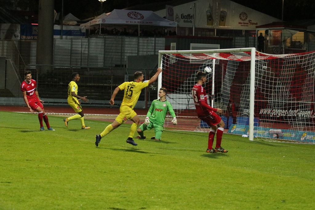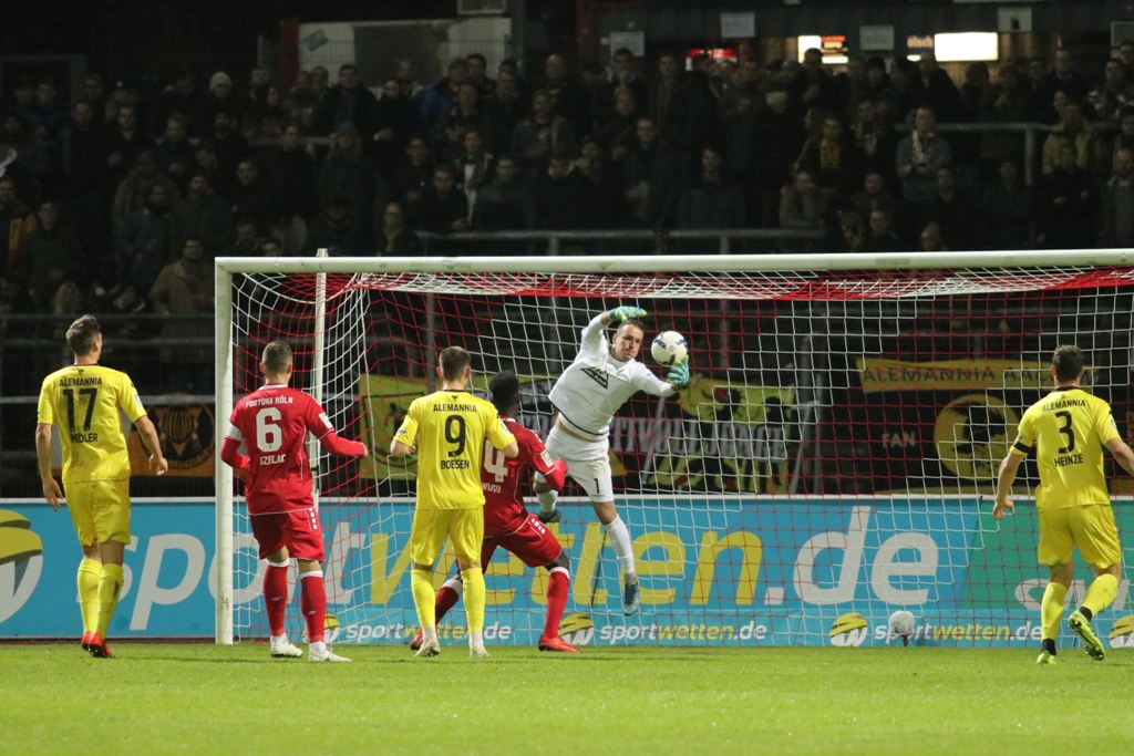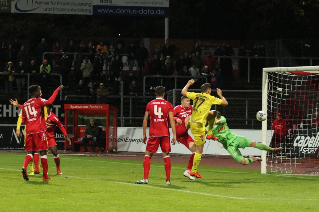 Die Alemannia ist zum Abschluss des 16. Spieltags in der Regionlliga West zu einem Teilerfolg gekommen. Bis zur 83. Minute lag das bessere Team vor 2.613 Zuschauern bei Fortuna Köln mit 0:1 hinten, ehe Marco Müller mit seinem ersten Pflichtspieltreffer im Dress der Schwarz-Gelben noch einen verdienten Zähler rettete.