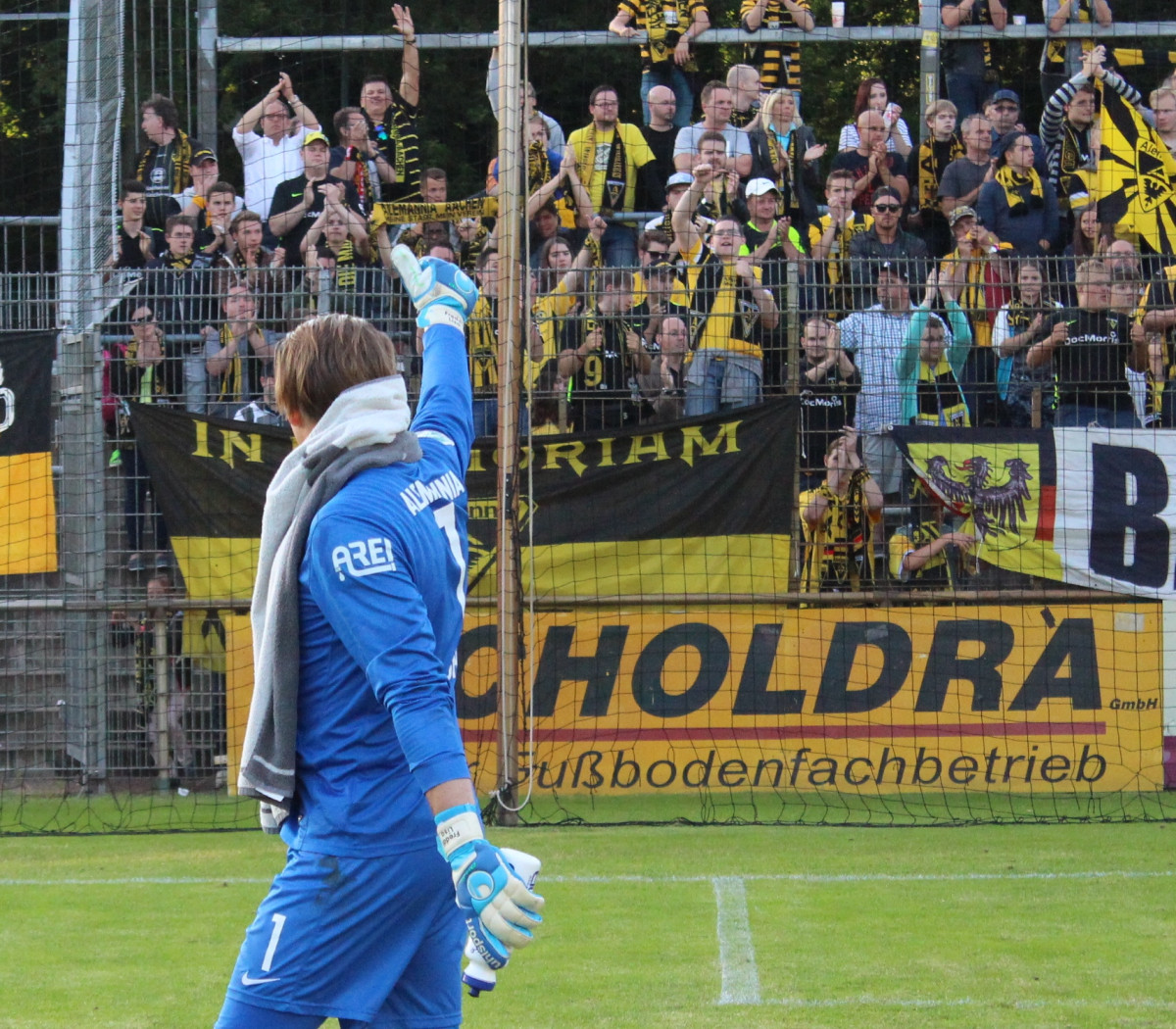 Fanutensilien: Erlaubt sind kleinen Fahnen und Doppelhalter bis 1,50m Stocklänge, Trommeln (einseitig einsehbar), Zaunfahnen (Aufhängung in Absprache mit dem Ordnungsdienst) und 1 Megaphon. In begrenzter Anzahl nach Absprache erlaubt sind Schwenkfahnen mit Stocklänge > 1,50m. Große Schwenkfahnen, Spruchbänder und evtl. Choreos bitte unter fanbetreuung@alemannia-aachen.de anfragen.