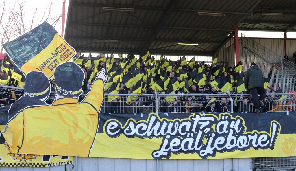 Erlaubt sind Zaunfahnen, Schwenkfahnen und Trommeln (einseitig offen). Zaunfahnen müssen von der Laufbahn aus am Zaun befestigt werden und dürfen nicht mit in den Block genommen werden.
