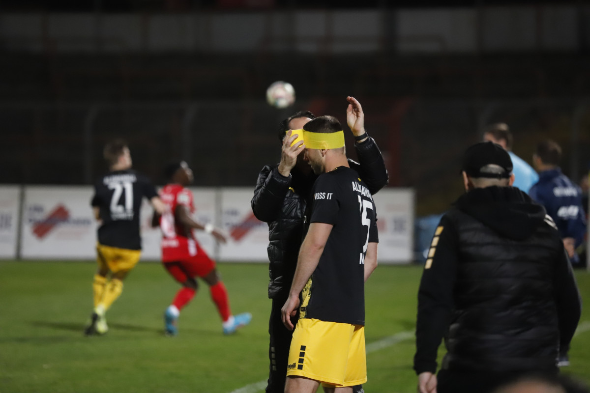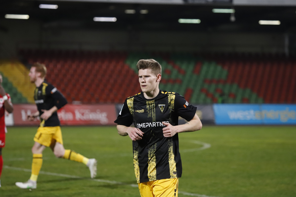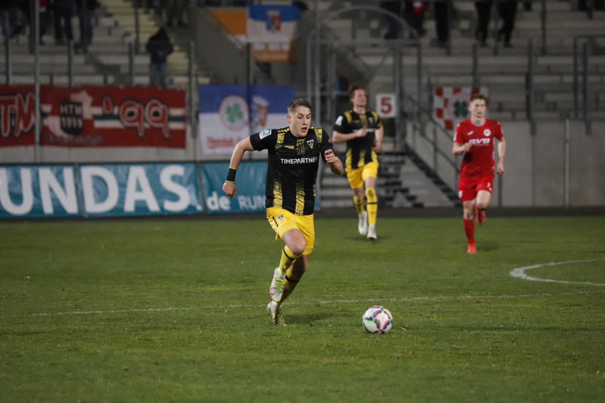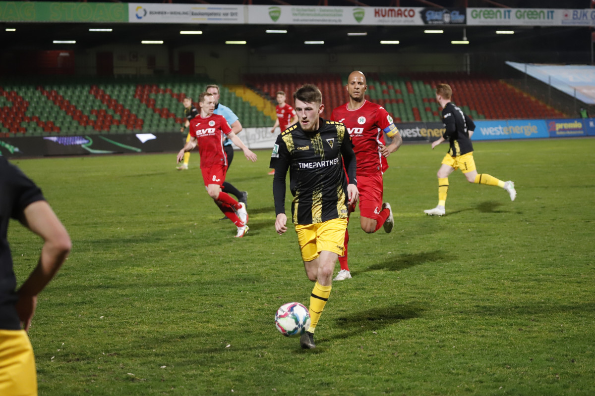 Nach sieben Spielminuten dann eine unschöne Szene: Fabian Holthaus traf Marco Müller mit gestrecktem Bein am Kopf, sodass dieser sich eine Kopfverletzung zuzog und mit Turban weiterspielen musste. „Die Ärzte haben Gott sei Dank nach dem Spiel Entwarnung gegeben“, berichtete Kilic später. In der Folge fand dann auch der Tabellenfünfte so langsam in das Duell hinein – und wenn du ihn vorne nicht machst, fängst du ihn dir hinten, lautet eine allseits bekannte Fußball-Floskel. Das dachte sich auch Klaß, der in der 19. Minute nach einer Slapstick-Einlage der Aachener Hintermannschaft, die einen Freistoß partout nicht geklärt bekam, auf den zweiten Ball spekulierte und trocken abzog – das Leder passte genau zwischen Schlussmann Joshua Mroß und den linken Pfosten. Die Hausherren verdienten sich die 1:0-Führung im Anschluss durch das Erspielen von weiteren Großchancen. Propheter (20.), Shaibou Oubeyapwa (23.) und abermals Propheter nach Torwartfehler von Mroß (33.) verpassten es aber, zu erhöhen. So ging es mit einem knappen Vorsprung für die Kleeblätter in die Kabine.