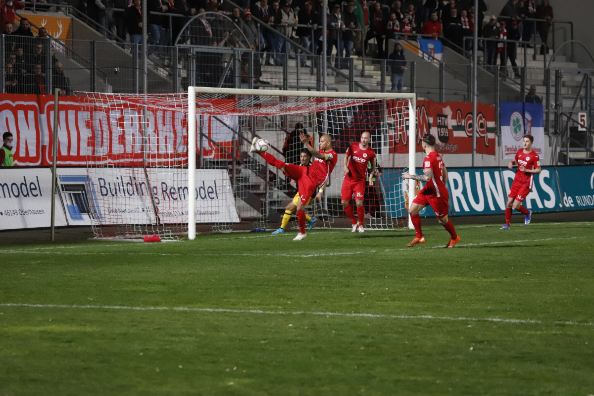 „Von Beginn an hellwach sein“ – diese Marschroute hatte RWO-Coach Mike Terranova seiner Mannschaft für das Heimspiel gegen die Alemannia mit auf den Weg gegeben, wie er im Anschluss an das 92. Traditionsduell zwischen beiden Teams verriet. Verinnerlichen sollten diese Devise dann allerdings nur die Spieler seines Gegenübers Fuat Kilic – die auf vier Positionen veränderten Kaiserstädter, die von etwa 400 Anhängern nach Oberhausen begleitet wurden, legten auf fremdem Terrain los wie die Feuerwehr. Nach gerade einmal vier Minuten schaufelte Sebastian Schmitt einen Freistoß von der linken Seite in den Strafraum, den Tanju Öztürk gefährlich an die eigene Querlatte verlängerte. Glück für die Terranova-Elf, die nur eine Zeigerumdrehung später noch einmal durchpustete, als Korzuschek die Kugel frei vor Torwart Justin Heekeren über diesen lupfte – im letzten Moment kratzte Ex-Alemanne Jerome Propheter das Spielgerät von der Linie. Direkt zu Beginn zwei Großchancen für den vermeintlichen Außenseiter, der von Anfang an versuchte, Dampf in die Partie zu bringen.