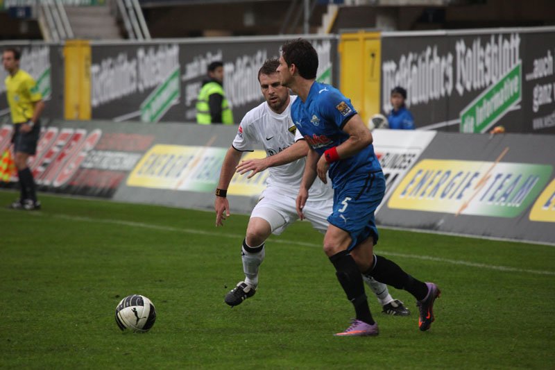 Vier Minuten später dann die bis dato verdiente Führung für die Schwarz-Gelben: Erneut brachte Lasnik eine gute Ecke von links hinein. Seine Hereingabe fand den Kopf von Thomas Stehle, der gleich in seinem ersten Spiel von Beginn an zum 1:0 per Kopf traf und Keeper Jensen sogar noch tunnelte (39.). Die letzte Gelegenheit des ersten Durchgangs gehörte jedoch den Gastgebern: Wieder war es Daniel Brückner, der einen Flankenball von links schlug. Rolf-Christel Guié-Mien setzte sich im Kopfballduell gegen Jepsen durch und verfehlte das Gehäuse nur knapp (44.). Kurz darauf pfiff Schiedsrichter Kempter den ersten Durchgang ab.