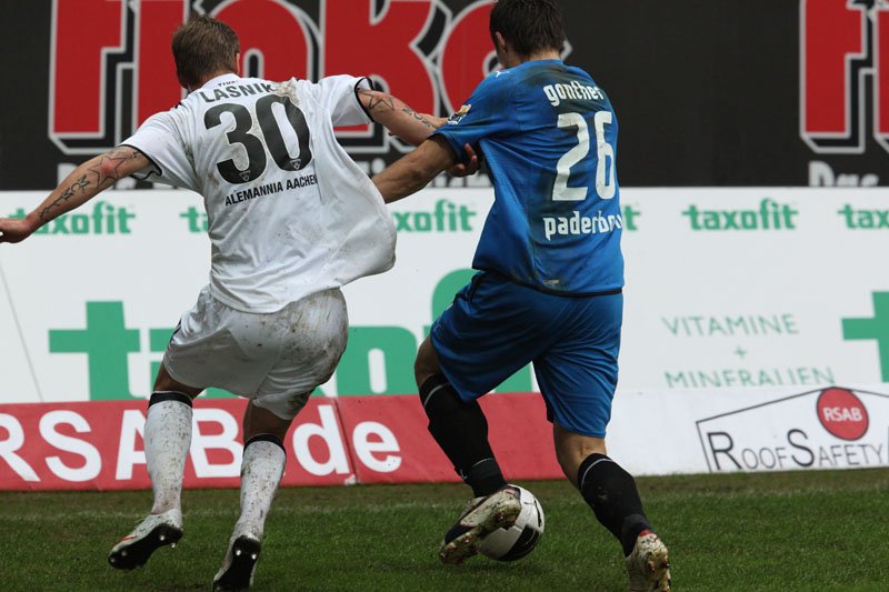 Die 9.220 Zuschauer in der Energie-Team-Arena sahen zu Beginn eine Alemannia, die richtig gut in die Partie kam. Das Team zeigte sich deutlich bissiger und zweikampfstärker als die Gastgeber. Erstmals gefährlich wurde es in der 8. Spielminute im Strafraum der Paderborner: Lasnik brachte den Ball durch einen Eckstoß von rechts vor das Tor, wo Kasper Jensen sich verschätzte und an der Kugel vorbeiflog. Thomas Stehle kam am zweiten Pfosten zum Kopfball, brachte jedoch nicht genug Druck hinter das Leder, sodass Sören Halfar auf der Linie klären konnte. Die Ostwestfalen mussten bis zur 25. Minute warten, als auch sie sich ihre erste Torchance notieren konnten. Enis Alushi versuchte es vom Strafraumeck mit einem Distanzschuss, verzog allerdings um einige Meter. Die Jungs vom Tivoli präsentierten sich gut organisiert, sodass der SC Paderborn nur selten ein Mittel fand, gegen die kompakt stehende Defensive anzukommen. 35 Minuten waren gespielt, als es die Paderborner einmal über außen versuchten. Brückner brachte den Ball von links in den Strafraum, wo Brandy mit dem Kopf an die Kugel kam. Stuckmann musste allerdings nicht eingreifen.
