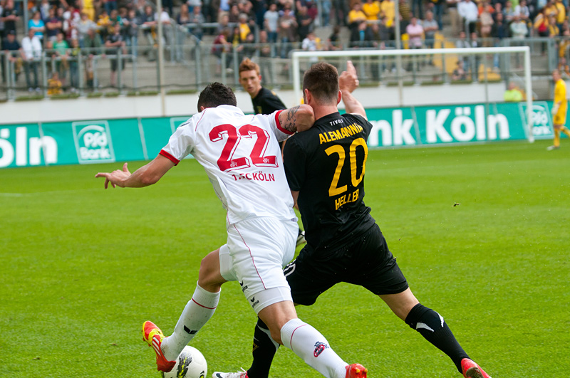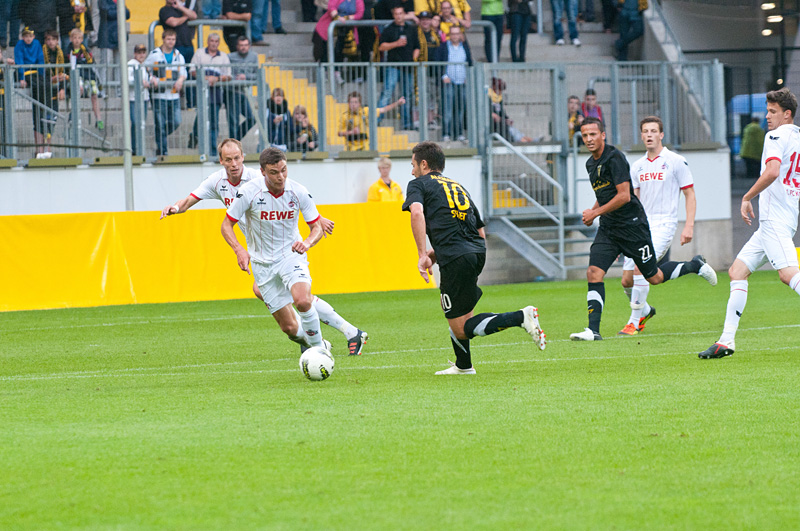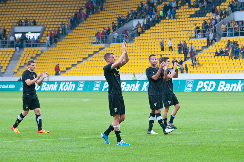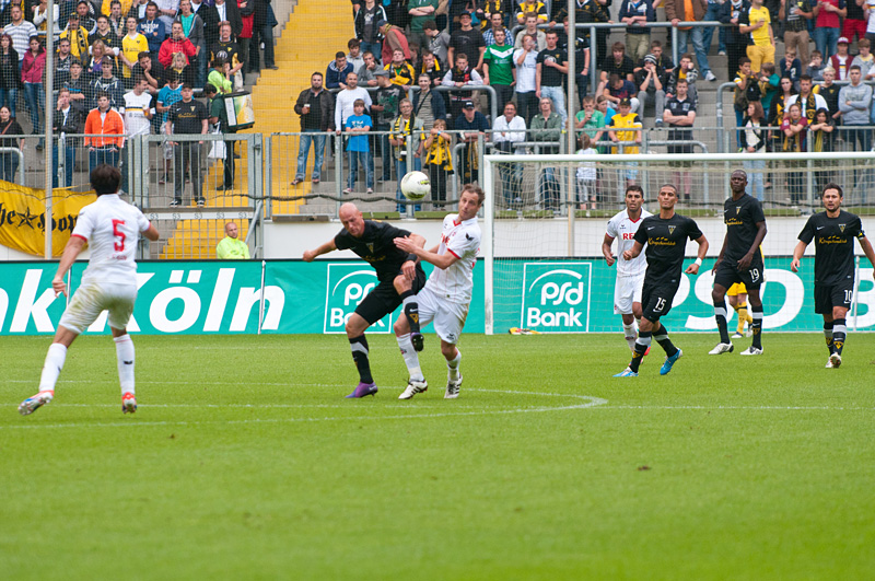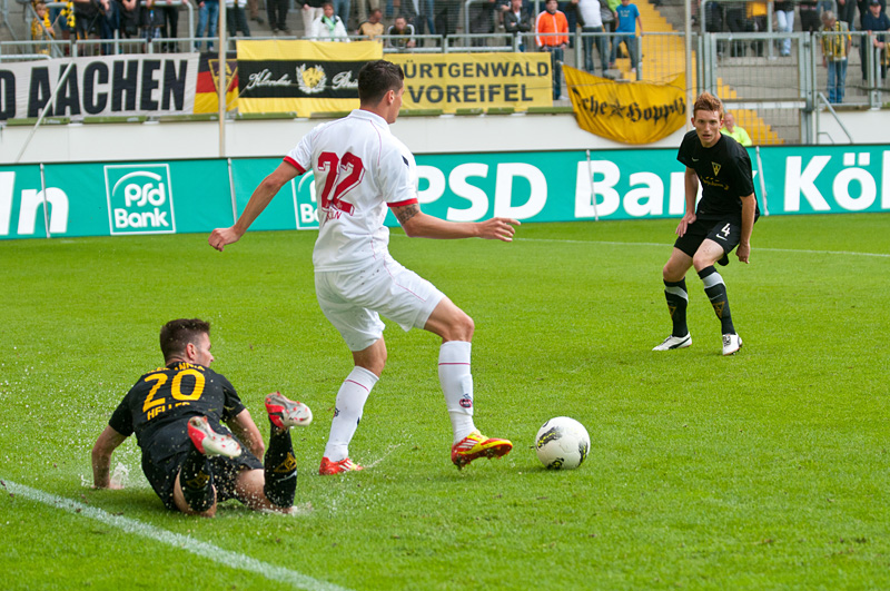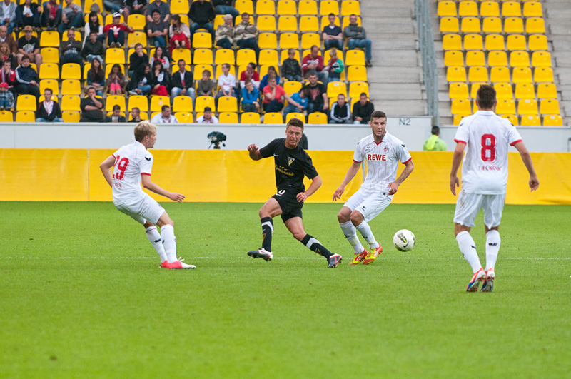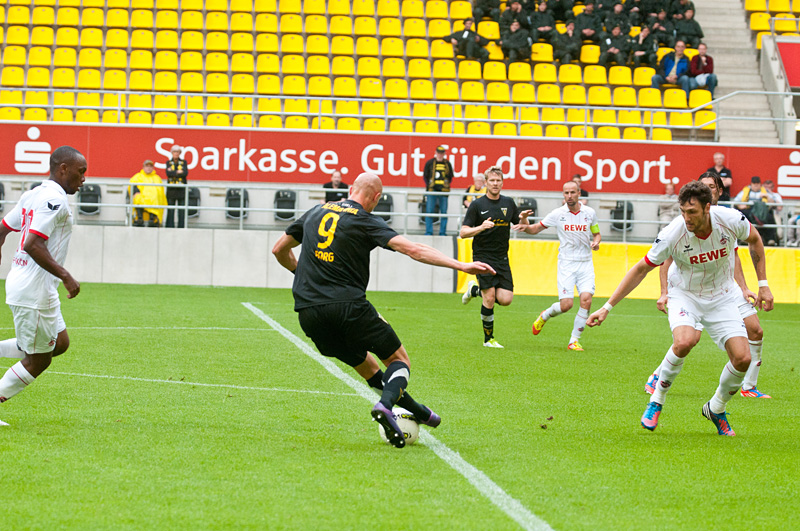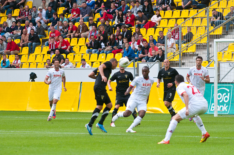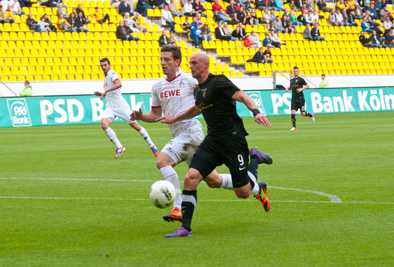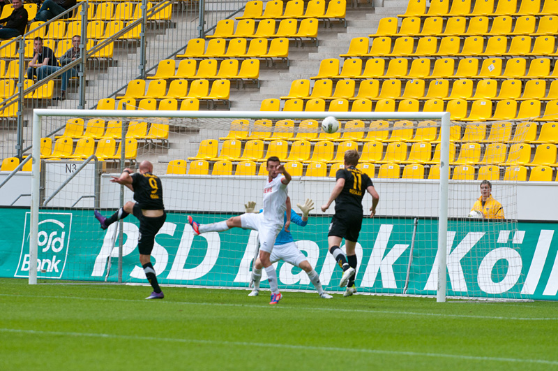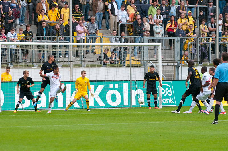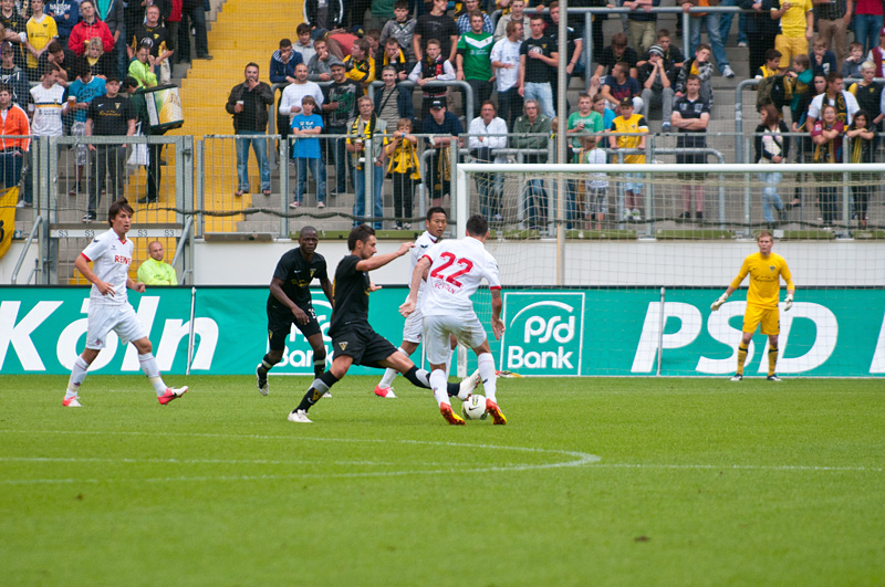 Bereits in der zweiten Minute hatten die Schwarz-Gelben die erste Torchance, doch der Schuss von Rösler prallte an Torwart Marcel Schuhen ab. Kurz darauf versuchten die Gäste aus Köln zu kontern, aber Odise Roshi schoss am Tor vorbei. Kaum hatten sich die Fans vom Angriff der Gäste erholt, sahen die Anhänger wie Kapitän Albert Streit einen Freistoß verschoss. Nur eine Minute später köpfte Marcel Heller den Ball nach einer Flanke von Kefkir ins Netz und brachte die Mannschaft von Ralf Aussem damit in Führung (4.). Doch auch der FC blieb nicht chancenlos. Mato Jajalo führte in der 11. Minute einen Eckstoß aus, der jedoch von Thomas Stehle abgewehrt werden konnte. Dieselbe Szene ereignete sich wenige Minuten später auf der anderen Seite. Doch auch die Schwarz-Gelben blieben erfolglos.