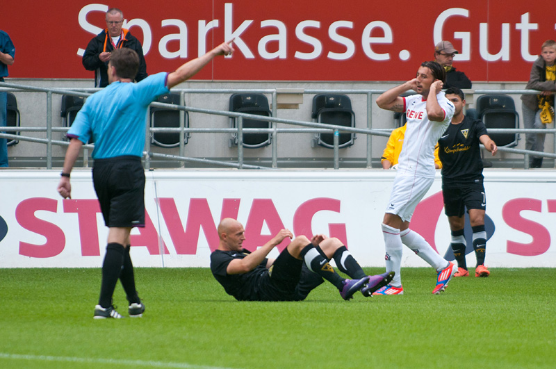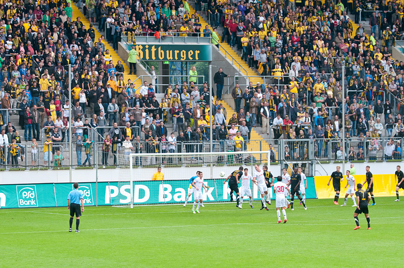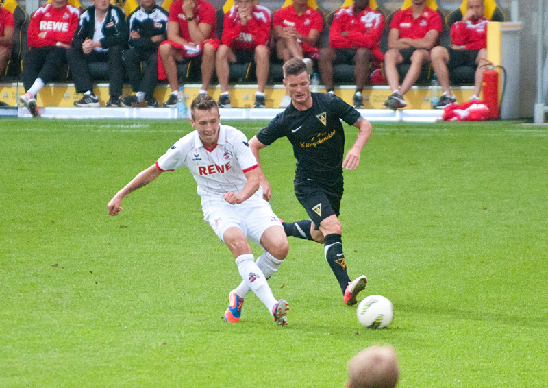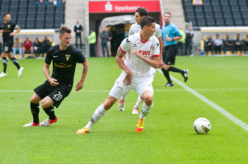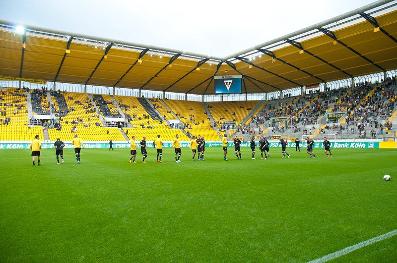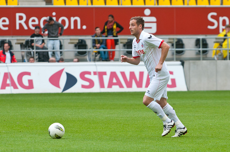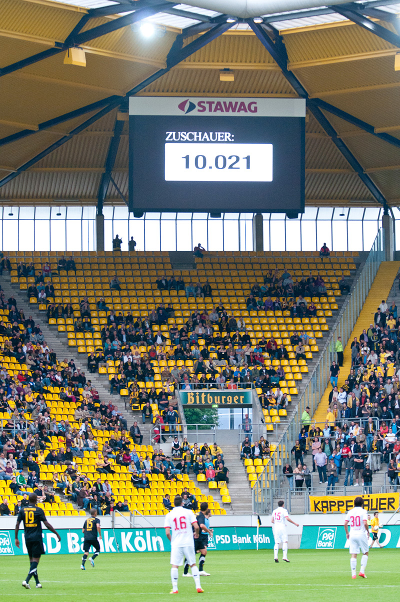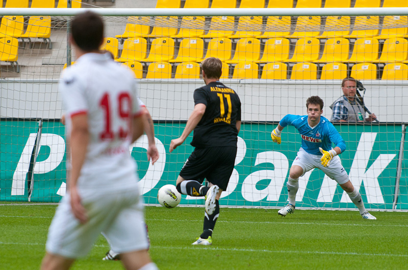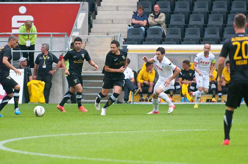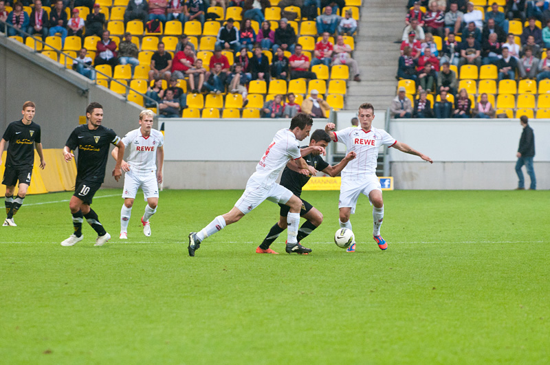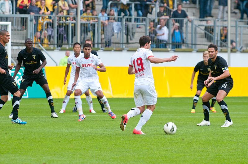 Bereits in der zweiten Minute hatten die Schwarz-Gelben die erste Torchance, doch der Schuss von Rösler prallte an Torwart Marcel Schuhen ab. Kurz darauf versuchten die Gäste aus Köln zu kontern, aber Odise Roshi schoss am Tor vorbei. Kaum hatten sich die Fans vom Angriff der Gäste erholt, sahen die Anhänger wie Kapitän Albert Streit einen Freistoß verschoss. Nur eine Minute später köpfte Marcel Heller den Ball nach einer Flanke von Kefkir ins Netz und brachte die Mannschaft von Ralf Aussem damit in Führung (4.). Doch auch der FC blieb nicht chancenlos. Mato Jajalo führte in der 11. Minute einen Eckstoß aus, der jedoch von Thomas Stehle abgewehrt werden konnte. Dieselbe Szene ereignete sich wenige Minuten später auf der anderen Seite. Doch auch die Schwarz-Gelben blieben erfolglos.