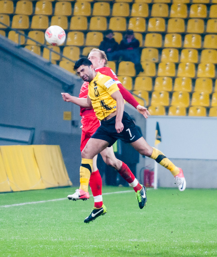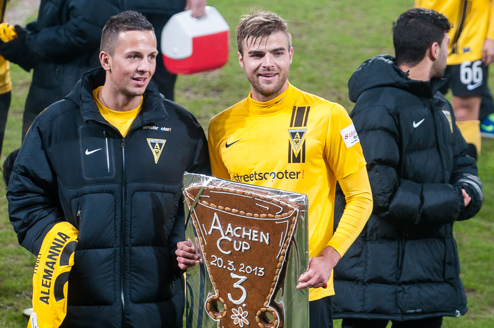 Im ersten Spiel des Abends traf die Alemannia auf Fortuna Düsseldorf. René van Eck schickte dabei nahezu eine reine Eigengewächstruppe ins Rennen. Mit Ausnahme von Kapitän Sascha Herröder und Oguzhan Kefkir waren alle Akteure zuvor in der U23 bzw. U19 am Tivoli aktiv. Die Kicker aus der Landeshauptstadt übernahmen von Beginn an die Initiative, doch die junge Aachener Elf hielt wacker dagegen. Krumpen rettete bereits nach fünf Minuten gegen Genki erstmals stark. Die zweite Möglichkeit nutzte die Fortuna durch einen verdeckten Schuss von Voronin eiskalt zur Führung (18.). Ein Kefkir-Freistoß aus 22 Metern sorgte anschließend erstmals für Gefahr vor dem Gehäuse des Bundesligisten (21.). Dann hielt Krumpen seine Elf mit Paraden gegen Garbuschewski und Genki (22., 23.) im Spiel. Die spektakulärste Szene folgte nach einer halben Stunde. Sowohl ein Freistoß von Paurevic als auch der anschließende Nachschuss von Ilsö prallten gegen die Querlatte, bevor Krumpen den dritten Versuch durch Genki sicher unter Kontrolle hatte. Die Schwarz-Gelben wurden in der letzten Viertelstunde mutiger und verpassten den Ausgleich mehrfach nur knapp. Einen Schlenzer von Garcia konnte Fortuna-Keeper Papadopoulos noch um den langen Pfosten lenken und die anschließende Ecke köpfte Herröder nur knapp daneben (32.). Drei Minuten später rettete Papadopoulos seiner Elf bei einem platzierten Schuss von Schumacher den Sieg. Im anschließenden Elfmeterschießen (5:4) sicherten sich die Tivoli-Kicker immerhin noch einen Trostpunkt. Kefkir (2), Leipertz (2) und Pozder verwandelten jeweils sicher und Krumpen parierte den zweiten Versuch von Garbuschwski.