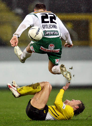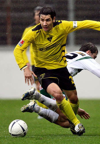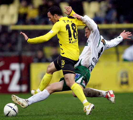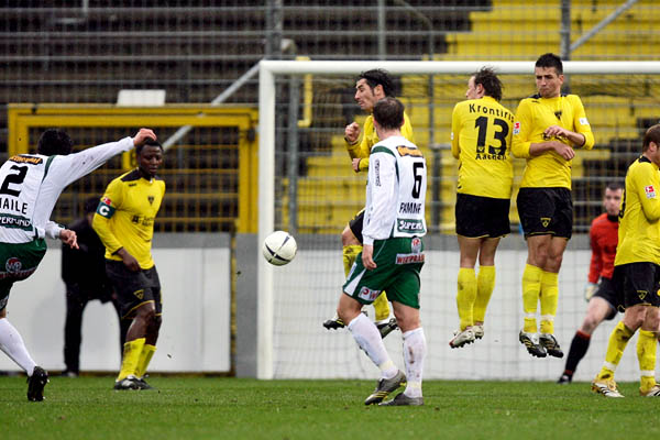 Und die Aachener blieben am Drücker: Krontiris passte geschickt auf Ibisevic. Der Schuss des Torschützen wurde allerdings in höchster Not von den Österreichern geblockt (15.). Das Wetter wurde zunehmend schlechter, jedoch änderte das nichts an der Überlegenheit der Schwarz-Gelben. Und so fiel in der 20. Minute auch der verdiente Führungstreffer. Dabei handelte es sich nahezu um die Kopie des Treffers von Laurentiu Reghecampf, der ihm den Titel „Tor des Monats“ im Dezember bescherte. Halblinke Freistoßposition, 18 Meter. Mit der gleichen Perfektion wie gegen die Bayern schlug auch diesmal das Leder unhaltbar direkt neben dem Pfosten ein. In der Folgezeit verfehlte Ibisevic (24.), der Aktivposten im Sturm der Aachener, sowie Fiel mit einem schönen Volleyschuss (30.) nur knapp das Tor der Paschinger.