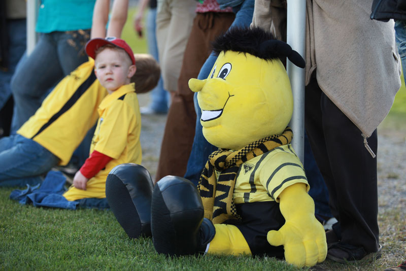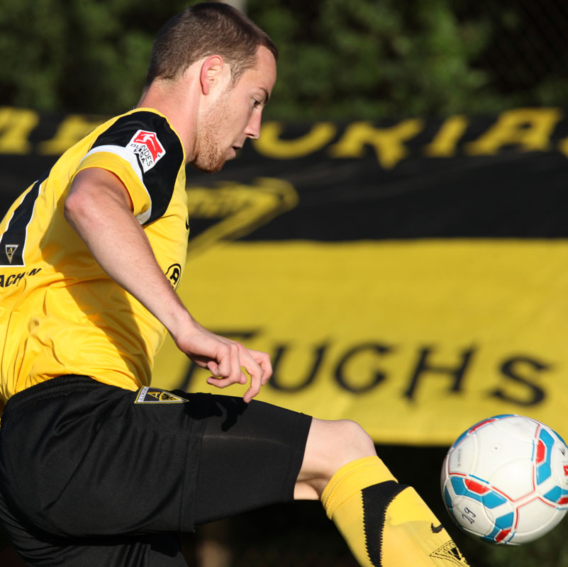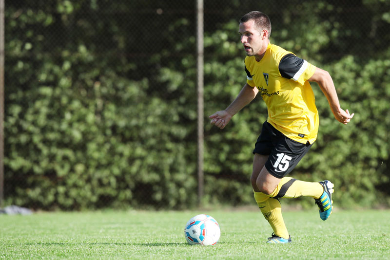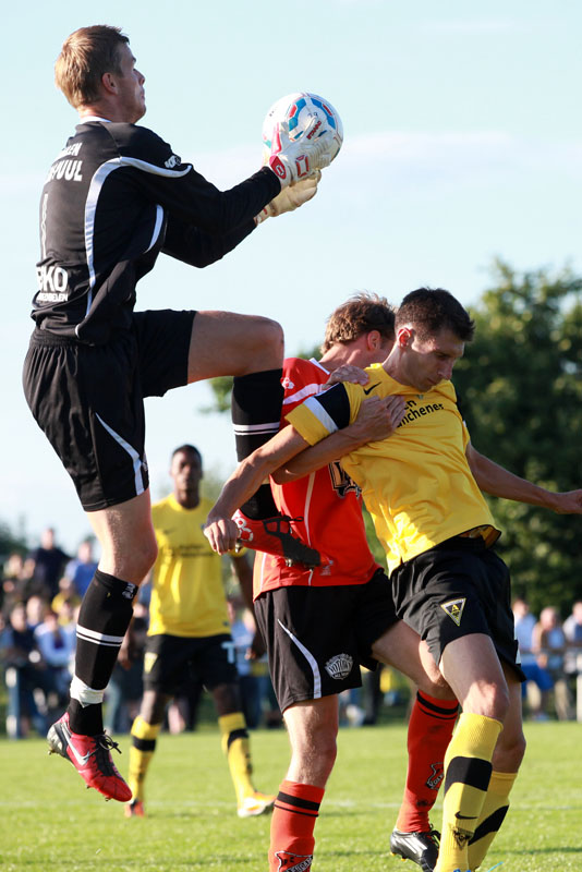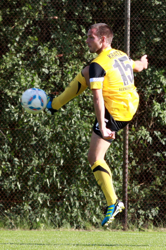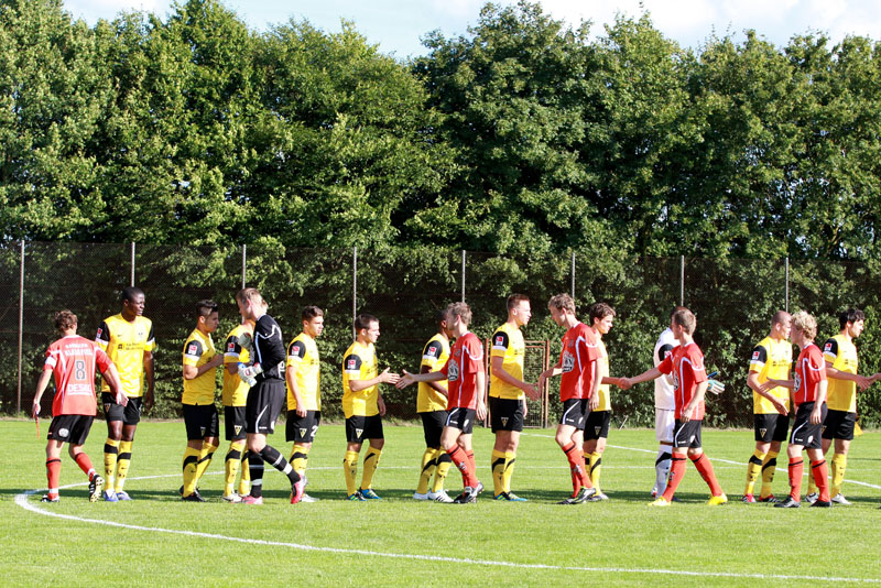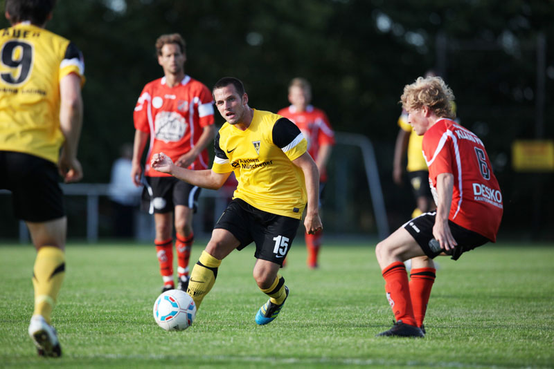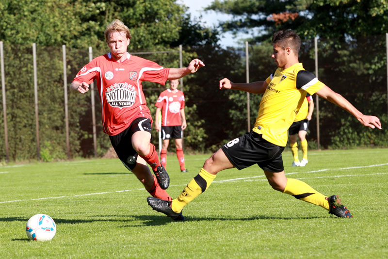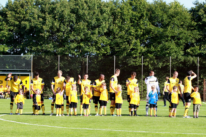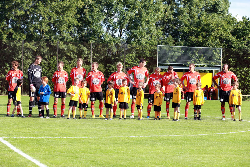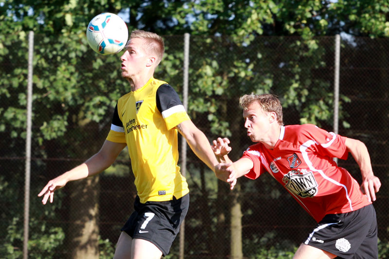 In der 23. Minute dann die verdiente Führung für die Hyballa-Elf: Eine Ecke von Kevin Kratz köpfte Benny Auer in die Maschen – das Standard-Training am Vormittag hatte sich ausgezahlt. Nach zwei guten Kratz-Schüssen setzte Stiepermann das Leder an den Pfosten (40.). Kurz vor der Pause nahm die Dortmunder Leihgabe eine Flanke geschickt an und wurde dann gefoult – Elfmeter. Auer trat an, sein zu zentral platzierter Schuss wurde von Ruiter pariert (45.).