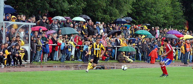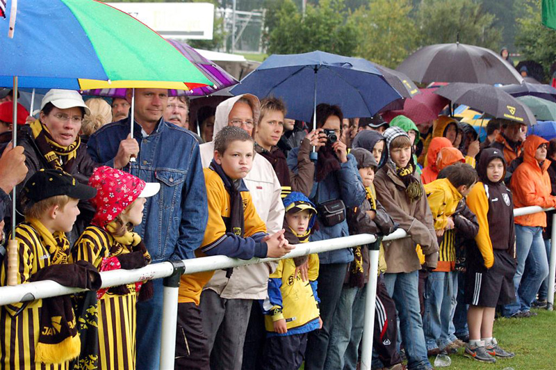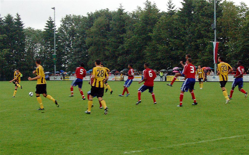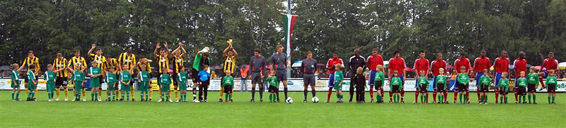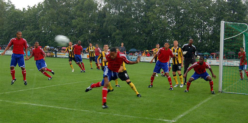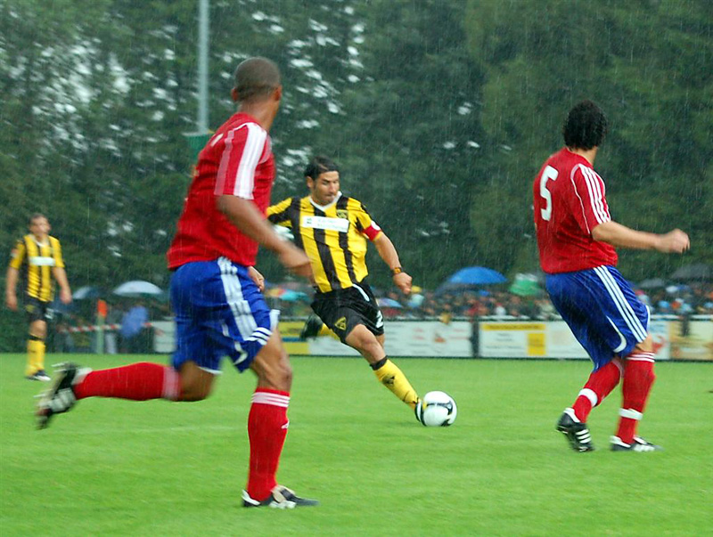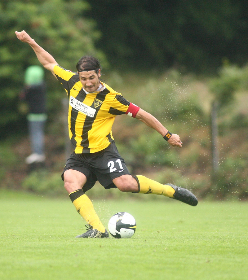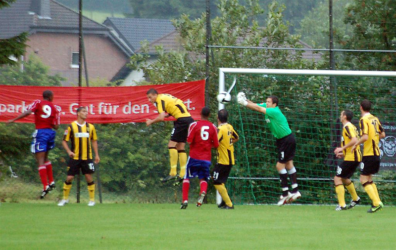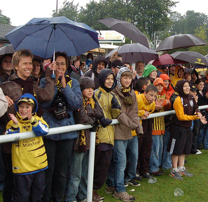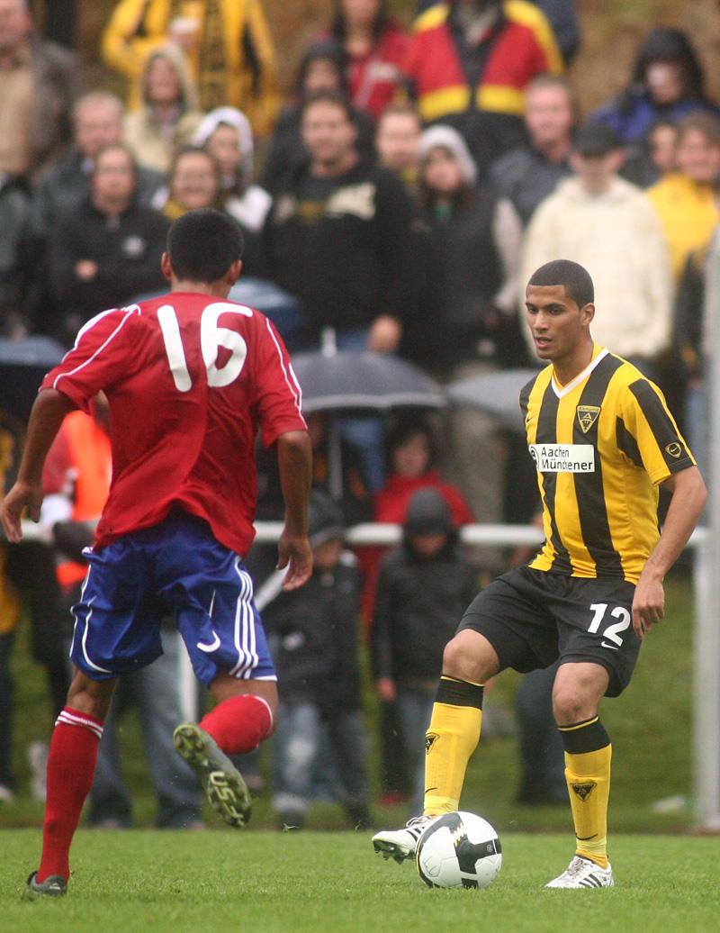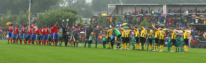 Zu den guten Rahmenbedingungen zählten nur die hervorragende Platzanlage des TuS Mützenich sowie die gut 2500 gut gelaunten Zuschauer. Das Wetter gab seinen Teil nicht dazu und so regnete es bereits vor der Partie in Strömen. Bevor der Pfiff des Schiedsrichters ertönte, wurde, wie es sich für eine Nationalmannschaft gehört, die kubanische Hymne gespielt. Danach ging es dann auch gleich los und es war schnell zu erkennen, welche Mannschaft die größeren Spielanteile besitzen sollte. Die Alemannia drängte die Jungs aus Kuba gleich in ihre eigene Hälfte und so gab es nach sieben Minuten die erste Torchance der Schwarz-Gelben. Einen Freistoß aus 20 Metern legte Achenbach ab auf Milchraum, der das Tor nur um wenige Meter verfehlte. Nur fünf Minuten später gingen die Schwarz-Gelben in Führung. Nach einer Ecke von Achenbach konnte der kubanische Torhüter den Ball nur aus dem Strafraum fausten, wo Neuzugang Thorsten Burkhardt den Ball nach kurzer Annahme flach ins rechte untere Eck platzierte (12.) Aus der ersten Ecke der Kubaner entstand in der 22. Minute die nächste Gelegenheit der Alemannia. Über einen schnellen Konter über Daun und Burkhardt bekam Abdul Özgen die Kugel am 16er und zögerte nicht lange, verfehlte das gegnerische Gehäuse jedoch knapp. Bis auf einen eher harmlosen Freistoß der Kubaner passierte nicht mehr viel und so gingen beide Mannschaften beim Stand von 1:0 für die Alemannia in die Kabine.