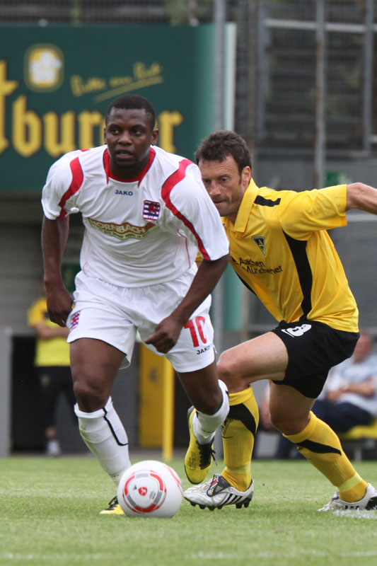 Seyi Olajengbesi hat beim 2:0 (0:0) der Alemannia gegen die luxemburgische Nationalmannschaft sein Comeback gefeiert. Nach seinem Syndesmosebandriss stand der Nigerianer erstmals wieder für 45 Minuten auf dem Feld. Über 3000 Zuschauer auf der fast komplett gefüllten Haupttribüne des alten Tivoli sahen überlegene Schwarz-Gelbe, die aber erst nach der Pause zu klaren Gelegenheiten kamen.