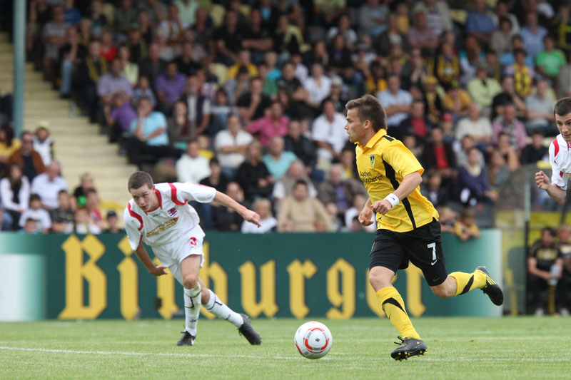 Auf Seiten der Alemannia war der belgische Gastspieler Jeremy Huyghebaert von Beginn an links hinten in der Viererkette im Einsatz. Marco Höger, Tolgay Arslan, Manuel Junglas und Timo Achenbach wurden geschont. Für Benny Auer und Thorsten Stuckmann kam ein Einsatz noch zu früh. Beim Team Luxemburg agierte Kevin Malget, Abwehrspieler von Alemannia Aachen II, als Innenverteidiger. Ihre Feldüberlegenheit konnten die Alemannen lange Zeit nicht in Torchancen ummünzen. Eine stark getretener Freistoß von Aimen Demai klatschte in der 38. Minute an die Unterkante der Latte. Den Abpraller setzte Henrik Ojamaa über den Kasten. Stefan Wanneck, „Leihgabe“ aus der Zweiten Mannschaft, scheiterte wenig später mit einer Doppelchance an Keeper Jonathan Jubert.