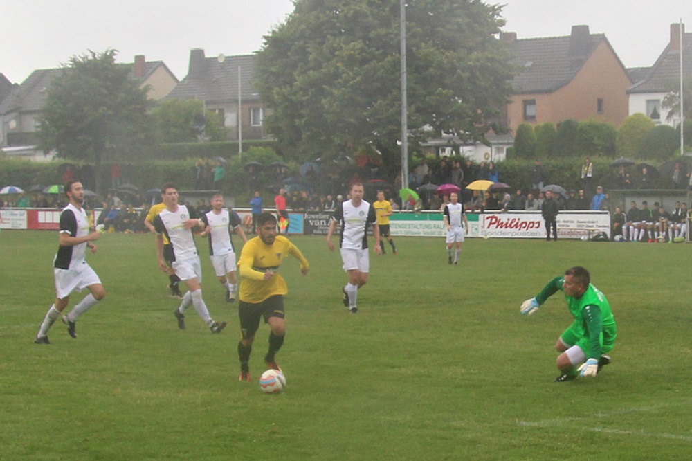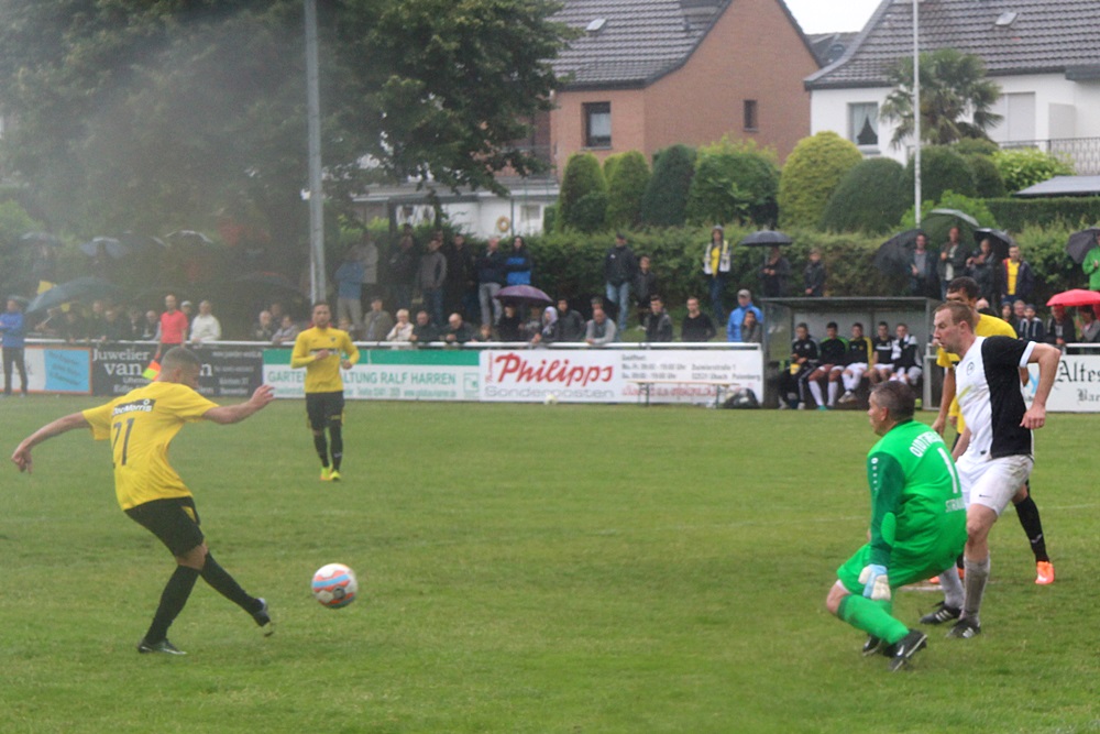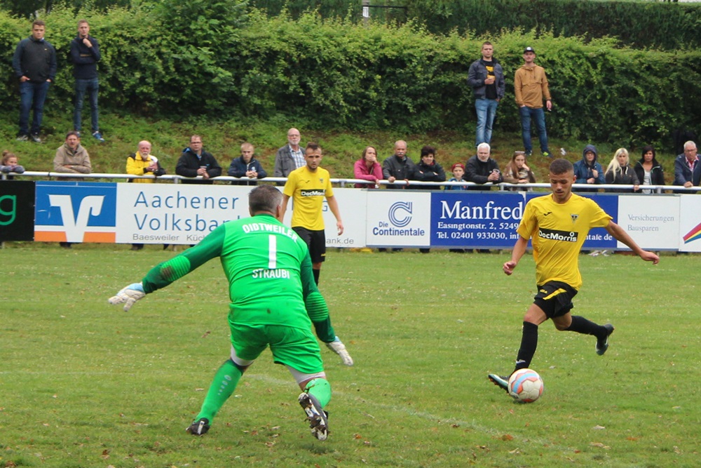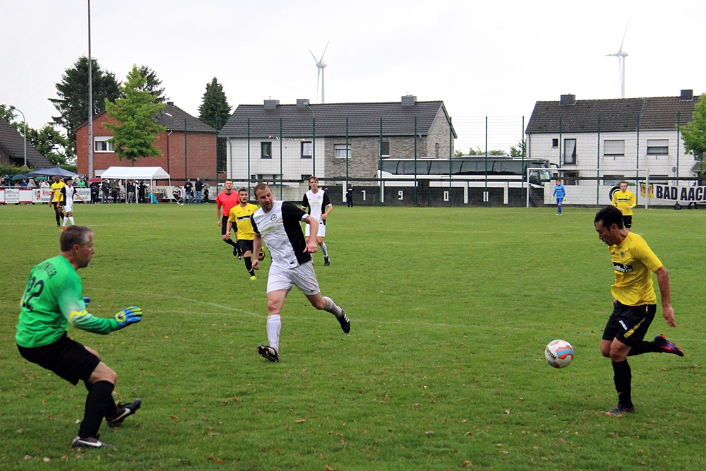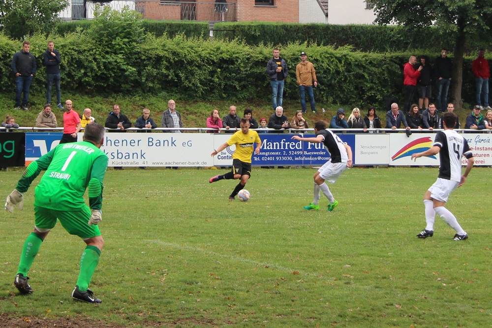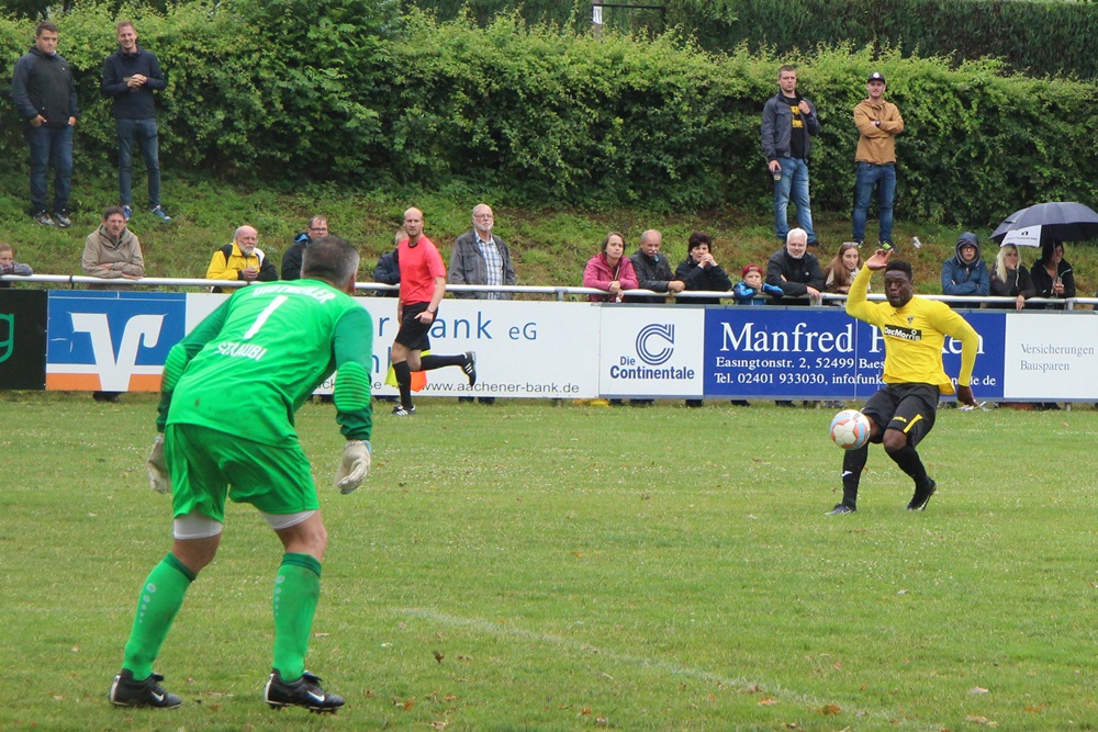 Bei den Gastgebern stand mit dem inzwischen 46-jährigen Stephan Straub 70 Minuten lang ein alter Bekannter aus Aachener Bundesligazeiten zwischen den Pfosten. Nach 18 Minuten hatte der Schlussmann zum ersten Mal das Nachsehen. Konate-Lueken spielte einen langen Ball hinter die Abwehrreihe, der quirlige Nebi passte nach innen zu Hammel, der aus kurzer Distanz zum 0:1 vollendete. Nur vier Minuten später zappelte die Kugel erneut im Netz. Eine Rechtsecke von Kühnel wuchtete Heinze per Kopf zum 0:2 in die Maschen (22.). Nach Doppelpass mit Pütz baute Azaouaghi das Ergebnis noch vor der Pause auf 0:3 aus (35.).