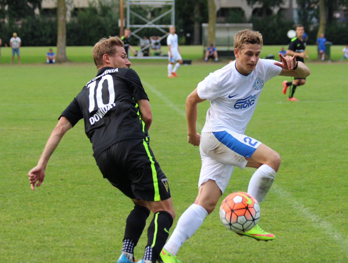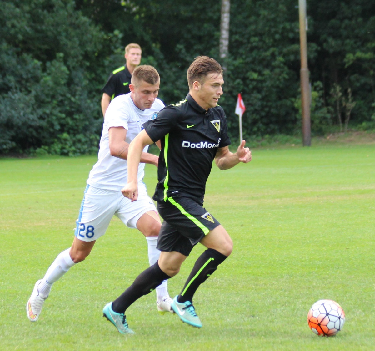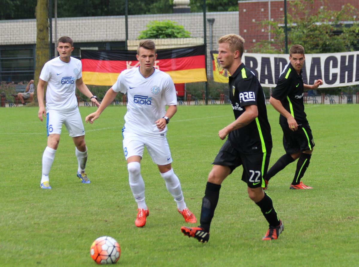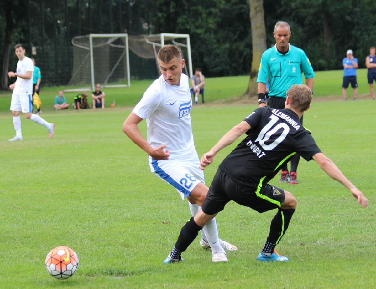 Die Ukrainer, die bereits in 14 Tagen in die Meisterschaft starten, warteten mit einer durchaus ernstzunehmenden Truppe auf. Sechs Akteure, die im Finale von Warschau in der Startformation gestanden hatten, begannen auch heute. Zwei eingewechselte Akteure, zwei Kaderspieler sowie ein Neuzugang komplettierten die renomierte Elf. Die ersten Offensivaktionen gehörten allerdings dem Underdog aus der deutschen Regionalliga. Rüter setzte zu einem Solo an, legte die Kugel für Maier ab, dessen Schuss abgeblockt werden konnte (16.). Nach 23 Minuten zielte Graudenz von der Strafraumgrenze etwas zu hoch. Es folgte eine Trinkpause, in der Dnipro-Coach Markevyvh anscheinend deutlich deutliche Worte wählte. Bezus tauchte plötzlich frei vor Löhe auf, doch der Aachener Keeper meisterte das 1:1-Duell stark (31.). Dann tankte sich Selezynow in den Strafraum, doch die Aachener Abwehr klärte mit vereinten Kräften (33.). Die stärkste Phase des Gegners endete mit einer Kopfball-Bogenlampe von Matheus, die sich auf der Querlatte niedersenkte (36.). Kurz vor dem Seitenwechsel kamen auch die Alemannen noch zu einer guten Gelegenheit. Eine Kombination über Dowidat und Rüter schloss Gödde mit einem Schuss aus zwölf Metern ab, den Dnipro-Keeper Lastuvka jedoch parieren konnte (44.). Torlos wurden die Seiten gewechselt.