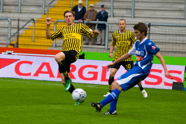 Die erste aufregende Szene bot sich den Zuschauern in der 8. Minute. Bosnjak erlief einen Rückpass von Cristian Fiel und prallte an der Strafraumgrenze mit Thorsten Stuckmann zusammen. Schiedsrichter Karim Saadoumi ließ richtigerweise weiterlaufen. Nach 14 Minuten bot sich Innenverteidiger Caillet die beste Chance für die Gastgeber, doch er schob das Leder aus acht Metern knapp rechts am Tor vorbei. Es entwickelte sich eine aggressive Partie mit viel Feuer. Polenz und Hubert sahen jeweils früh die Gelbe Karte. Ein zu zögerlich abschließender Andi Lasnik, Markus Daun per Kopf und ein Drehschuss von Benny Auer - das waren die Aachener (Halb-)Chancen bis zur Pause. Auf der anderen Seite rettete Stuckmann per Faustabwehr gegen einen Schuss von Bosnjak (38.).