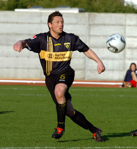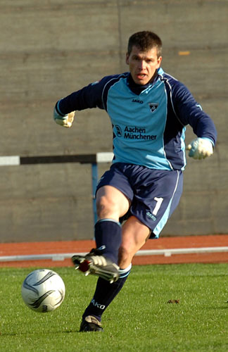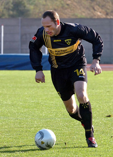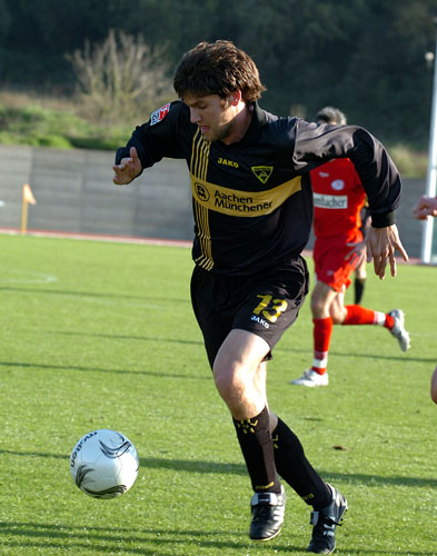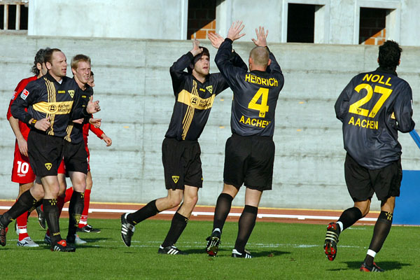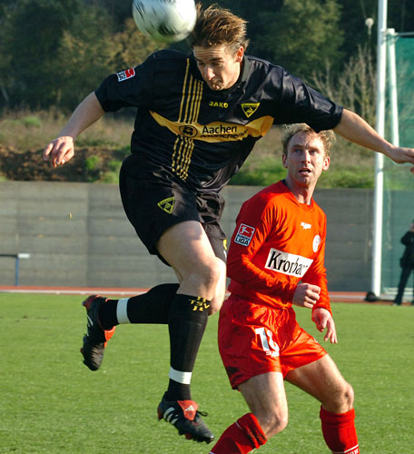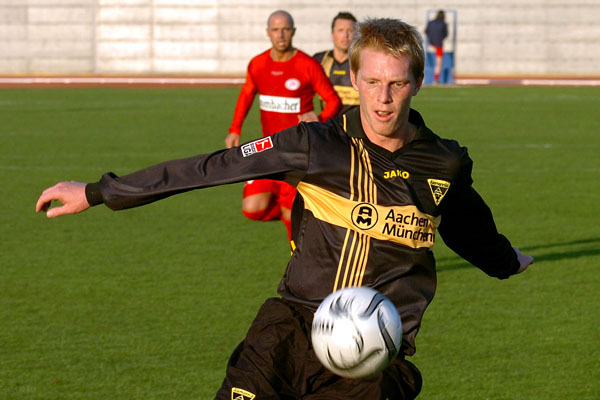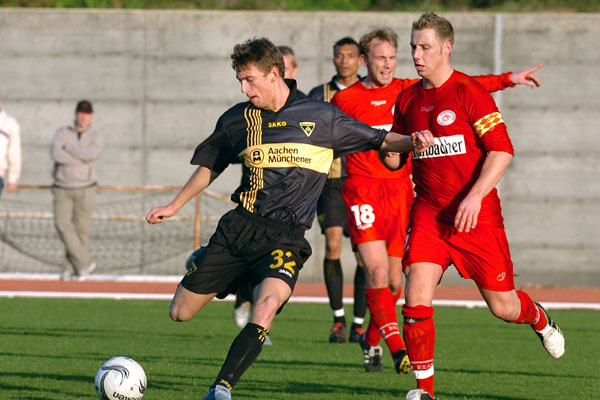 Die Aachener Führung entsprang nach einer halben Stunde einem feinen Angriff, an dessen Ende der Ball bei Willi Landgraf landete. Der Rechtsverteidiger zog die Flanke über die gesamte Abwehr. Florian Bruns stand parat und jagte den Ball aus sieben Metern volley ins Tor (30.). Der Torschütze betätigte sich auch als Vorbereiter und steckte schon für Balaban durch, der Amateur traf aber leider nur die breite Brust von Masic. Kurz vor der Pause verzog wiederum Bruns nur knapp.