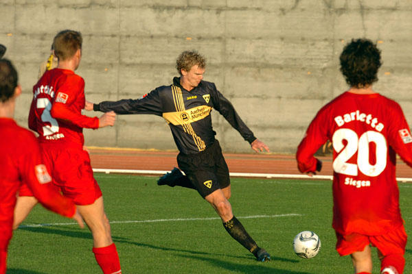 Der Holländer feuerte aus halblinker Position auch den ersten Schuss auf das Tor von Masic ab. Der Hüne im Siegener Tor war auf dem Posten. Matze Heidrich setzte einen Knaller aus 22 Metern knapp über den Kasten, Yunus Balaban traf nur das Außennetz. Auf der anderen Seite verzog Sven Lintjens zweimal knapp.