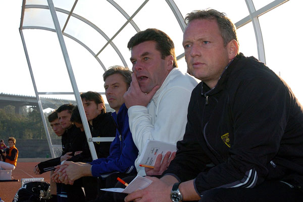 Der Coach hatte eine völlig neue Mannschaft auf den gut gepflegten Platz geschickt, auf dem schon die Schweizer während der EM in Portugal trainiert hatten. Vor Stephan Straub stand die Viererkette mit Landgraf, Stehle, Rauw und Debütant Dum. Matze Heidrich spielte zentral im Mittelfeld, flankiert von Balaban und Noll. Florian Bruns durfte sich hinter den Spitzen austoben und genoss die Rolle sichtlich. Im Sturm begannen Koen und Ebbers.