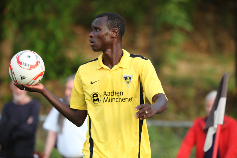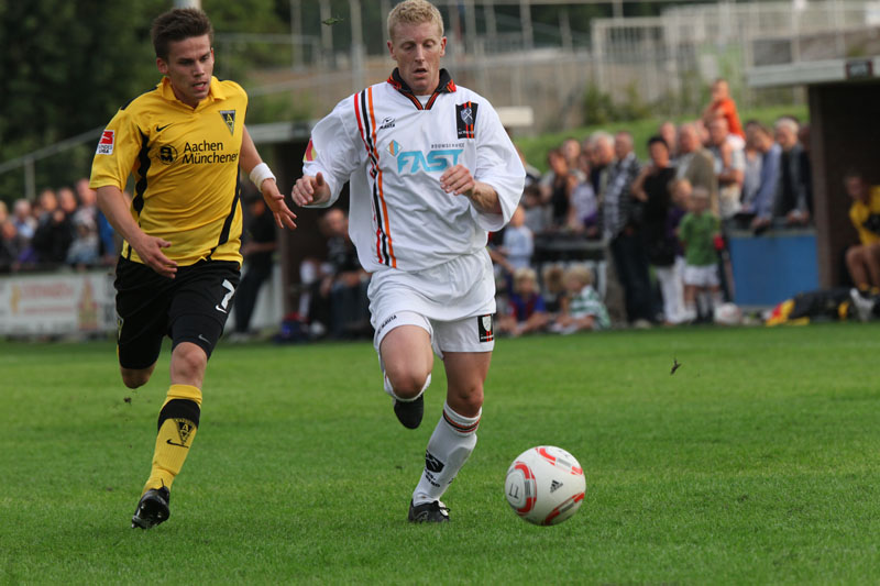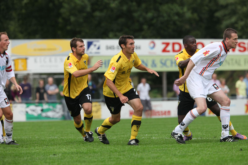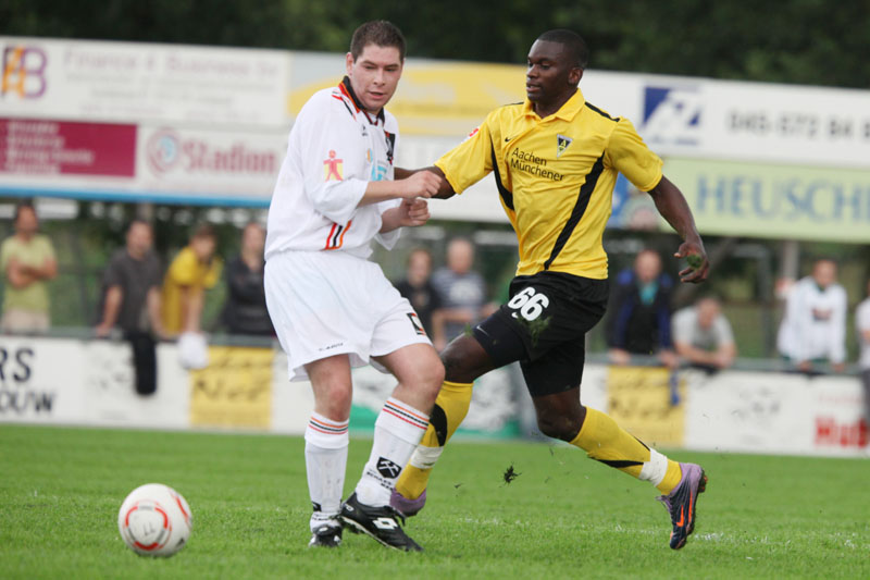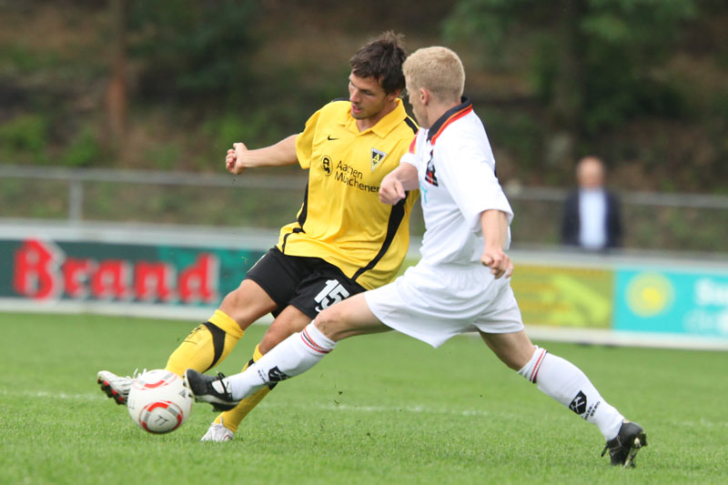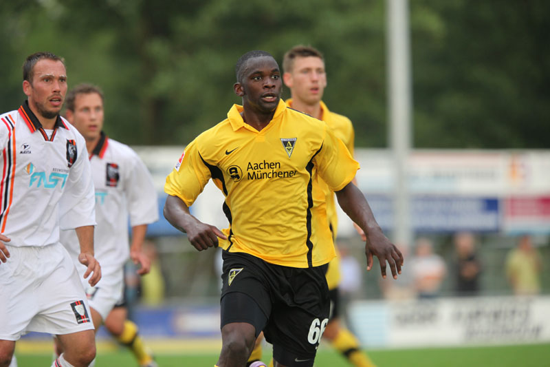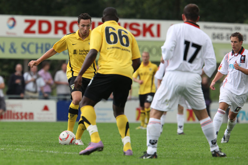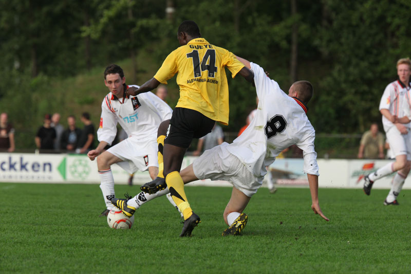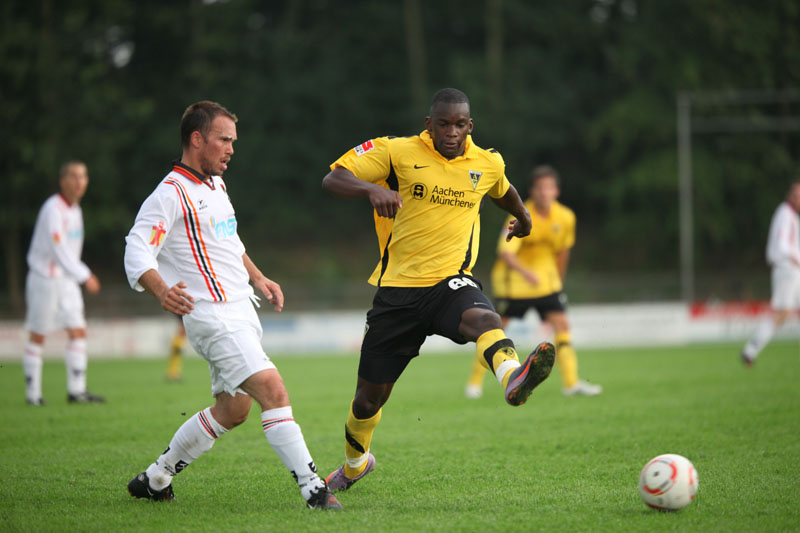 Im ersten Test nach dem Trainingslager verlief das Spiel wie so oft in solchen Duellen: Alemannia erhielt überdurchschnittlich viel Ballbesitz, der Fünftligist stand tief in der Defensive. Zweimal Höger, und Tsoumou zielten in der Anfangsphase zu ungenau. In der 12. Minute scheiterte der Gastspieler frei vor dem Keeper an dessen Fußabwehr. Acht Minuten später machte es der junge Angreifer besser und erzielte mit einem Seitfallzieher die Aachener Führung (20.). Ojamaa „klaute“ kurz darauf den Ball, überlegte auf dem Weg zum Tor aber zu lange und ließ sich abdrängen. Das Leder lief gefällig durch die Reihen der Alemannia, in mancher Szene fehlte die Entschlossenheit beim Abschluss. Humorlos erledigte Tsoumou dann aber die Aufgabe als „Abstauber“ im Fünfmeterraum, als er die 2:0-Pausenführung besorgte (39.).